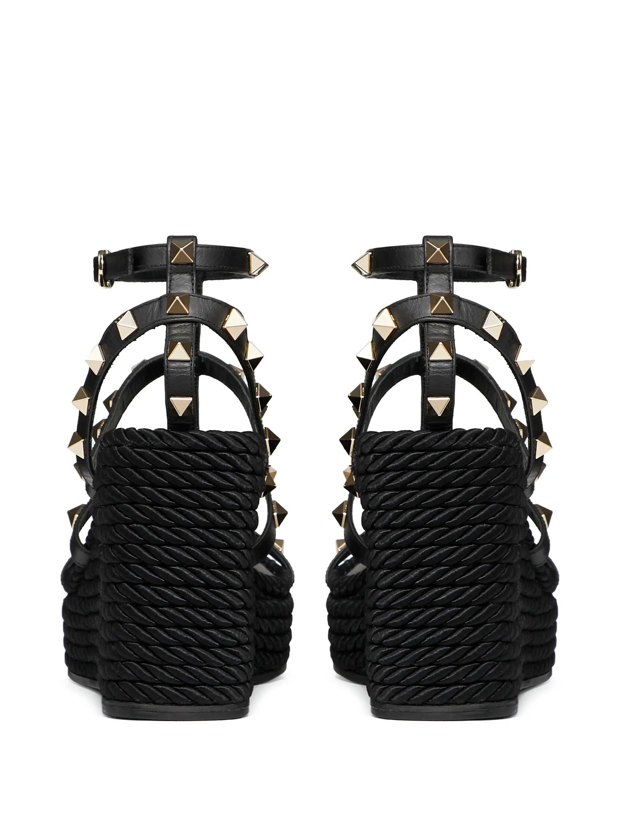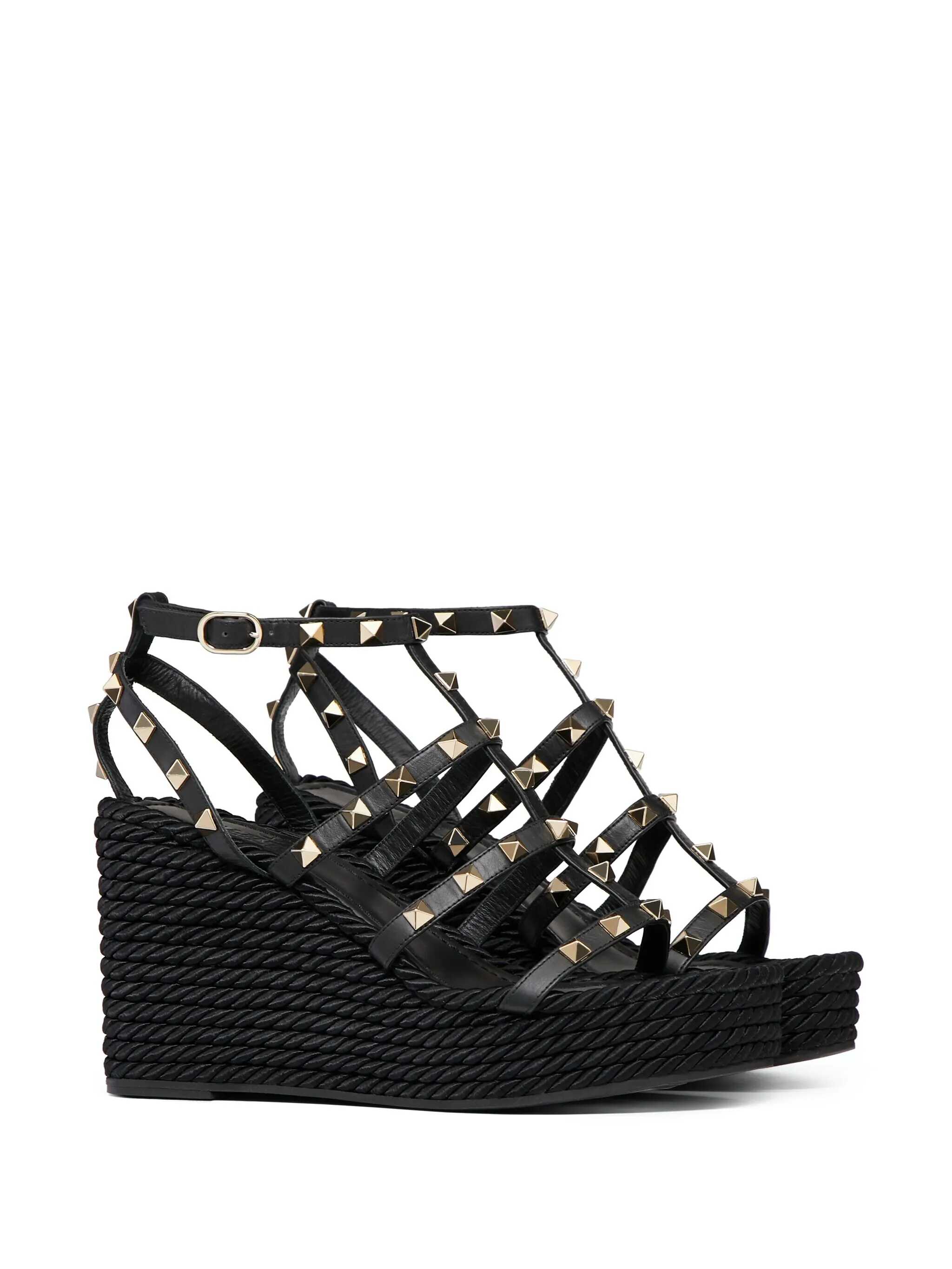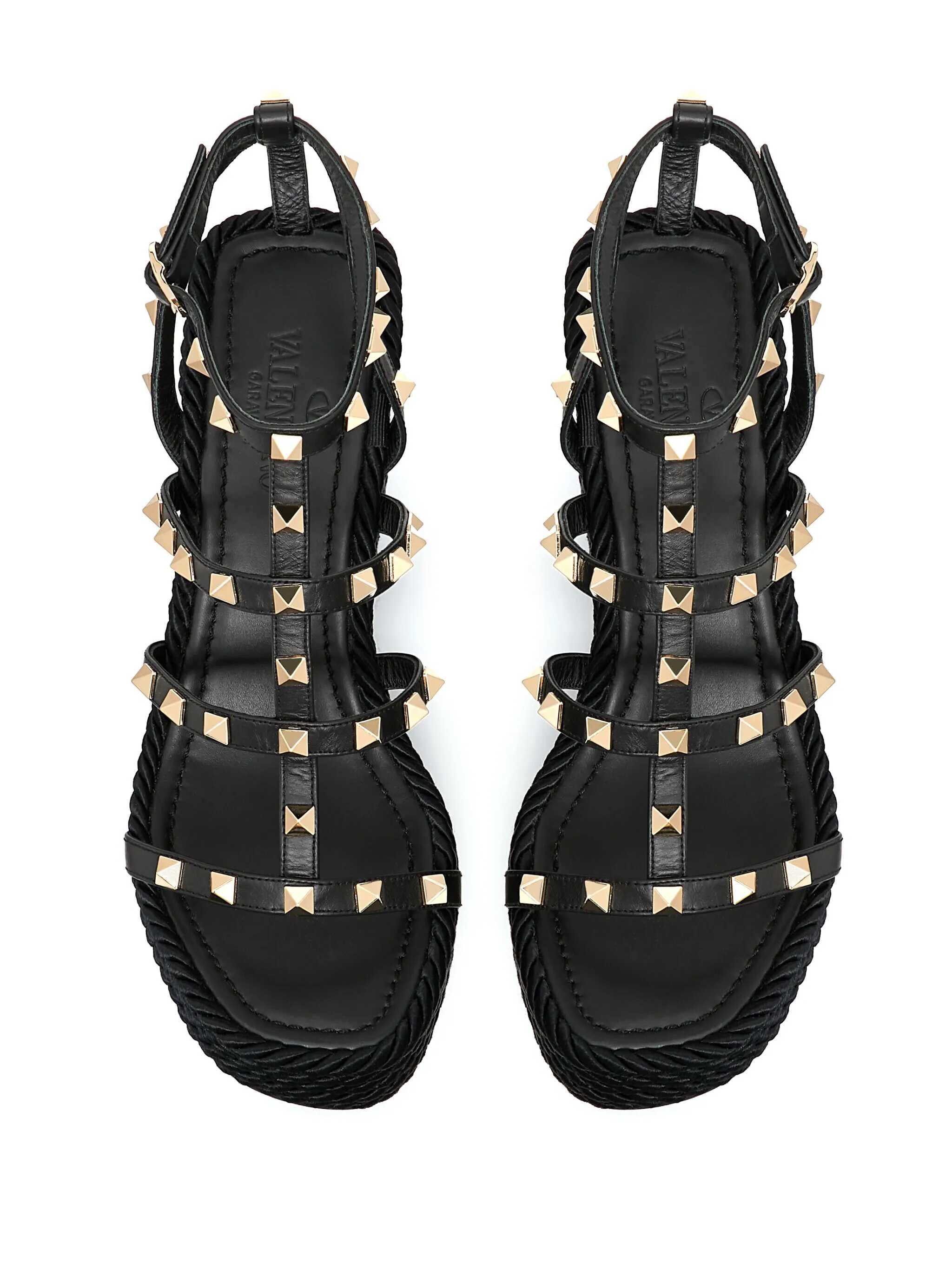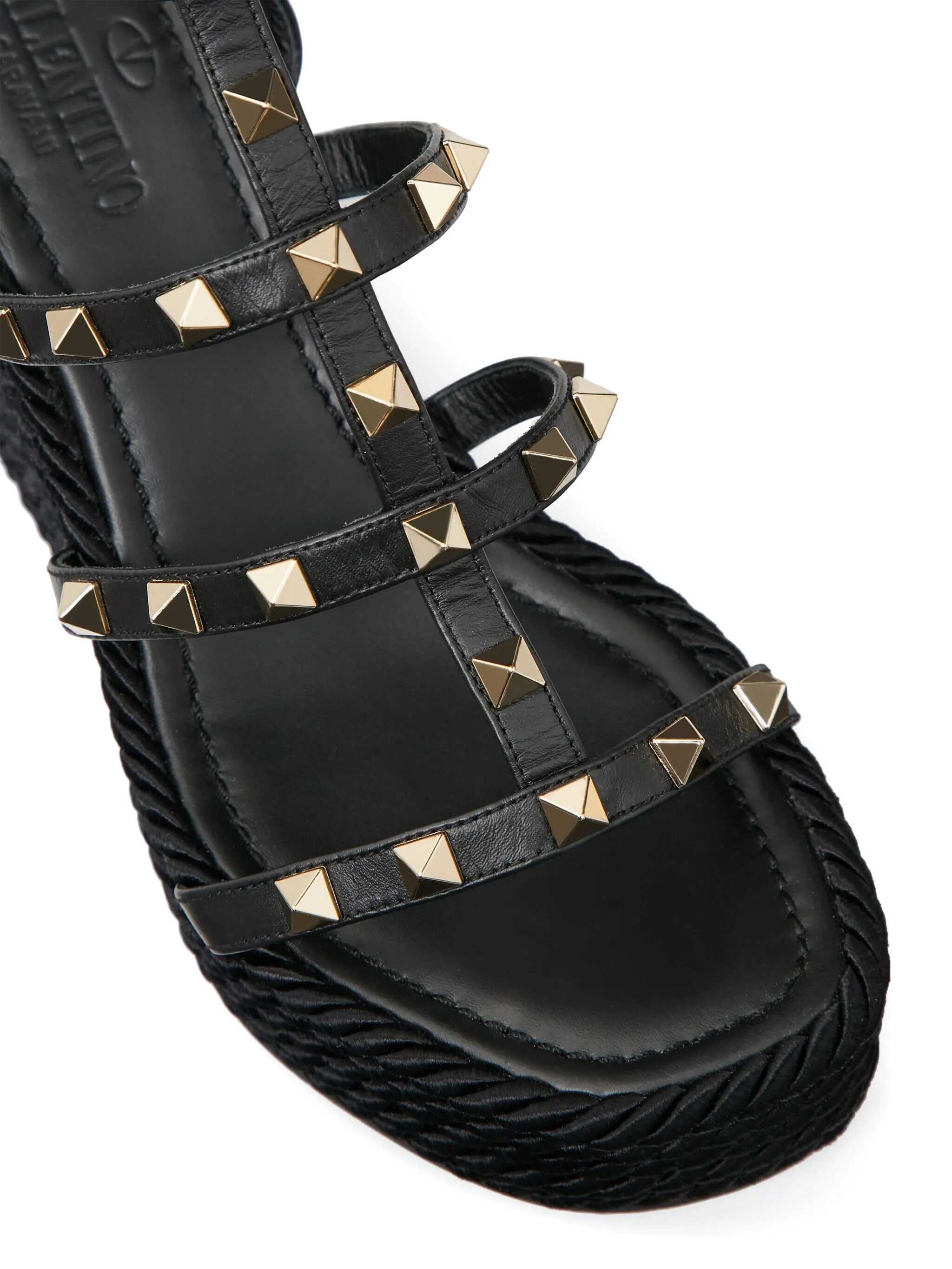 Valentino Garavani Pink Wedged Sandals, Rockstud Model, Leather Upper And Rubber Sole, Adjustable Buckle Closure, Gold Studs, Rafia Platform, Heel: 9,5 cm Plateau: 2,5 cm