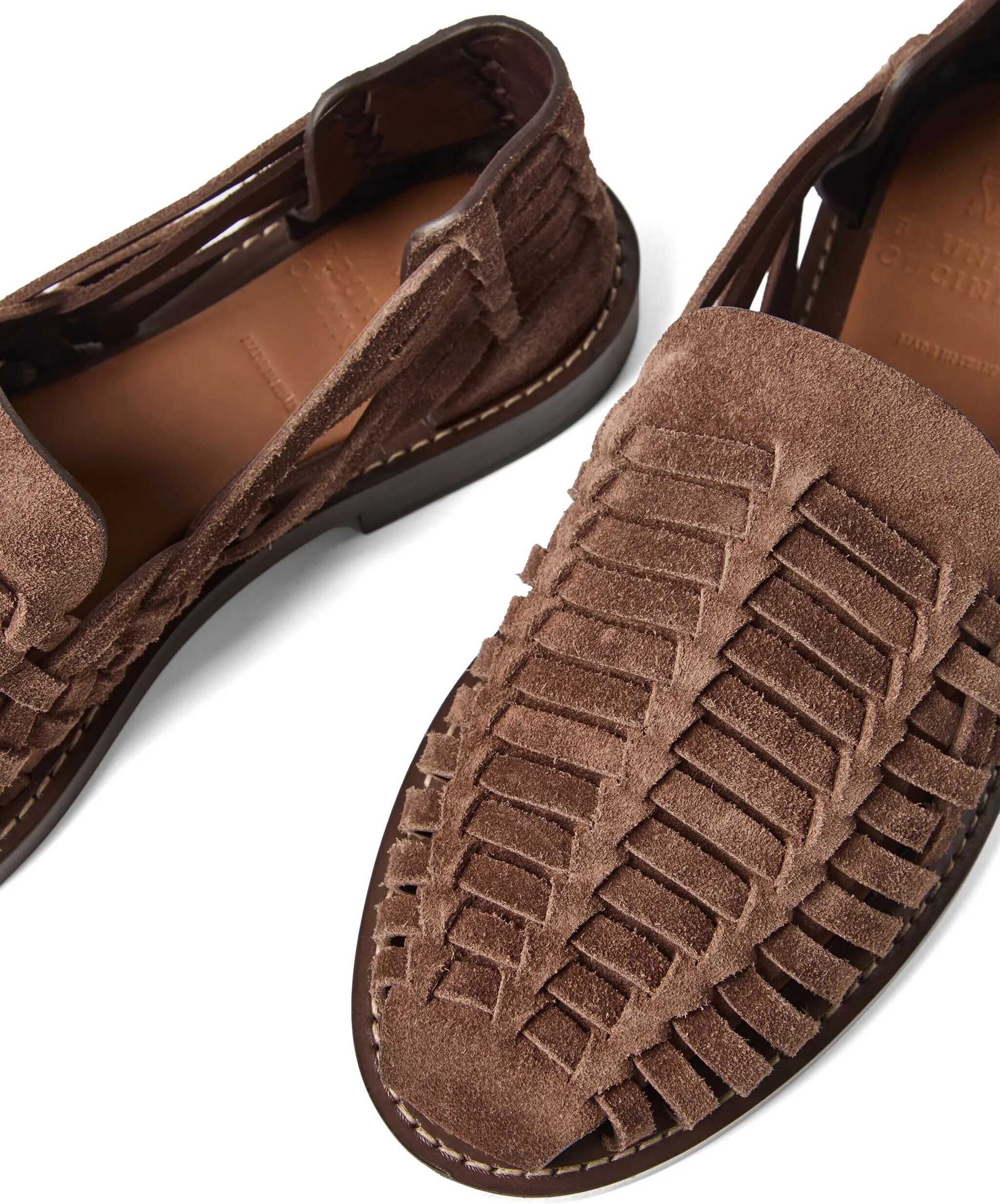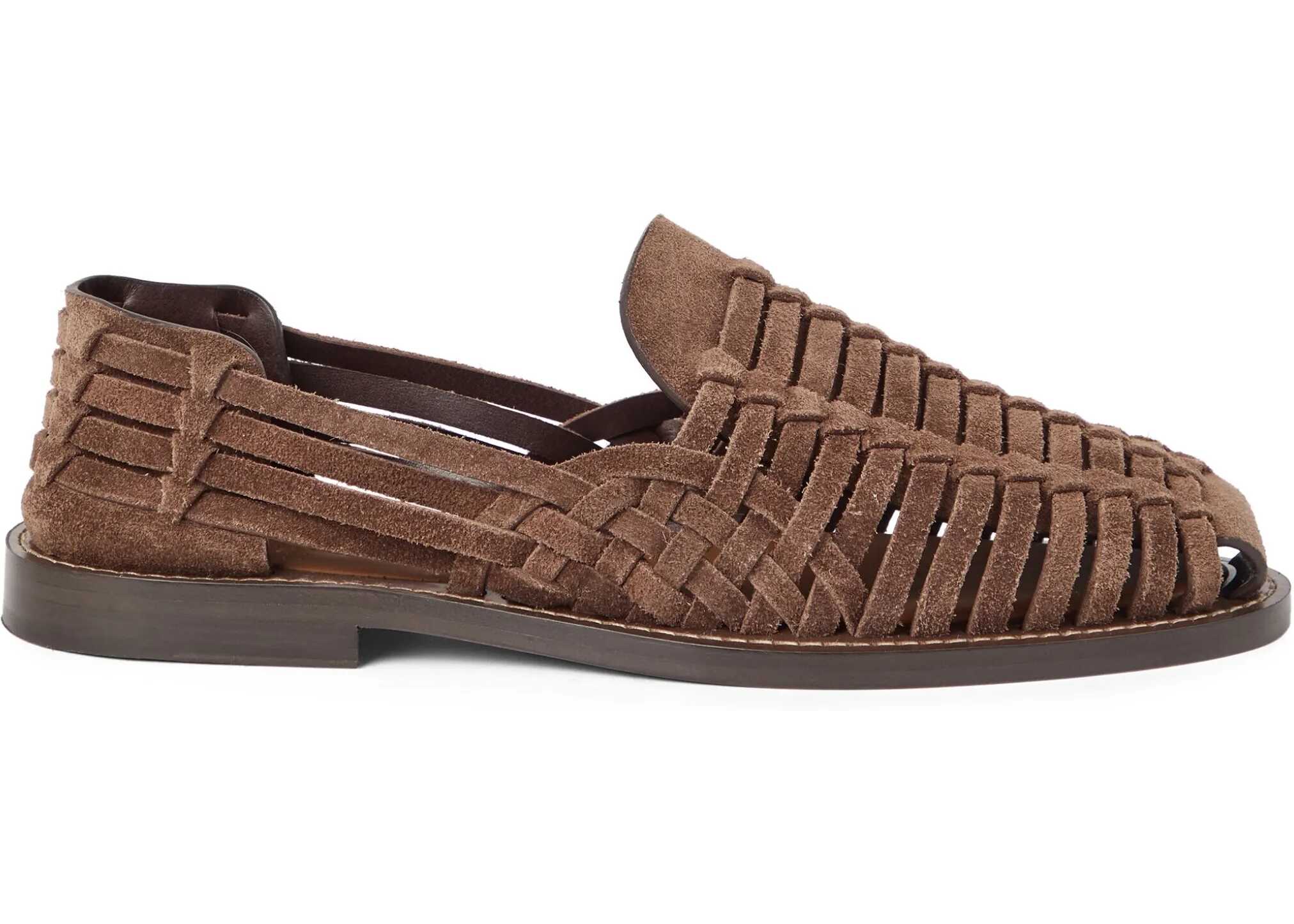 Leather Loafers by Brunello Cucinelli featuring a slip-on style, a caged design with all-over weave, a leather block heel, an almond toe, and a logo-embossed insole.