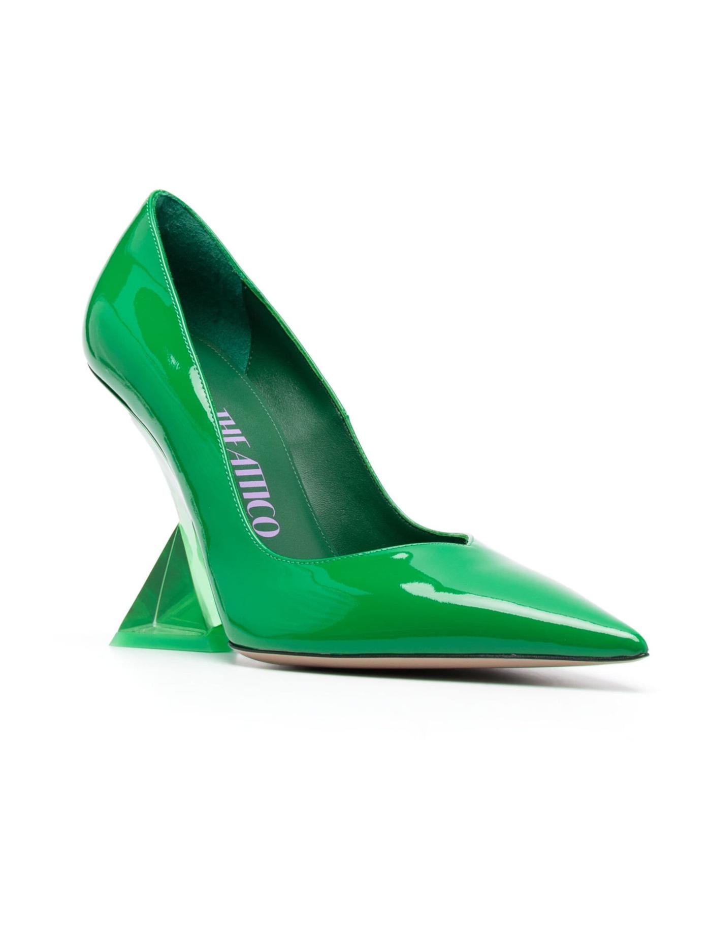 Grounded on a sculptural pyramid wedge heel, the Cheope pumps from The Attico are rendered in a rich emerald green hue. The sleek pointed toe and patent finish reflect the brand's statement aesthetic.