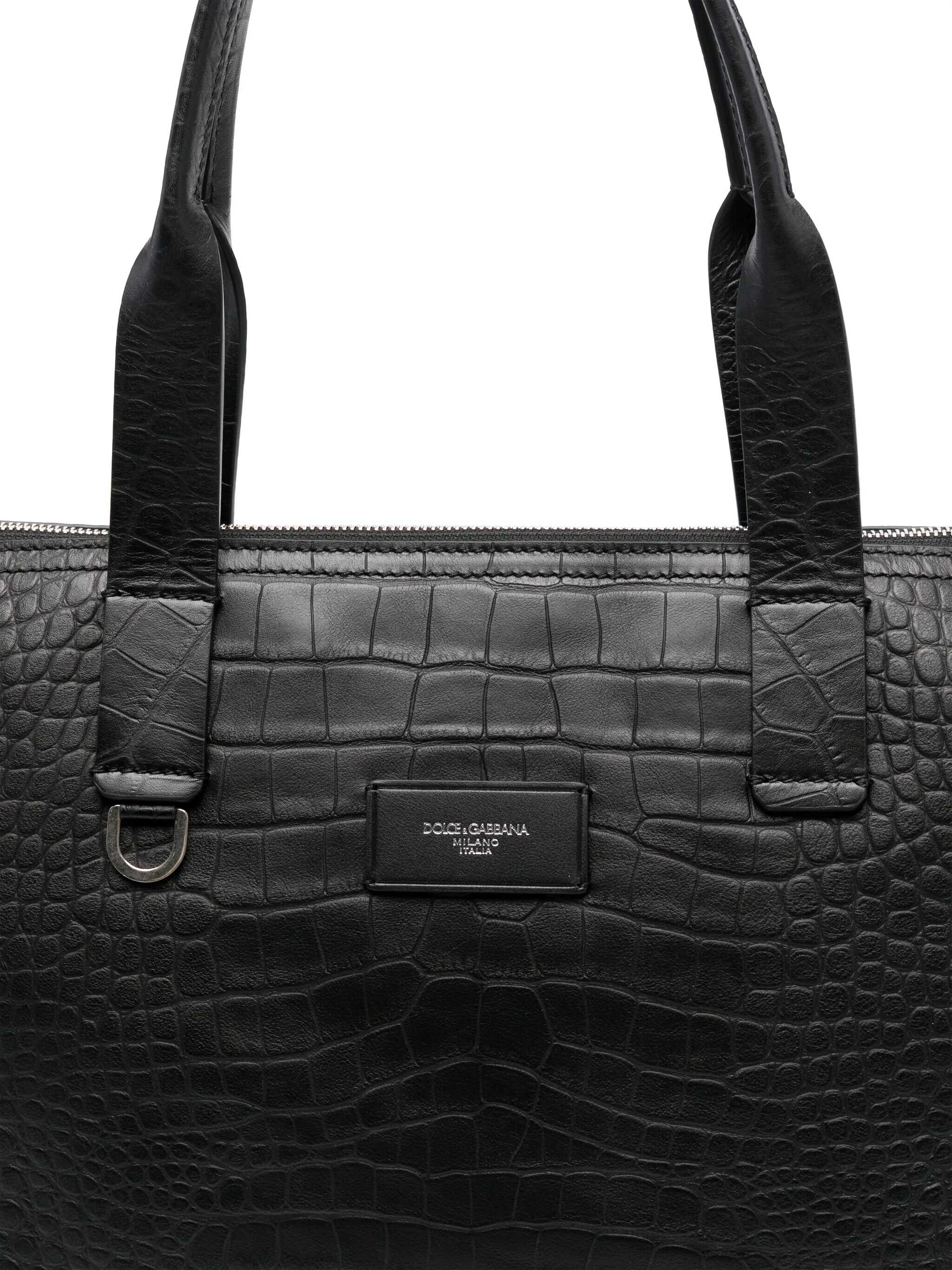 Black leather totes from Dolce&Gabbana featuring top handles, zip fastening, frontal logo patch and pocket.