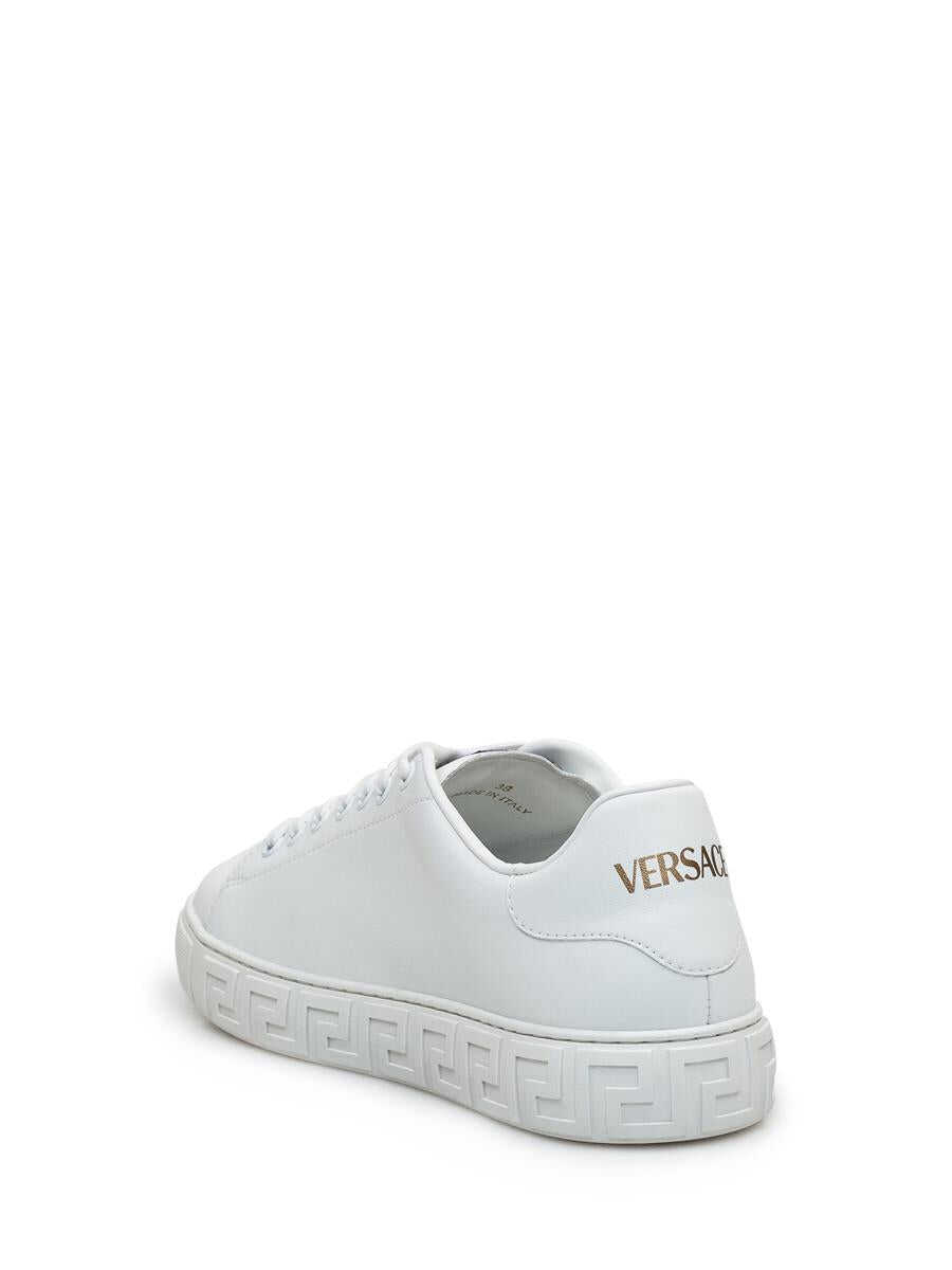 White sneaker. Lace-up closure. Logo patch on tongue. Logo on the heel. Greek pattern engraved on rubber soles.