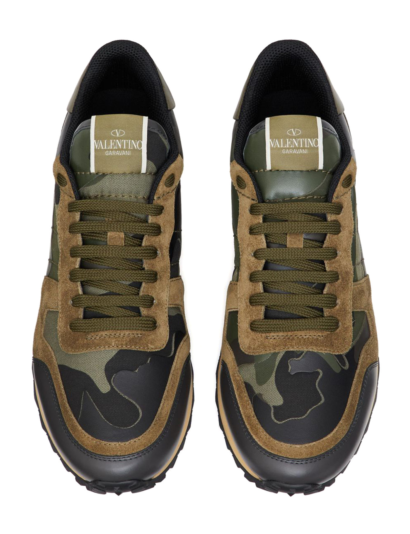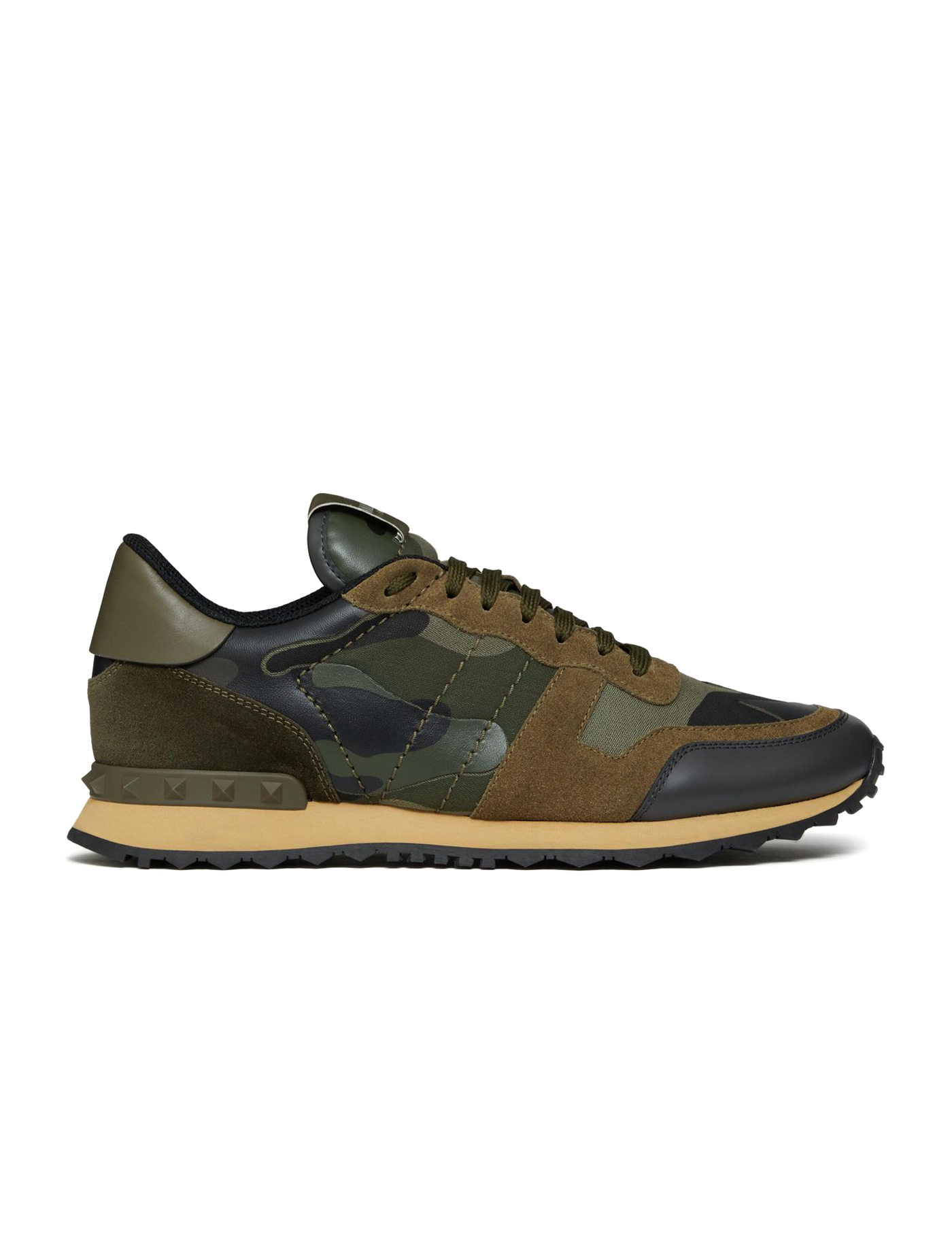 Rockrunner sneakers by Valentino Garavani made from smooth and suede leather and fabric with camouflage motif. Fabric logo label on the tongue and the iconic rubber studs on the back. Fabric lining with removable insole. Rubber sole. Extra laces included.