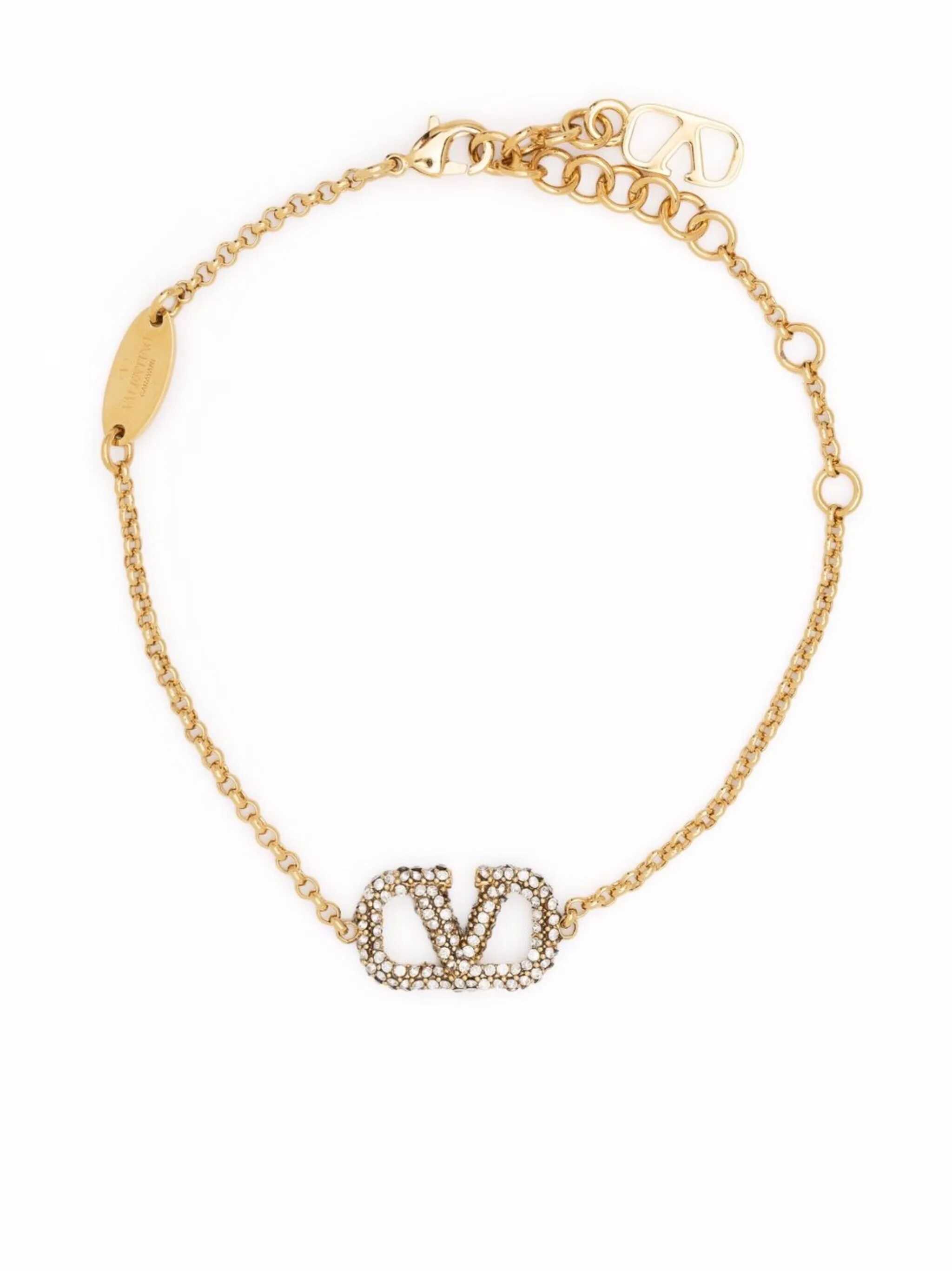 gold-tone brass VLogo Signature Swarovski crystal embellishment cable-link chain lobster claw fastening adjustable-length chain charm detail