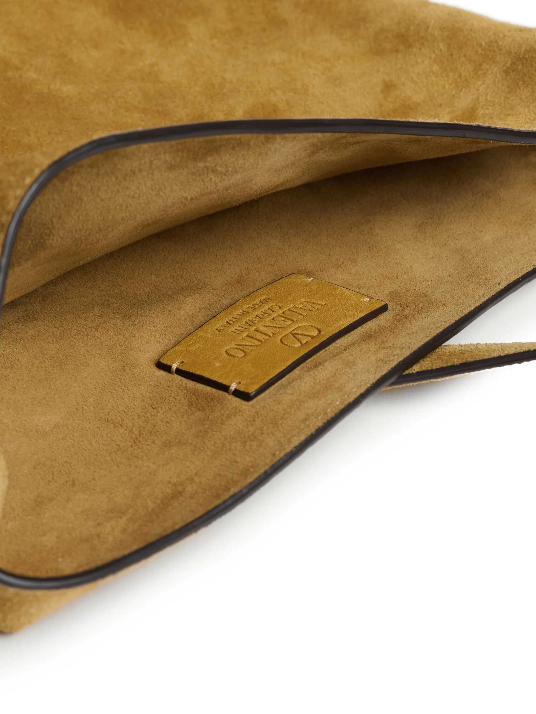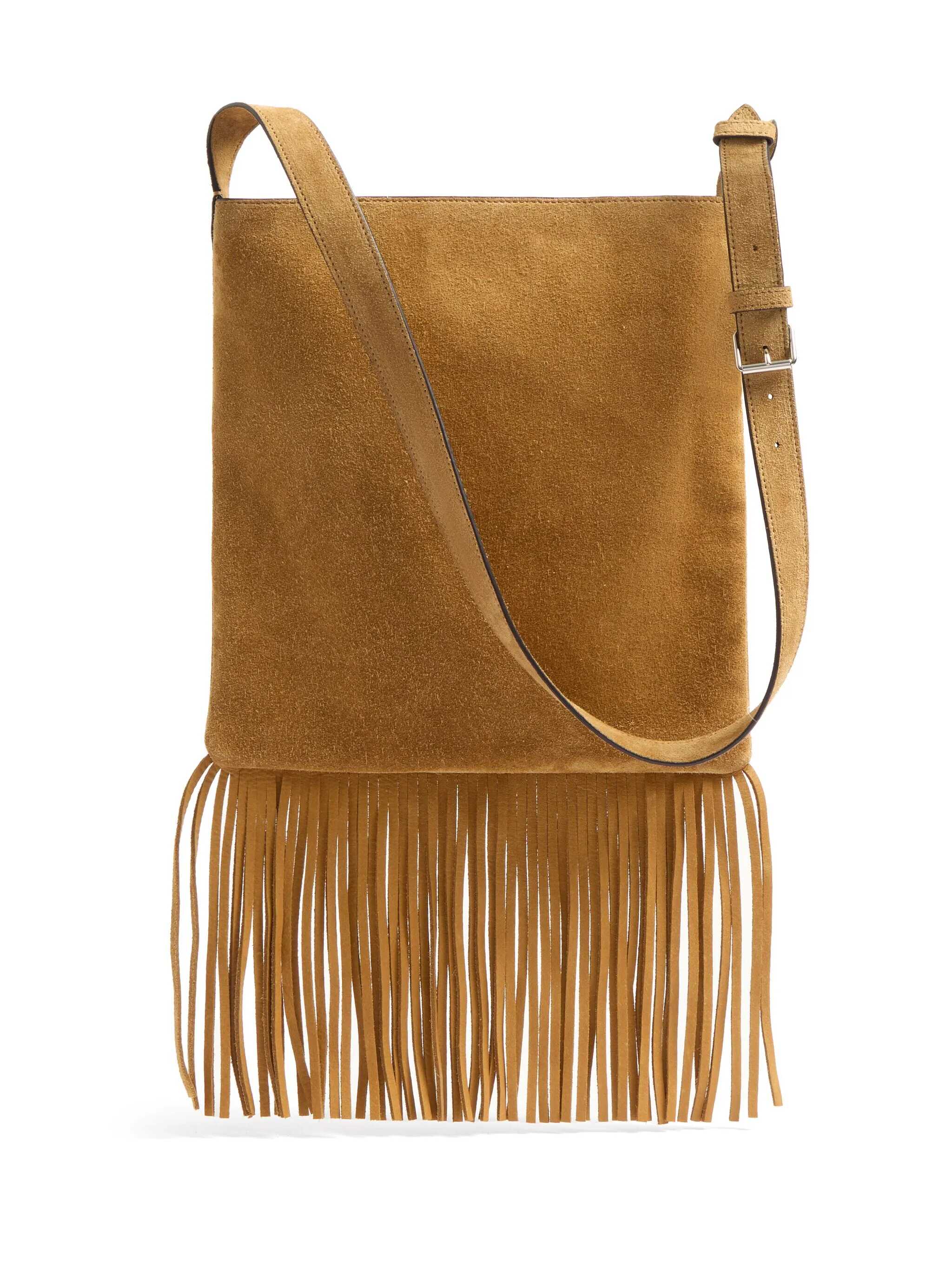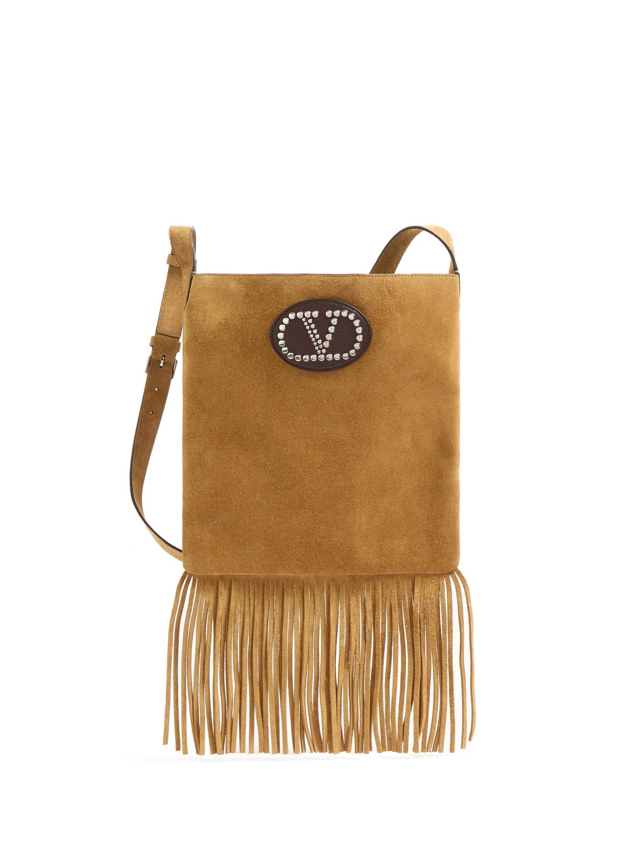 beige calf suede appliqué logo fringe detailing adjustable shoulder strap main compartment internal logo patch