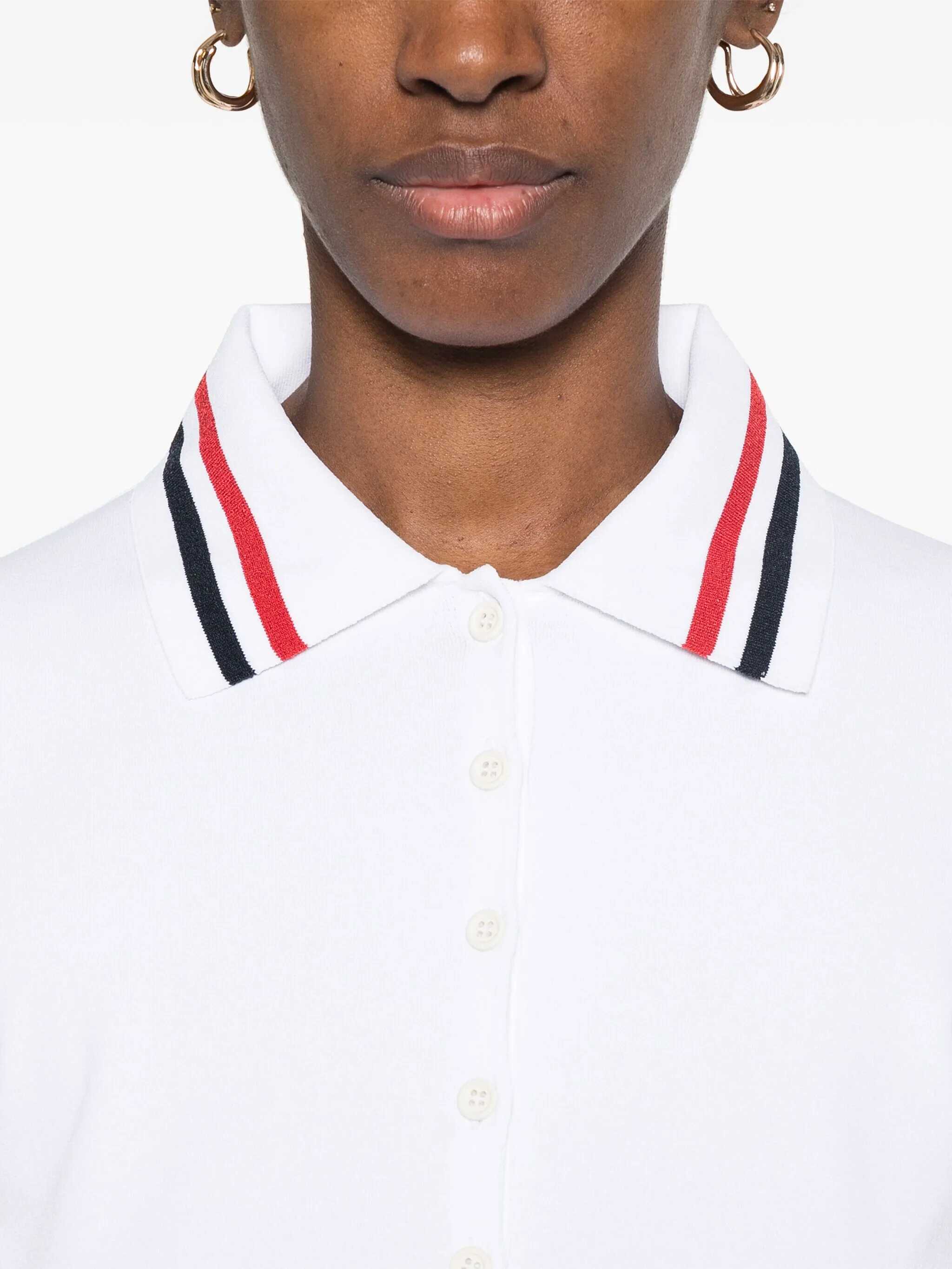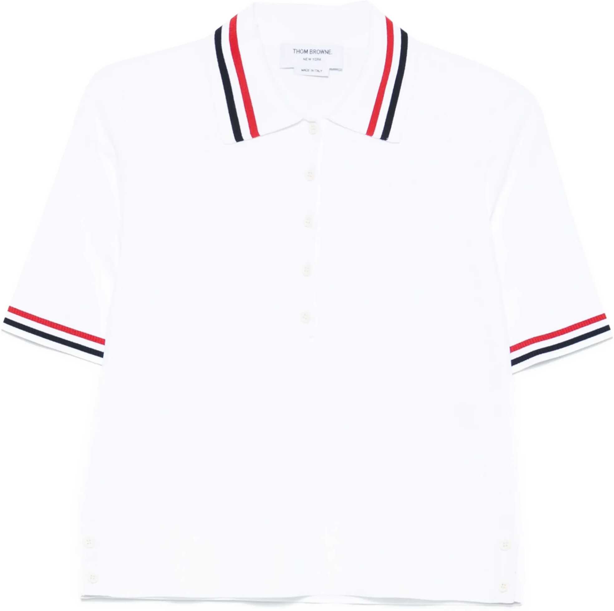 The Thom Browne Polo Shirt features a front button closure at mid-chest and a ribbed collar adorned with the brand's iconic colored stripes. The ribbed sleeve hems are also enhanced with the same colored stripes, while the ribbed hem completes the design. An elegant and distinctive piece that combines classic style with modern and recognizable details.