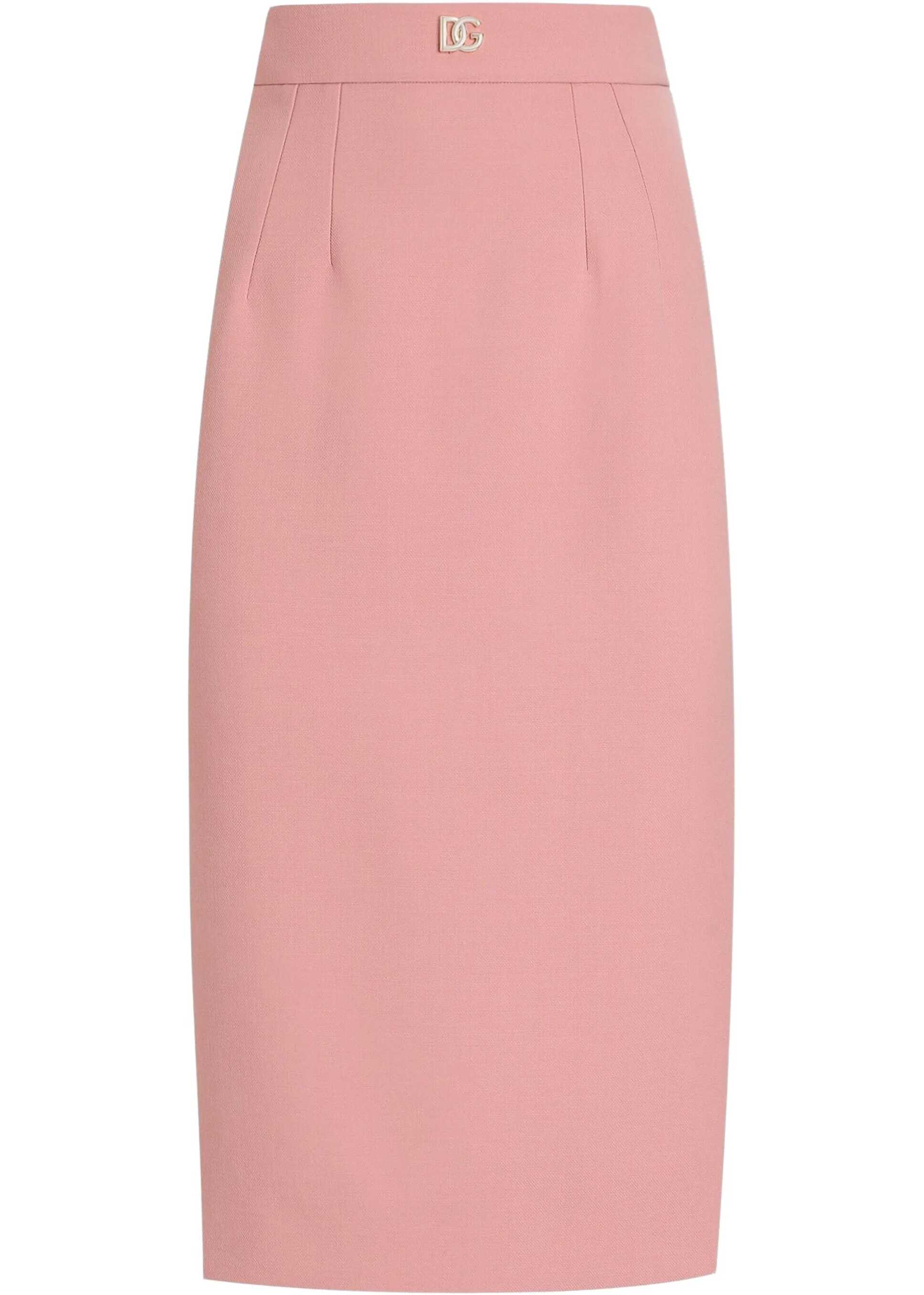 High-waisted pencil skirt in pink double crepe wool. It features a golden metal DG logo on the front, a hook and zip closure at the back, a back slit, and a tonal stretch silk lining.