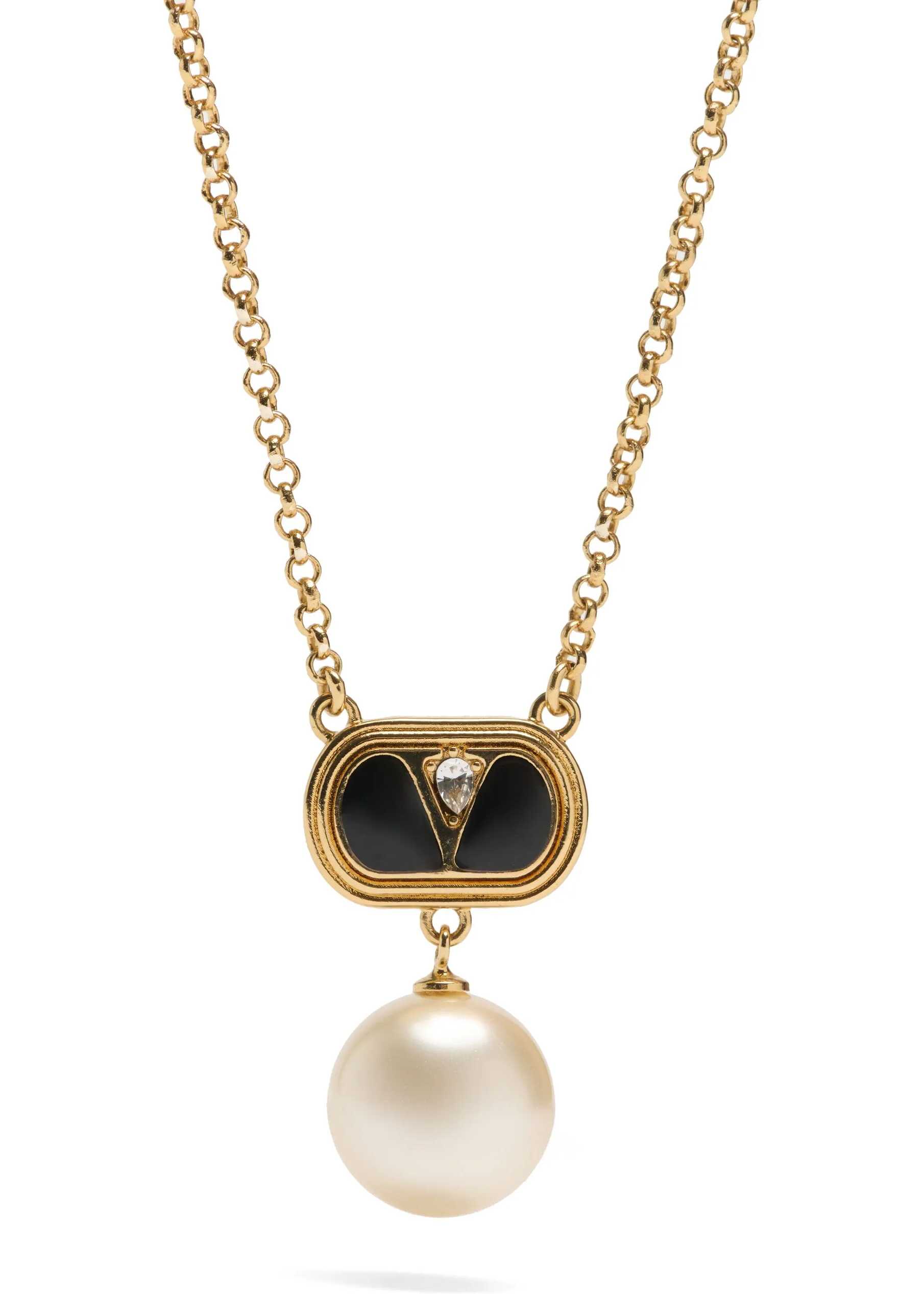 Valentino Garavani's Pearl Pendant Necklace features a classic clasp. The pendant is attached to a plaque, on which the brand's iconic VLogo is engraved. A refined and sophisticated piece of jewelry that combines the beauty of the pearl with Valentino's distinctive symbol, perfect for adding a touch of class to any look.