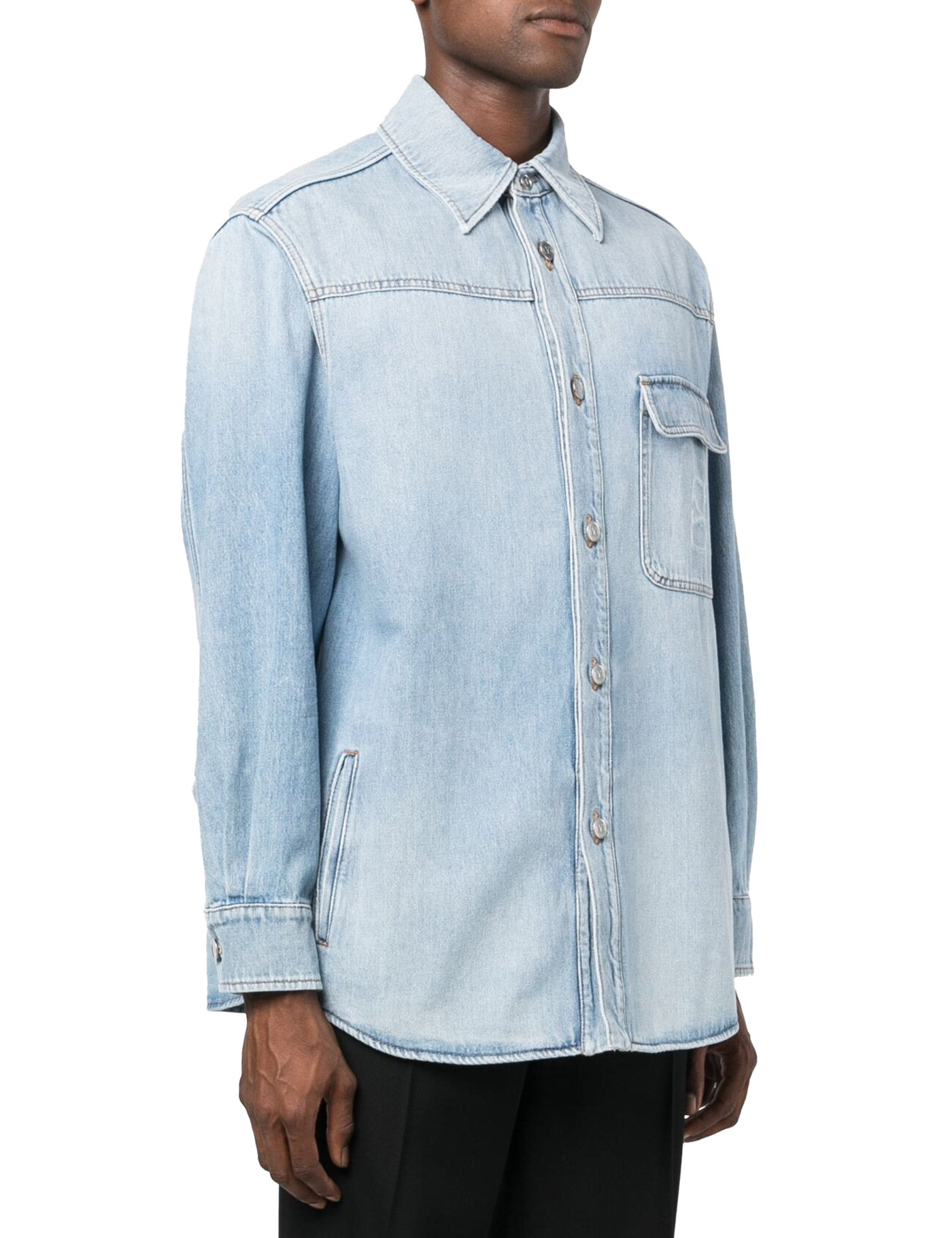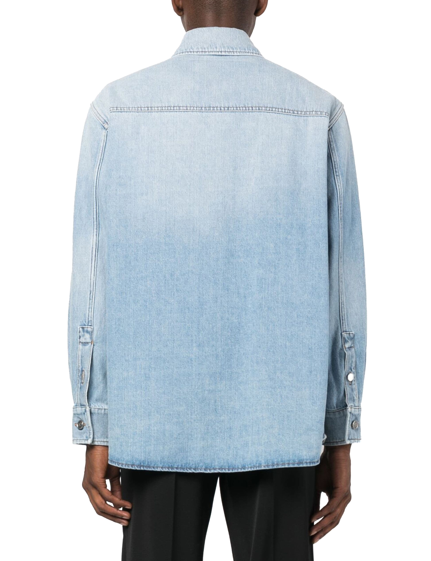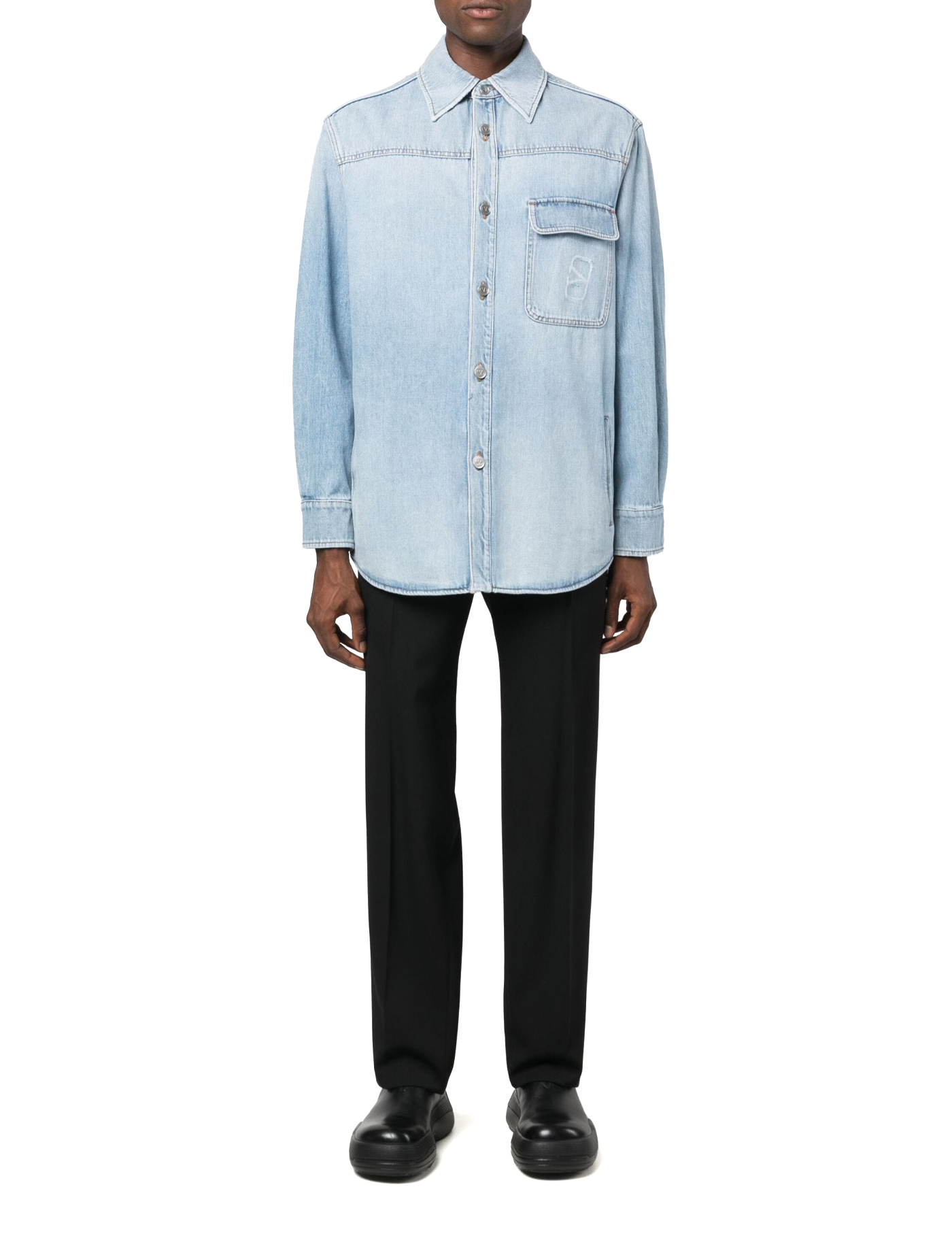 Valentino overshirt crafted in pure cotton denim with medium wash. Characterized by a chest pocket with flap decorated with stamped VLogo Signature, this model boasts pointed classic collar, front button placket, side welt pockets and buttoned cuffs. Relaxed fit. The model is 187 cm tall and wears size IT 48.