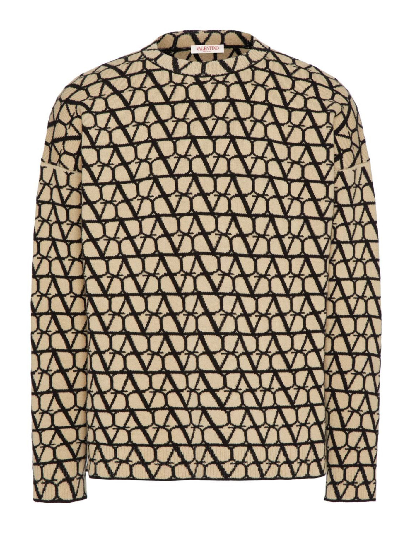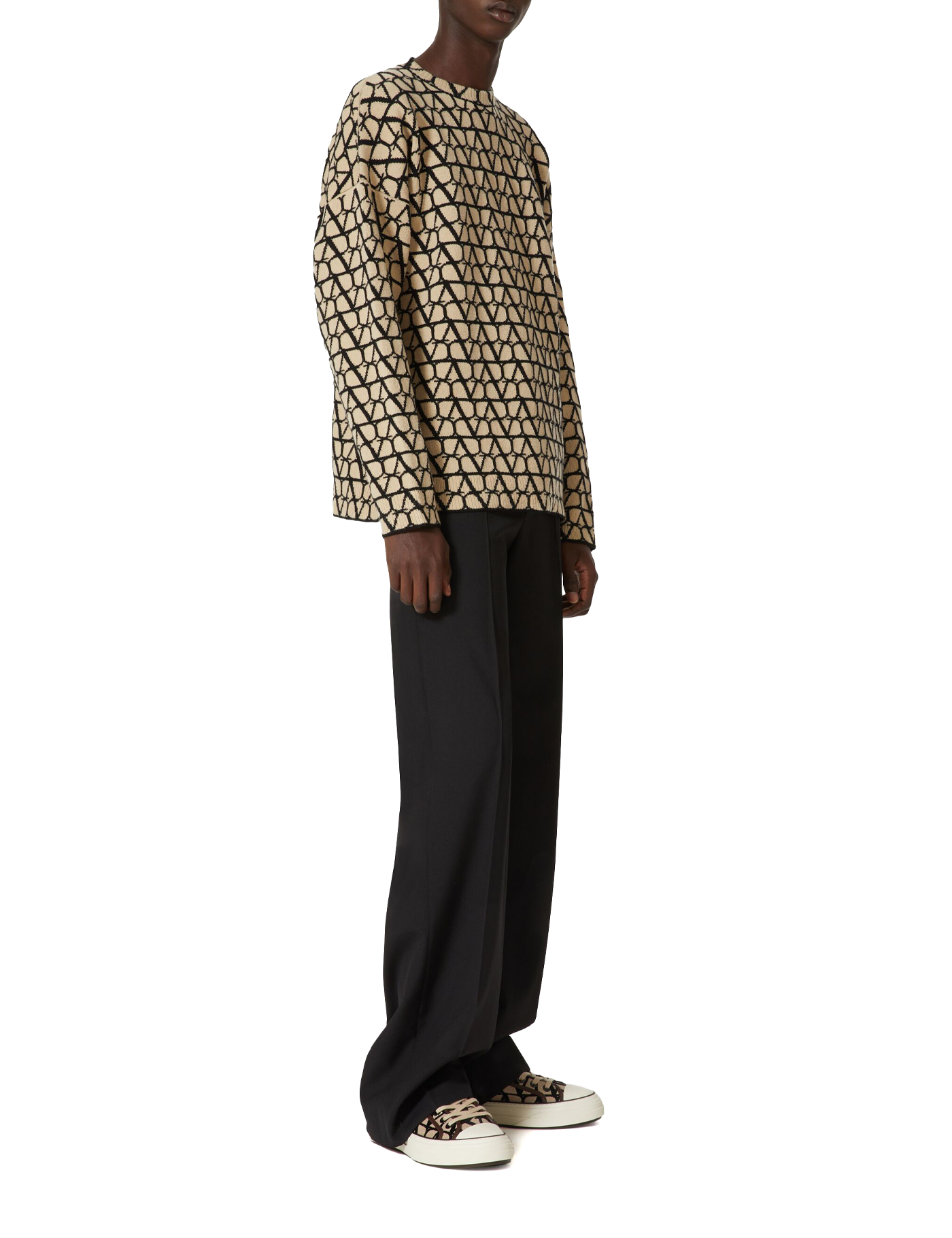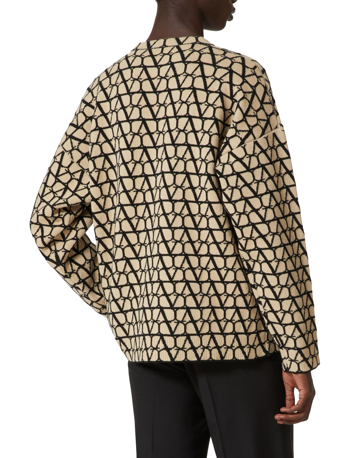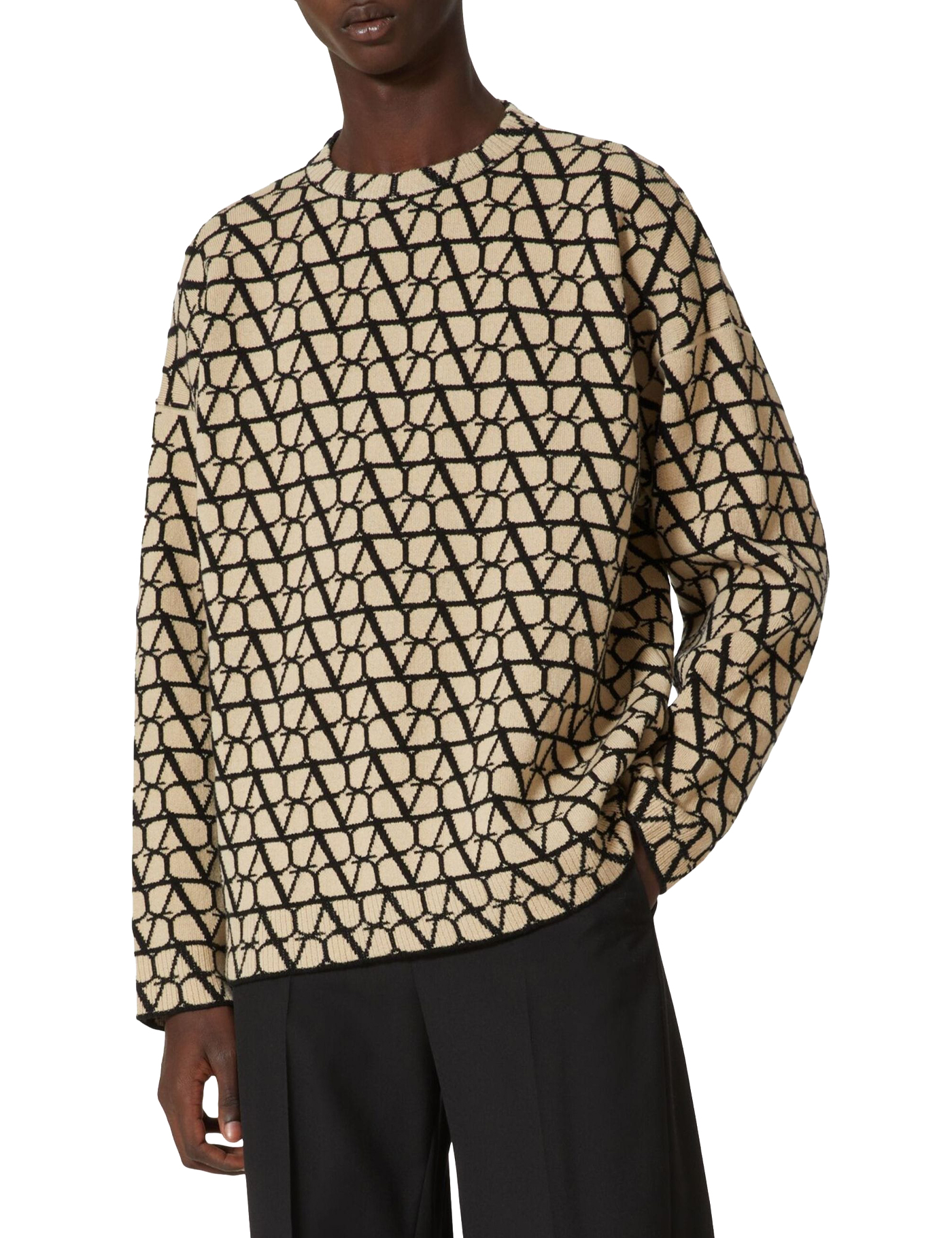 Valentino crewneck sweater made of pure virgin wool with all-over Toile Iconographe jacquard pattern. Ribbed trims, oversized fit. The model is 187 cm tall and wears a size M.