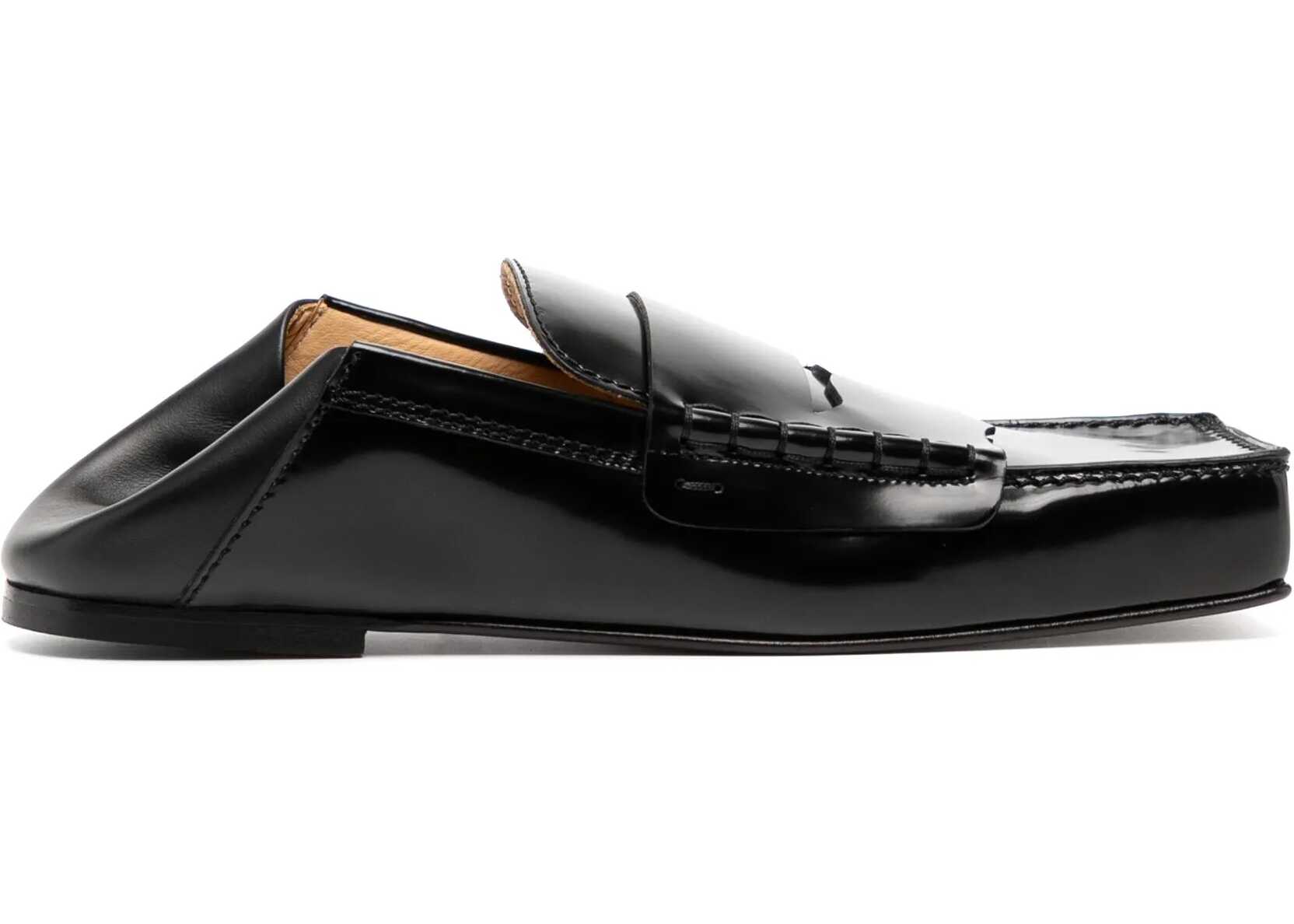 Carré loafers in black glazed calf leather and soft heels to be worn as folded mules. They feature a squared toe, visible stitching, embossed logo on the inner sole, and a leather sole. Dust bag included. Any imperfections in the leather are not to be considered manufacturing defects, but a peculiarity of the material.