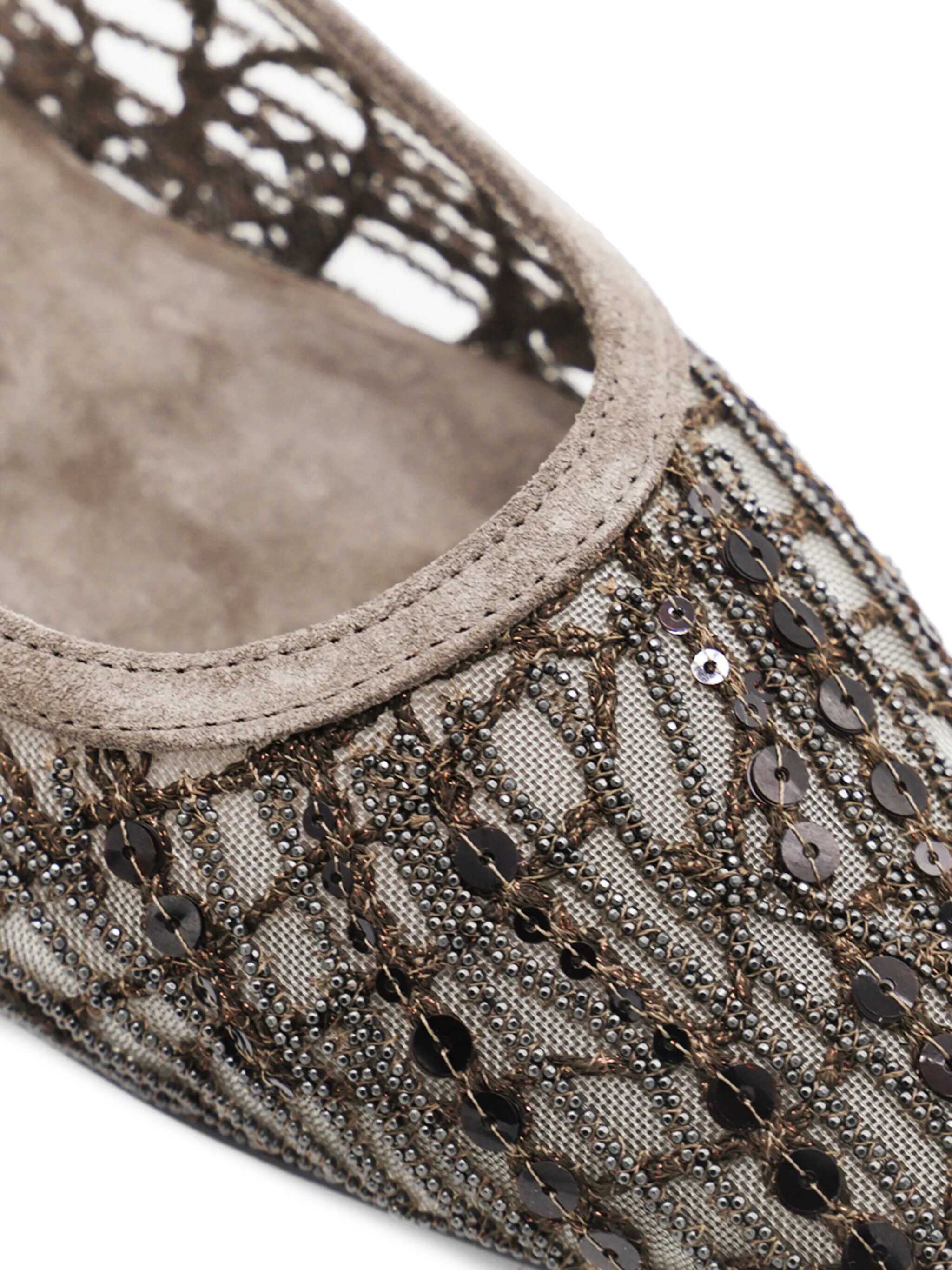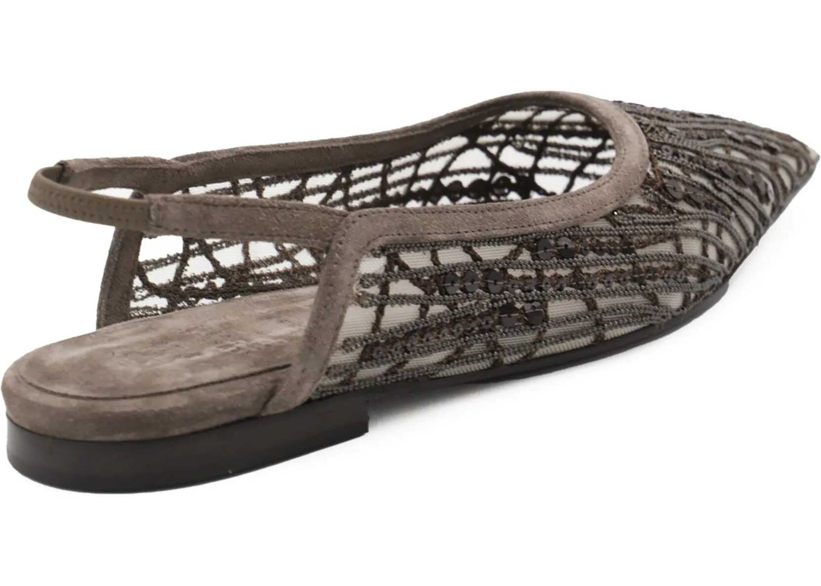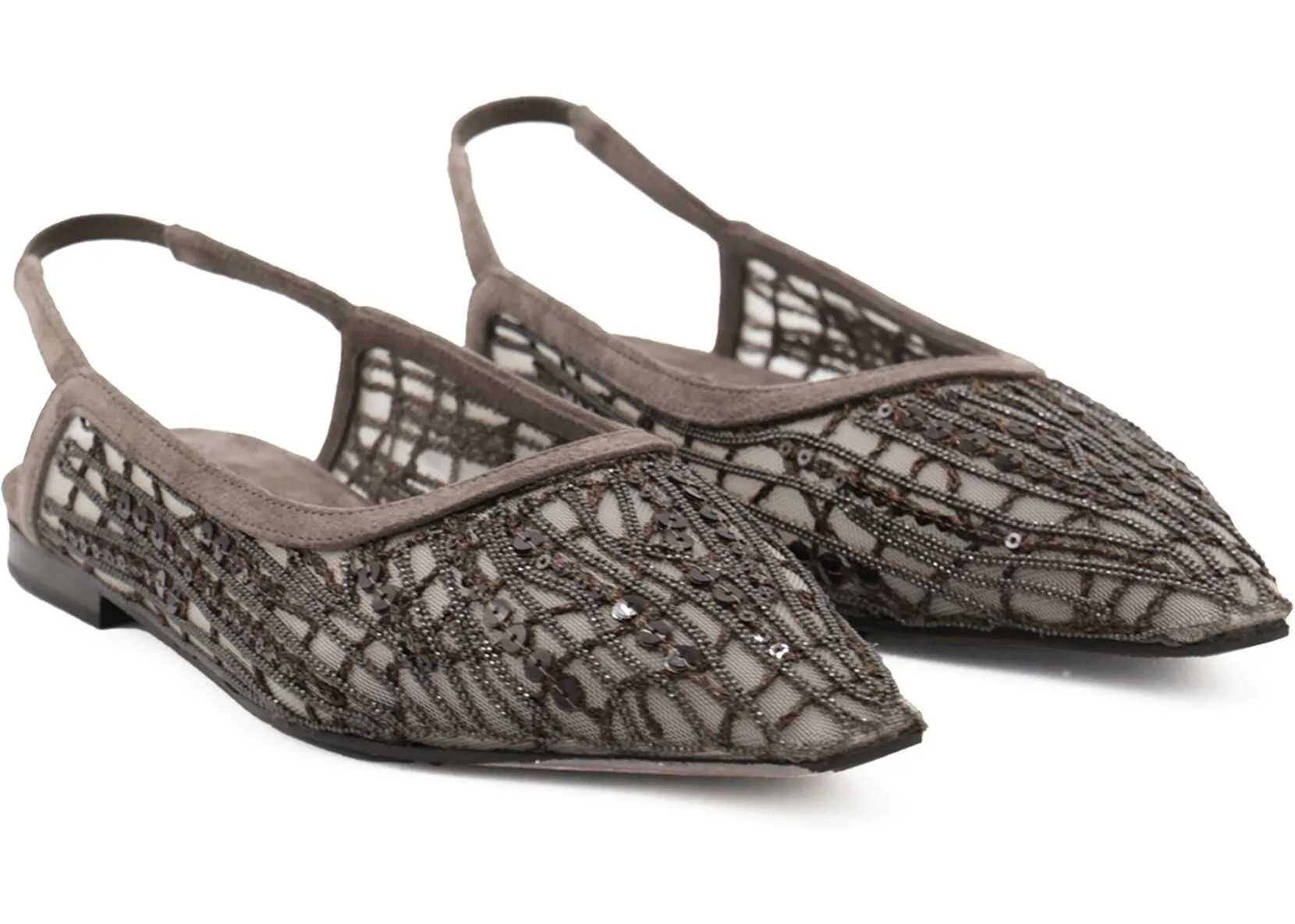 The Ballerinas by Brunello Cucinelli are an elegant example of craftsmanship and refined style. The almond toe offers a delicate line, while the elasticated slingback on the heel ensures comfort and practicality. The semi-transparent mesh design enriched with beaded and sequin details gives a touch of brightness and sophistication, making these ballerinas a unique and versatile piece for every special occasion.