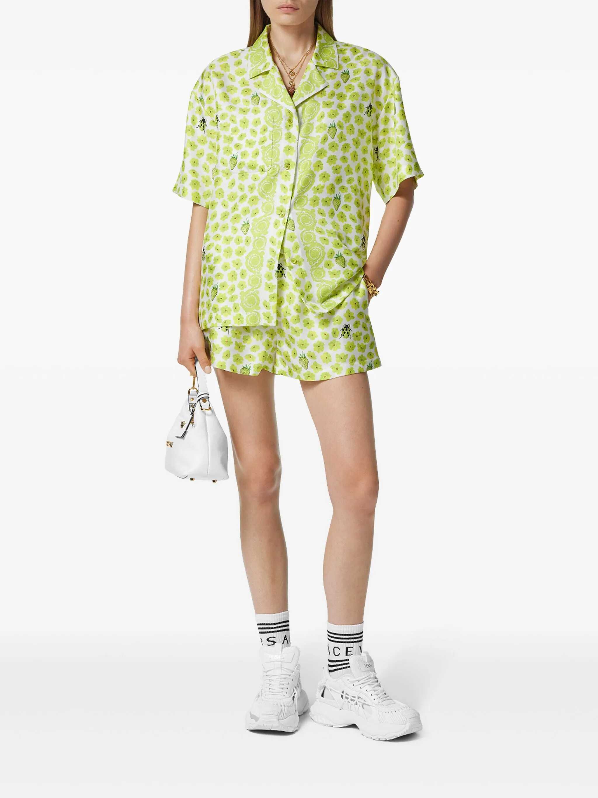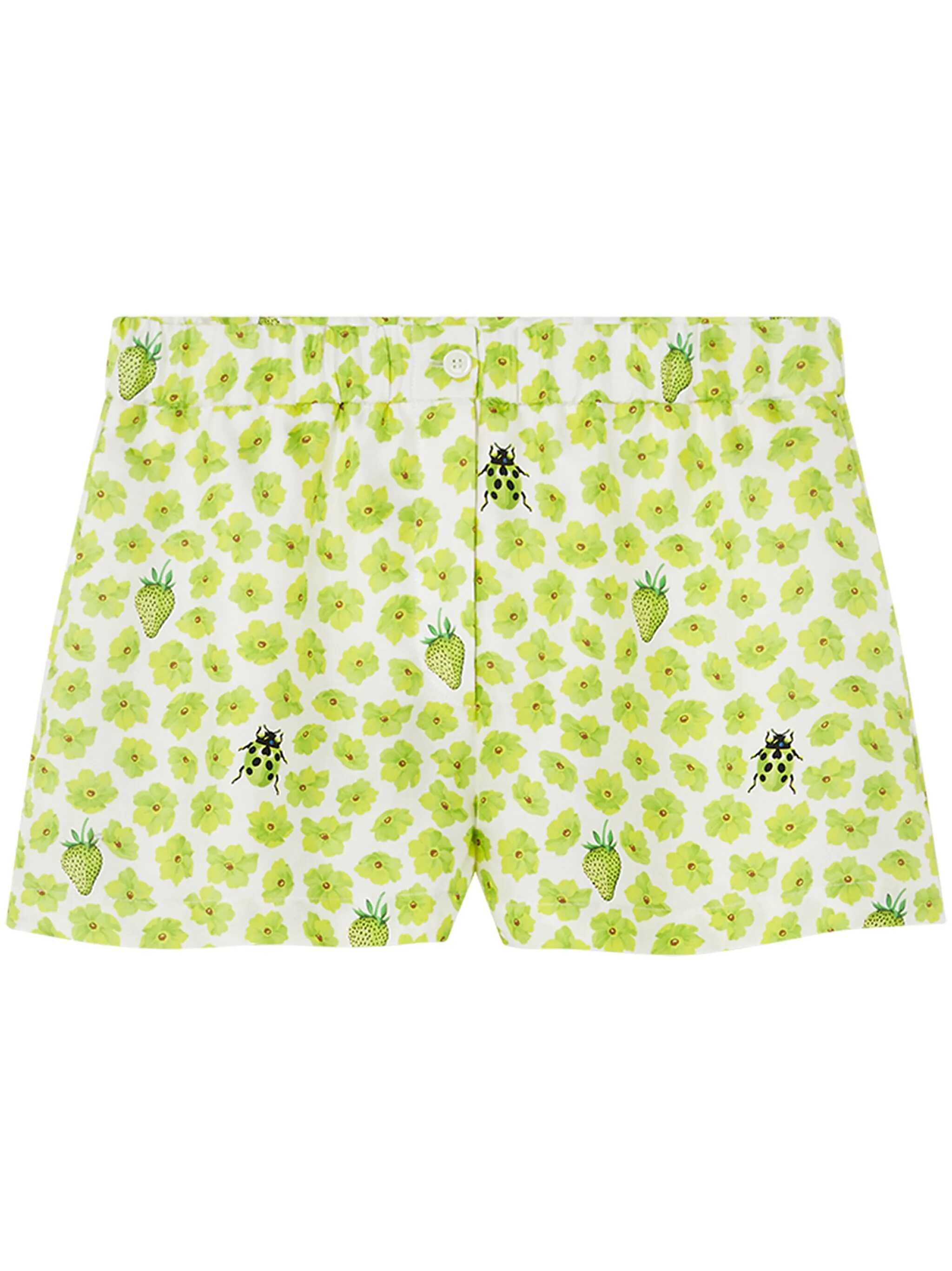 'Strawberry Garden' print silk twill shorts, pajama model, elastic waistband, button flap, pockets