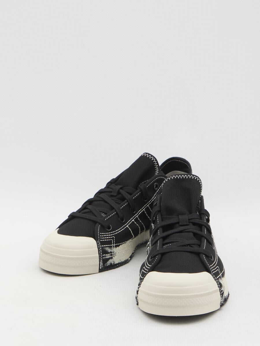 Nizza Low sneakers in black canvas with a white rubber toe. They feature a lace-up closure, a graphic design with three stripes on the sides with contrast visible stitching, a white textured painted stripe detail on the sides of the sole, a white rubber patch with the Yohji Yamamoto signature on the heel, and a rubber sole. Additional laces included.