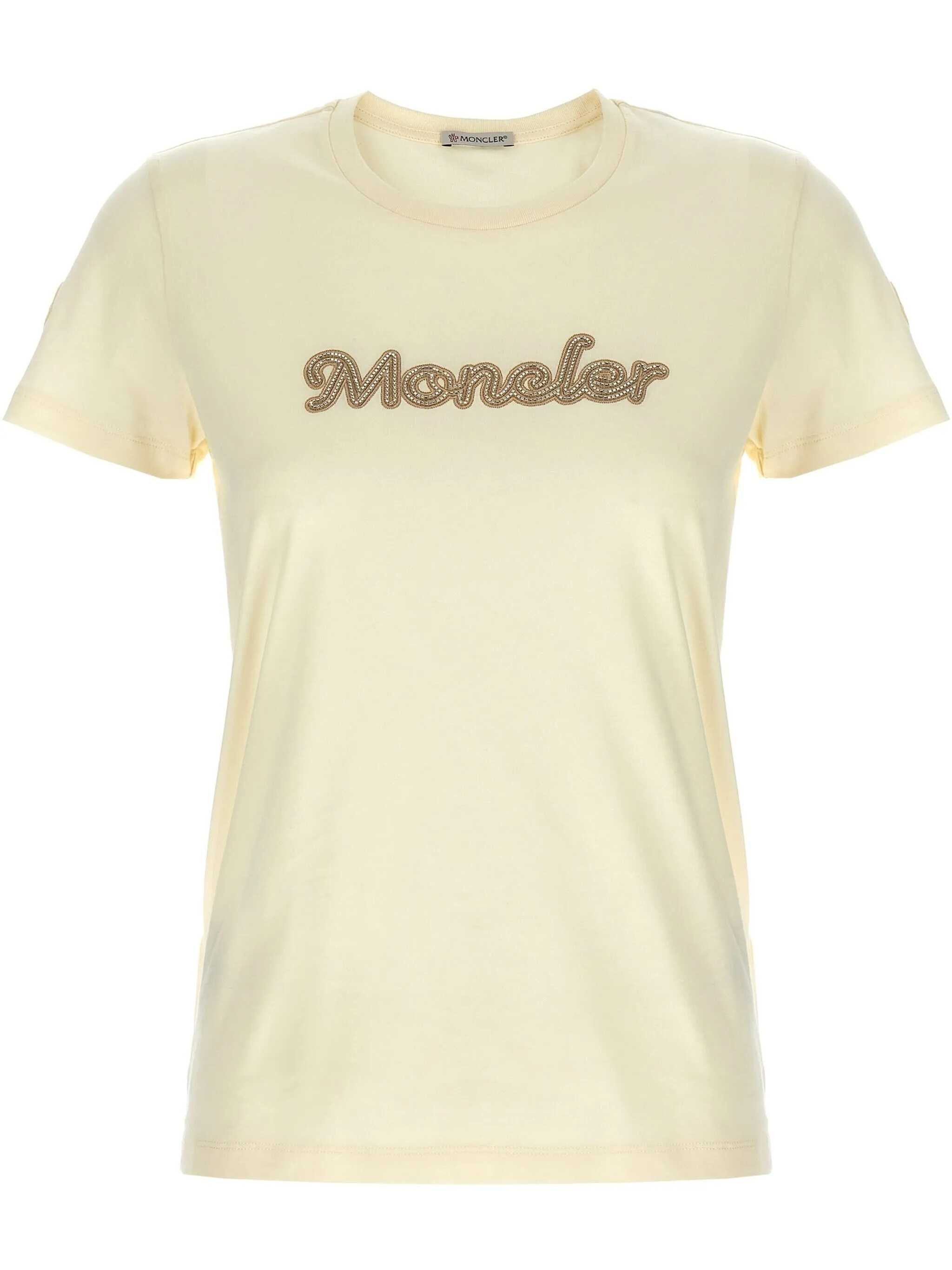Pastel yellow cotton t-shirt from Moncler featuring crew neck, embroided front logo, short sleeves, logo patch at the sleeve