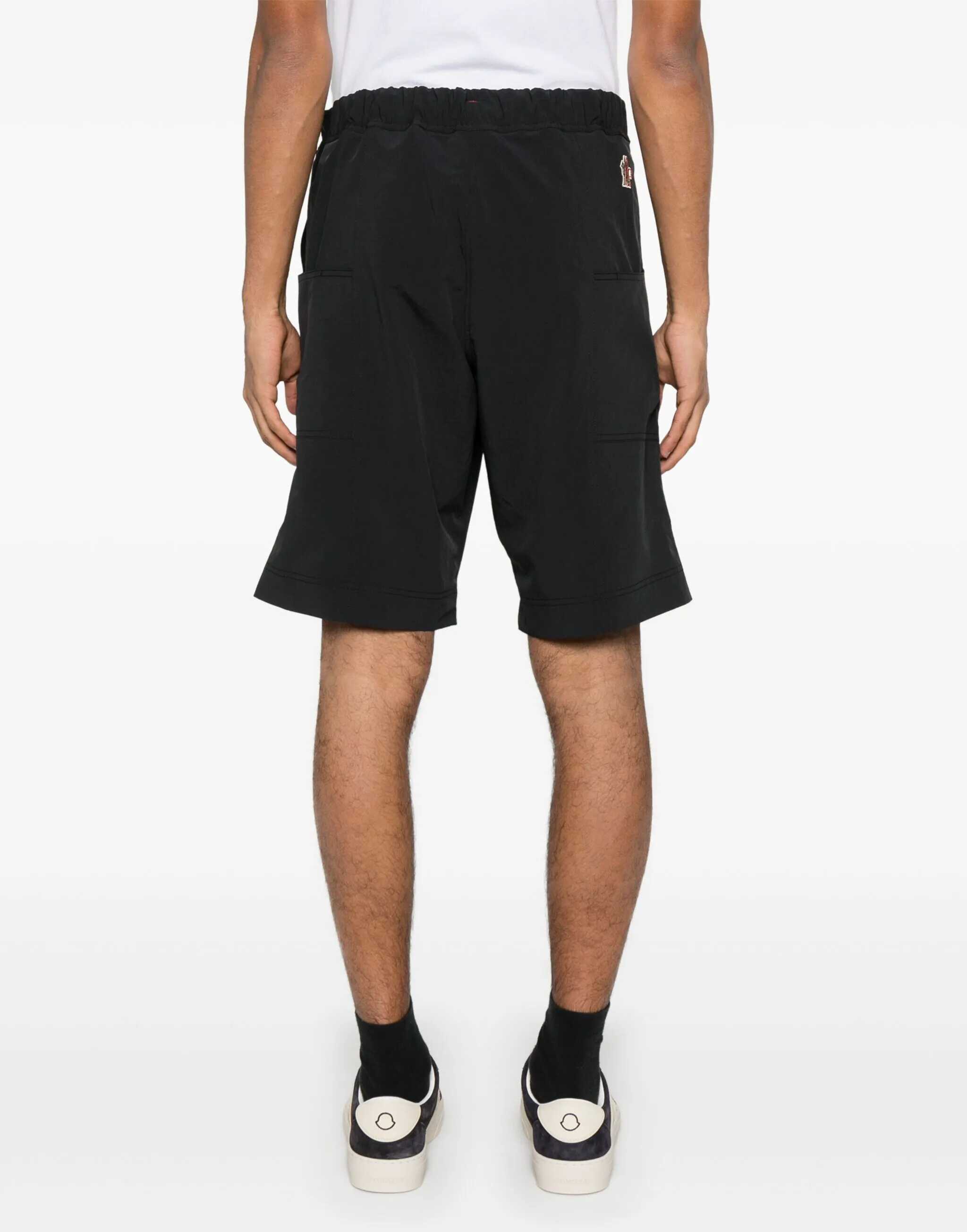 Cargo bermuda shorts in black polyester. They feature an elasticized waistband with a buckle belt to adjust the fit, zip closure, four side pockets, two cargo pockets on the legs, and a Moncler Grenoble patch on the back.