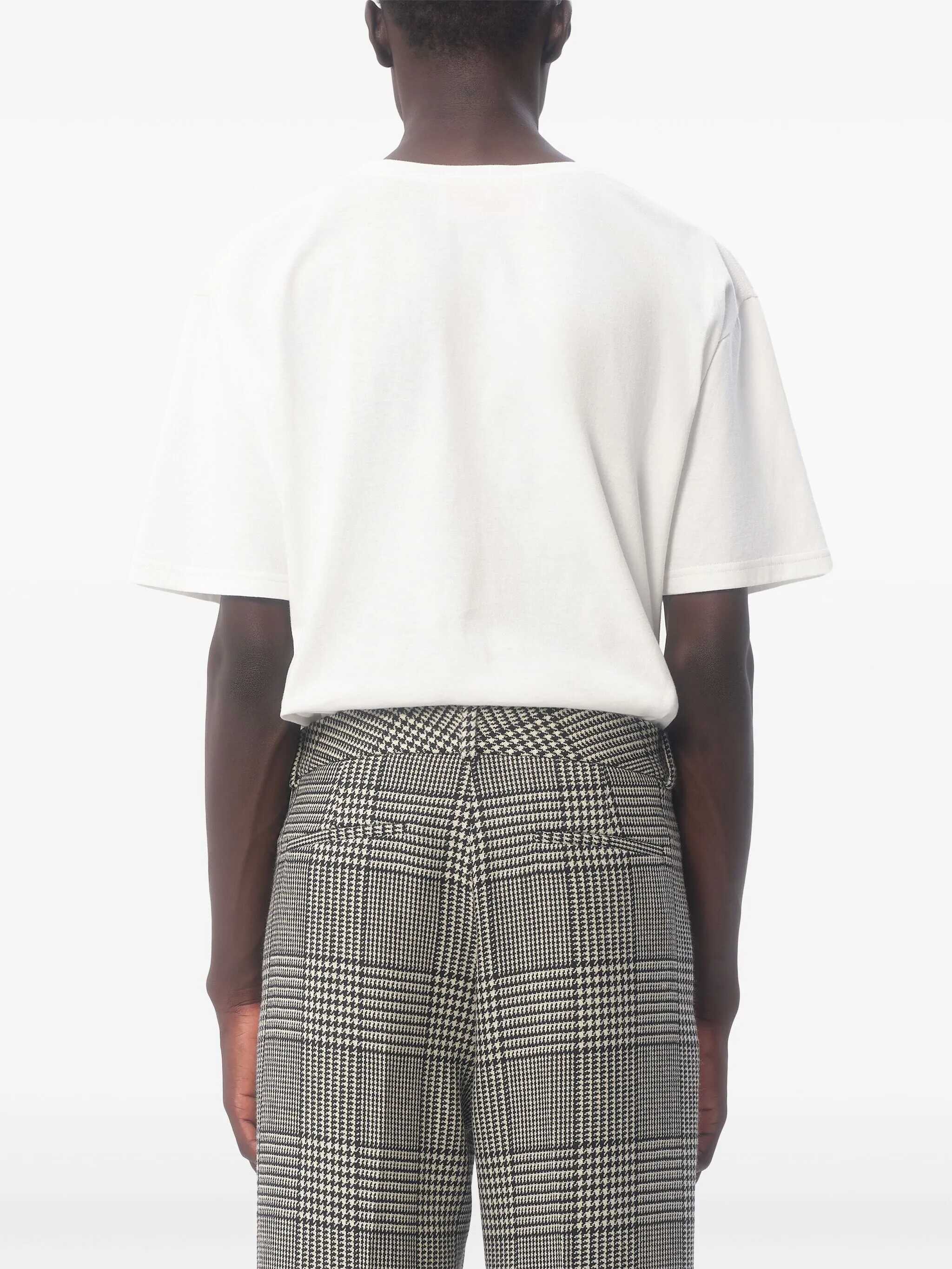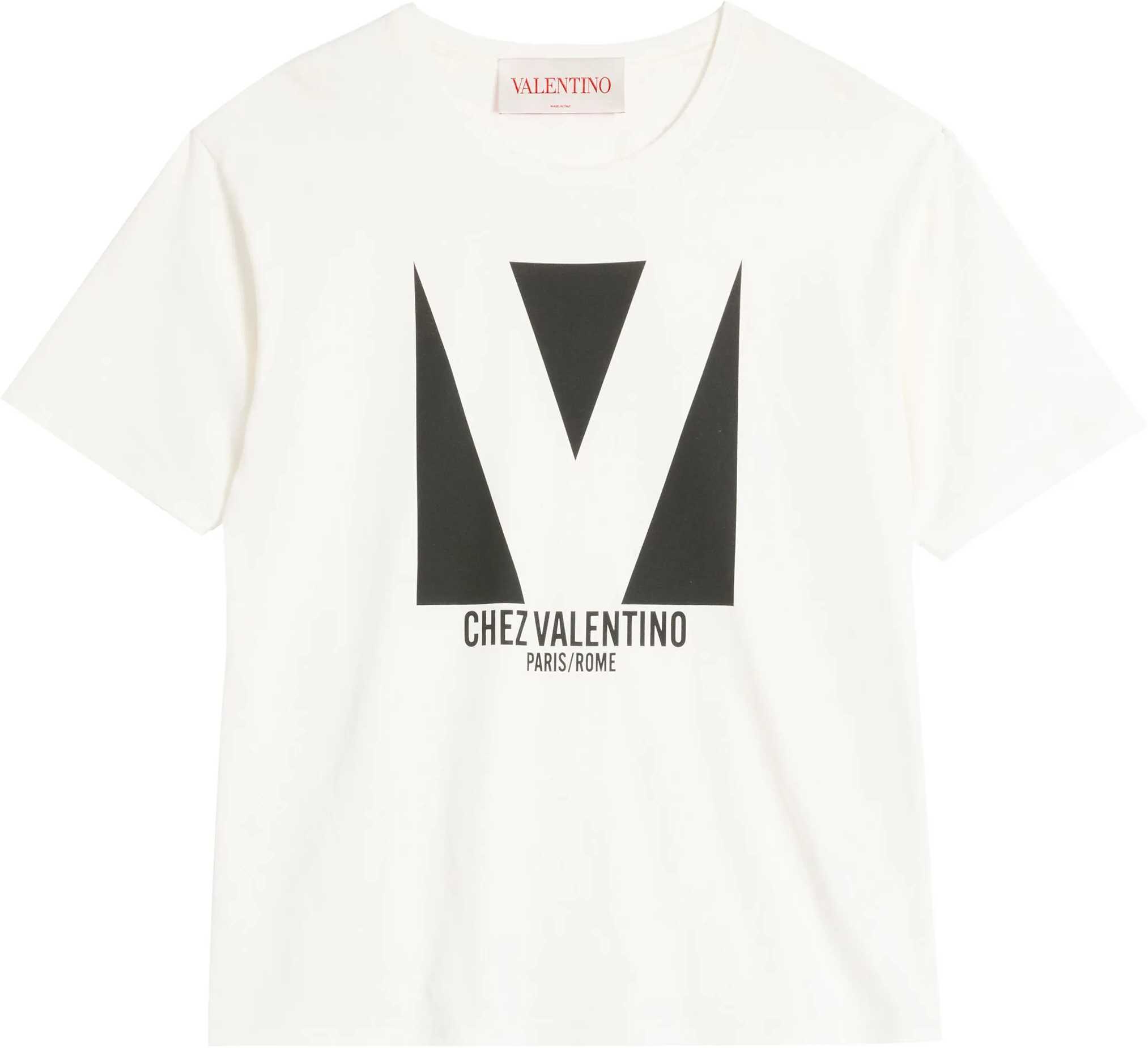 Valentino short-sleeved crewneck t-shirt in white cotton with Chez Valentino black print on the chest. Ribbed collar. Regular fit.