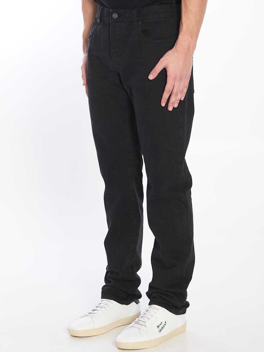 Slim-fit medium-rise jeans in charcoal black denim. They feature a button closure, five pockets, belt loops, slim legs, and a black leather patch with a tone-on-tone logo on the back.