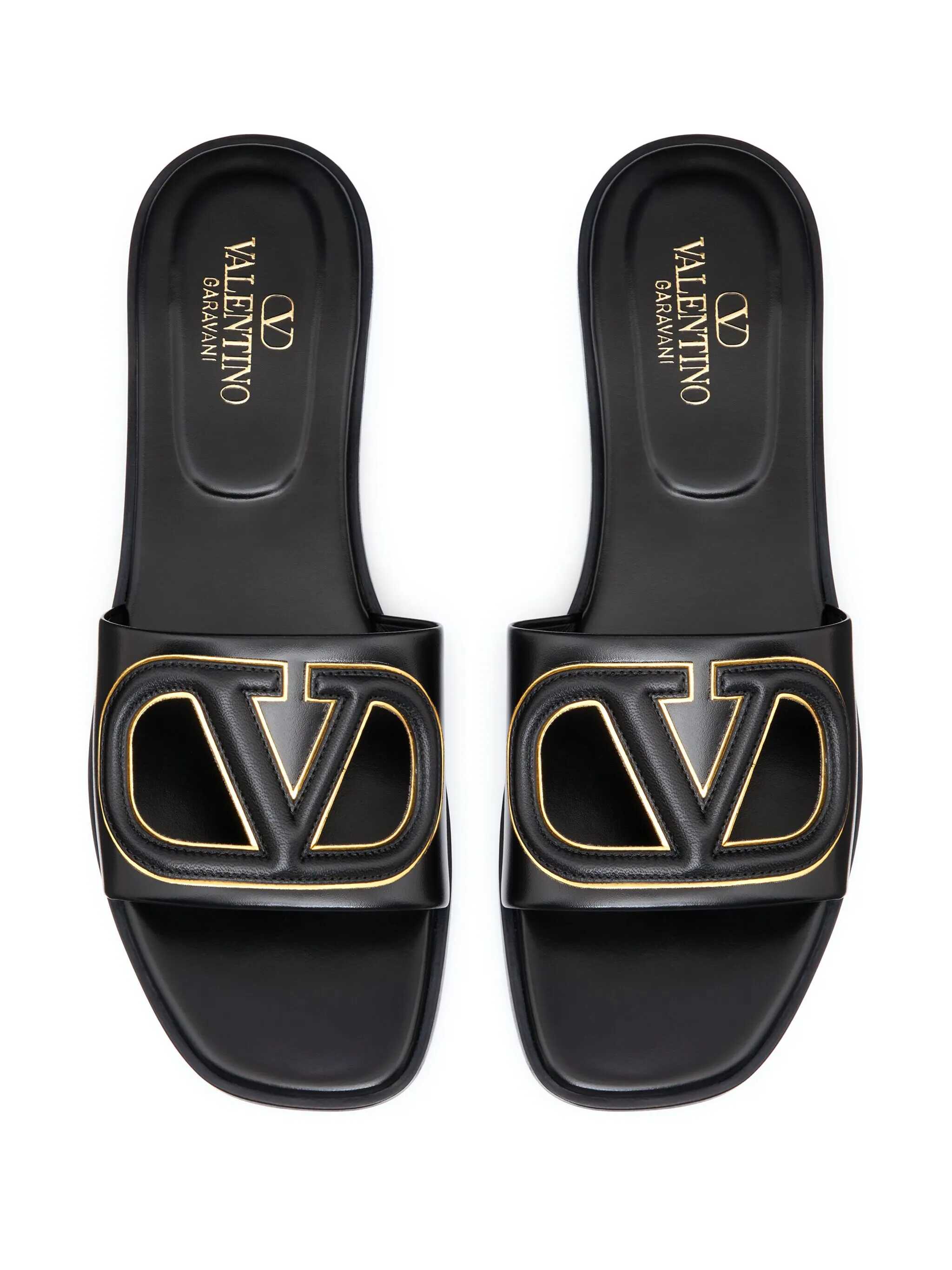 Black, calfskin, smooth grain, VLogo Signature detail, contrasting edges, open square toe, single toe band, slip-on design, logo footbed and flat sole.