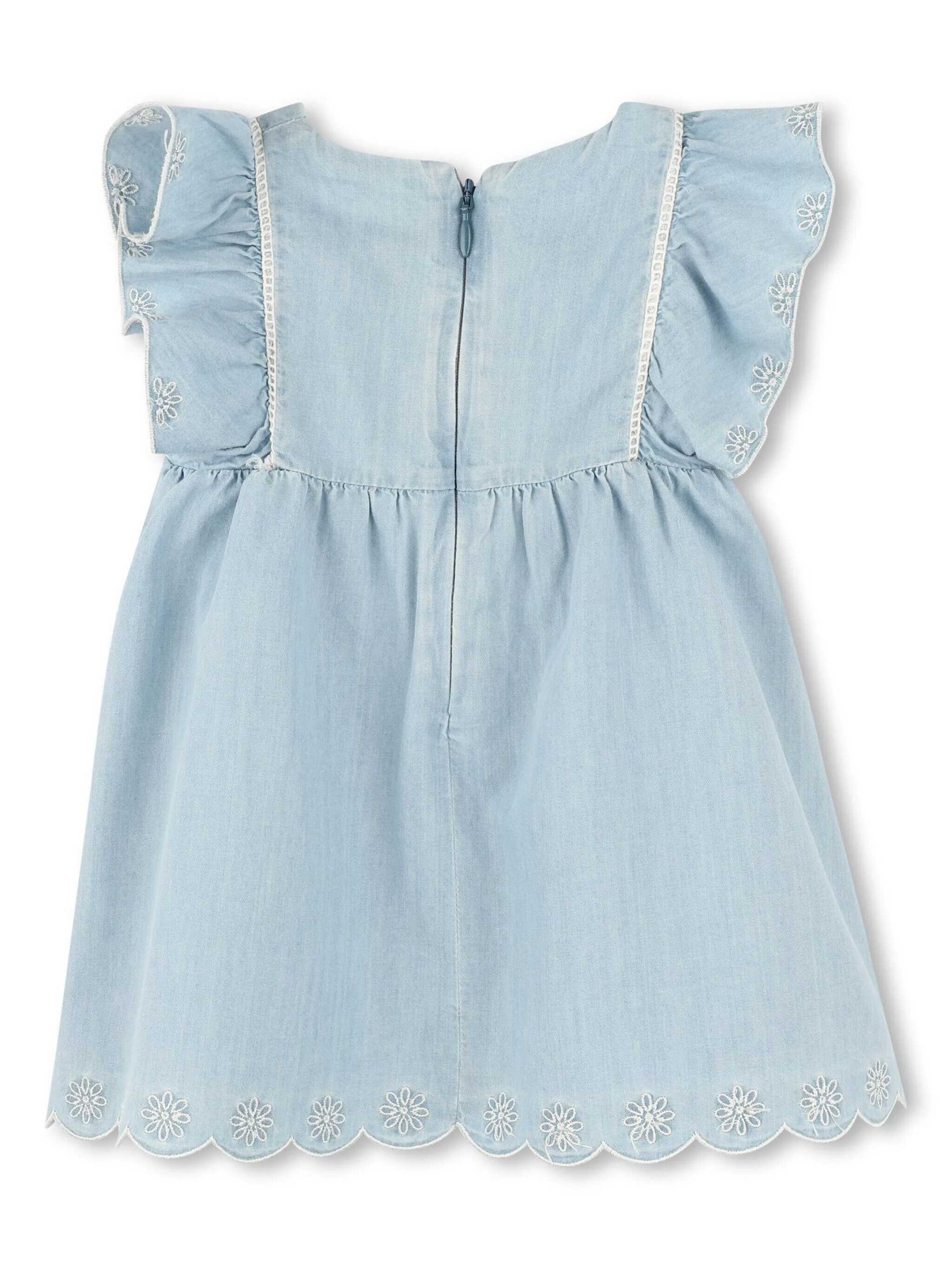 Set of dress and hat in 100% organic cotton light denim. Lined with organic cotton percale. Invisible zip back closure. Flower pattern embroidery detail. Chlo� embroidery at front chest.