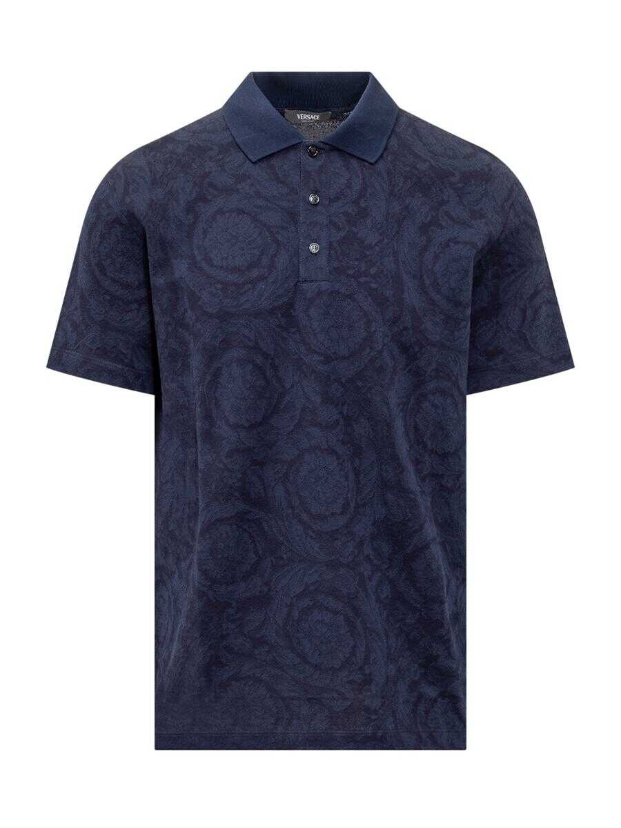 Blue polo shirt with classic collar. Button closure. Baroque motif in jacquard.