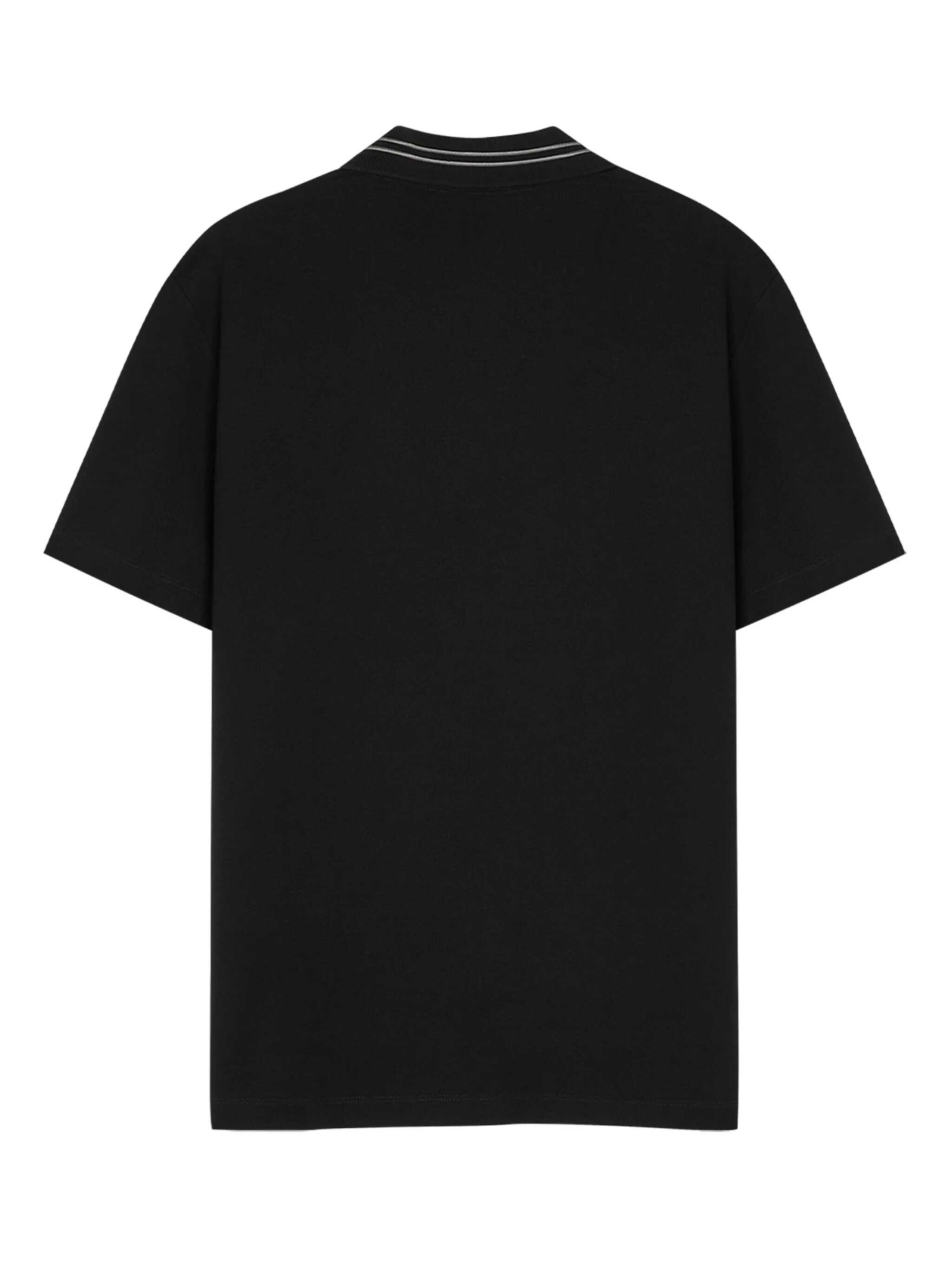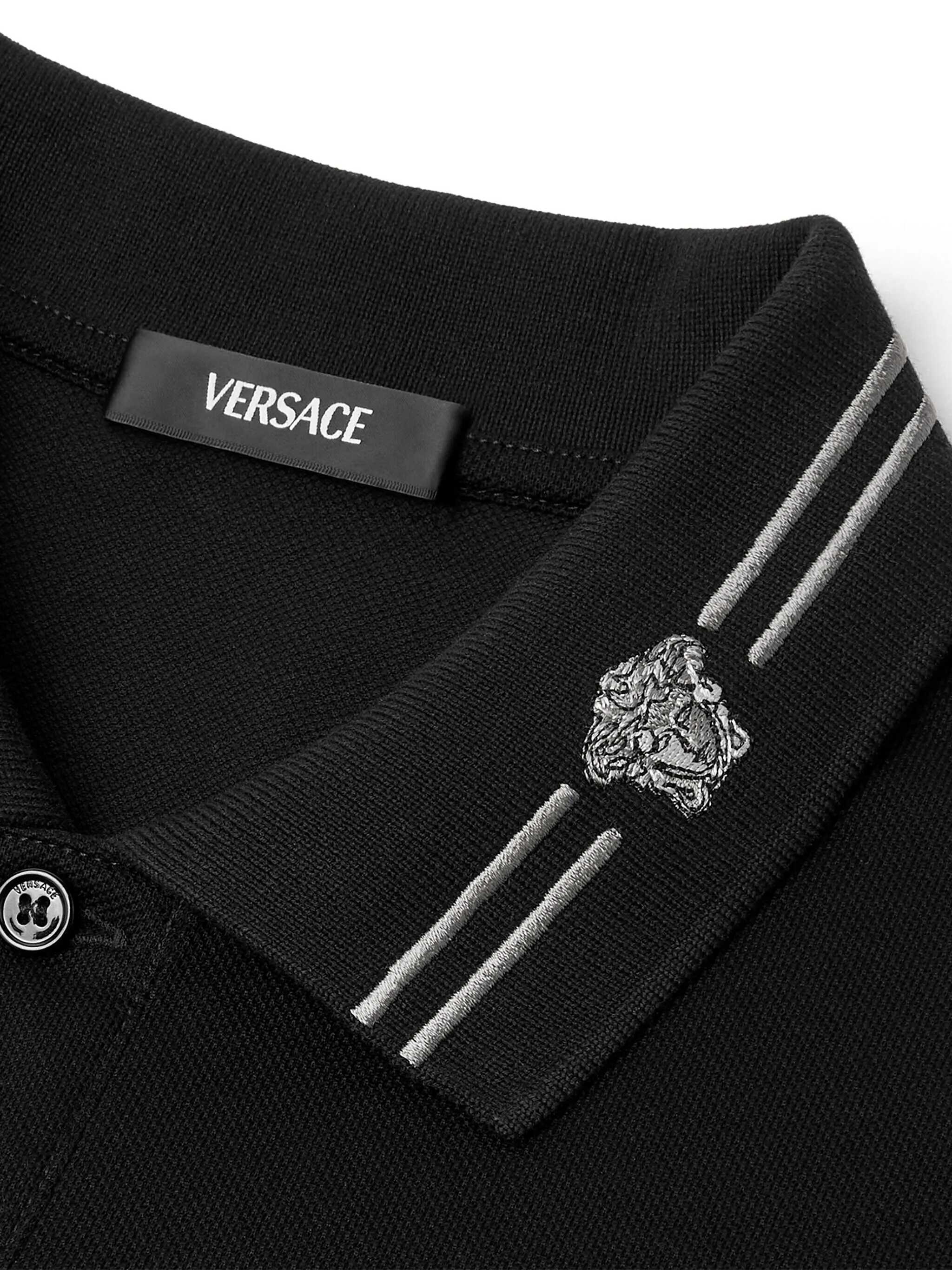 Black polo shirt with classic collar. Medusa logo embroidered. Button closure.