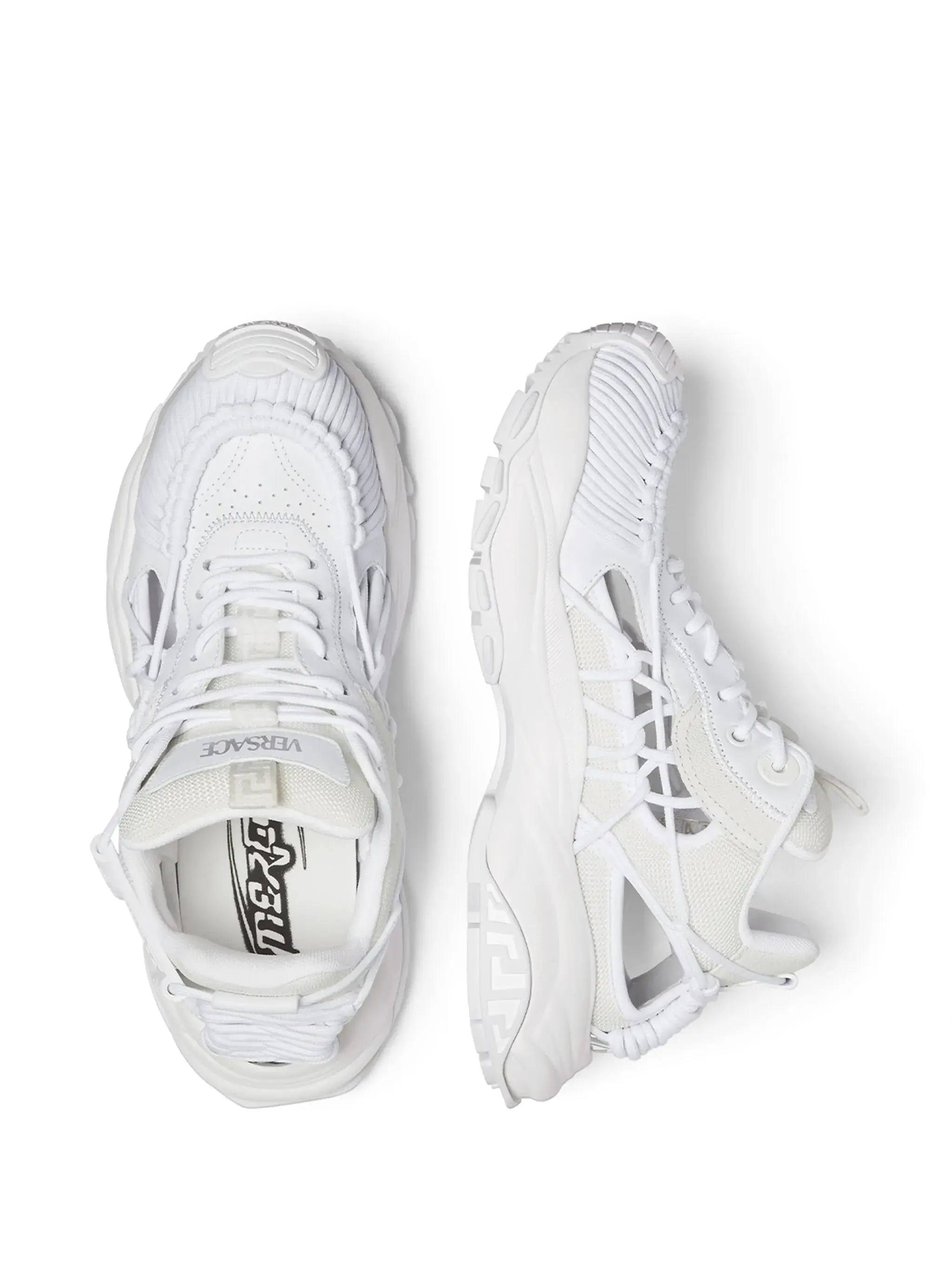 White sneakers from Versace featuring round toe, cotton laces, oversize sole and lateral details.