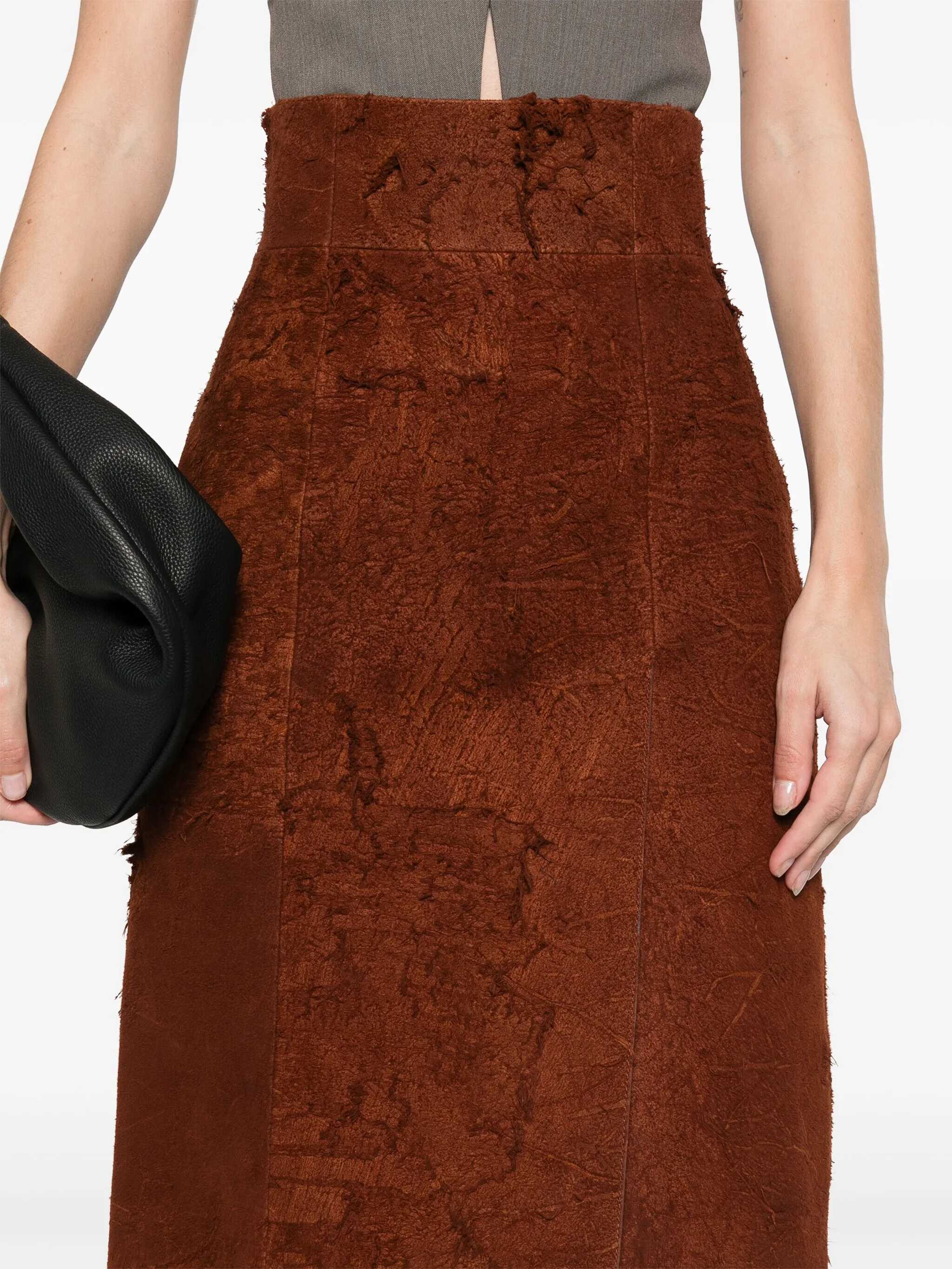 Chestnut brown suede pencil skirt from Alexander McQueen featuring rear zip fastening and front slit. Elegant and versatile, this suede pencil skirt offers a sophisticated silhouette, perfect for both formal and casual occasions. Discover the timeless style and craftsmanship of Alexander McQueen