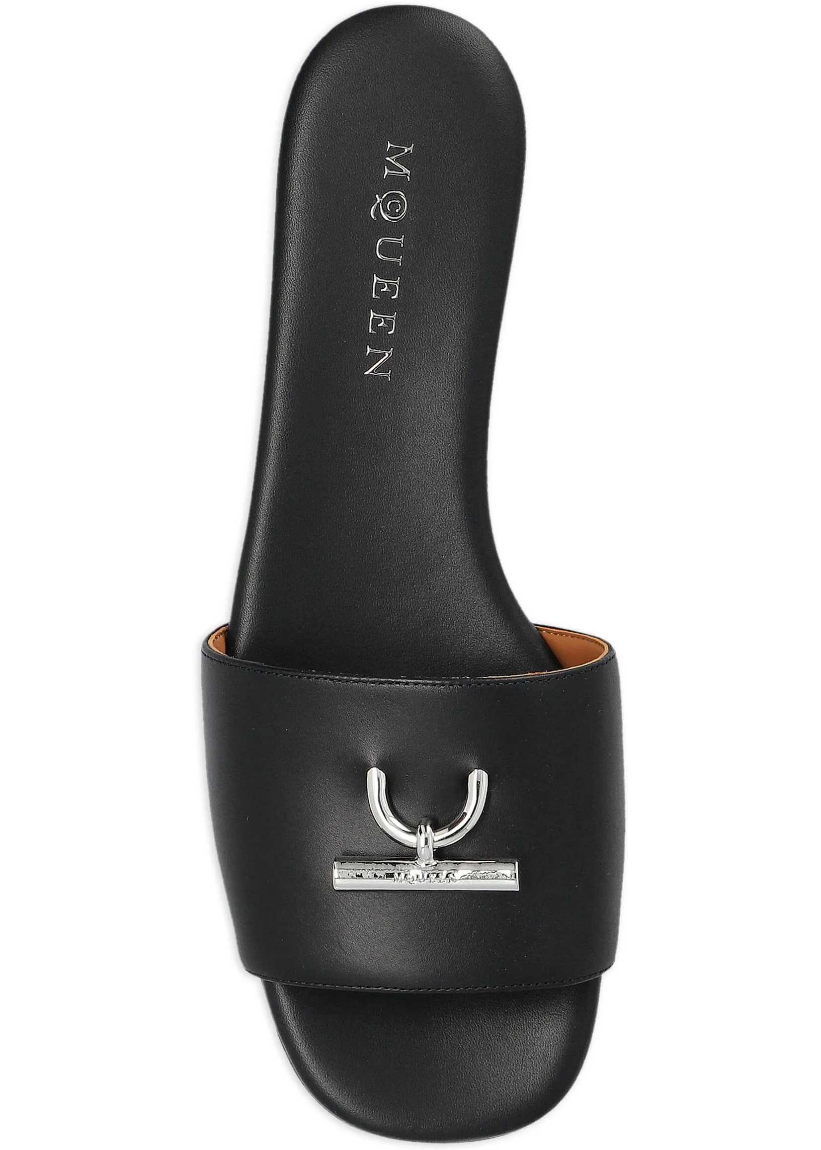 Alexander McQueen's leather Sandals combine elegance with contemporary design. The squared toe gives a modern touch, while the metal plaque on the front strap adds a distinctive detail. The logoed insole enhances the brand's craftsmanship, complemented by the flat sole for everyday comfort.