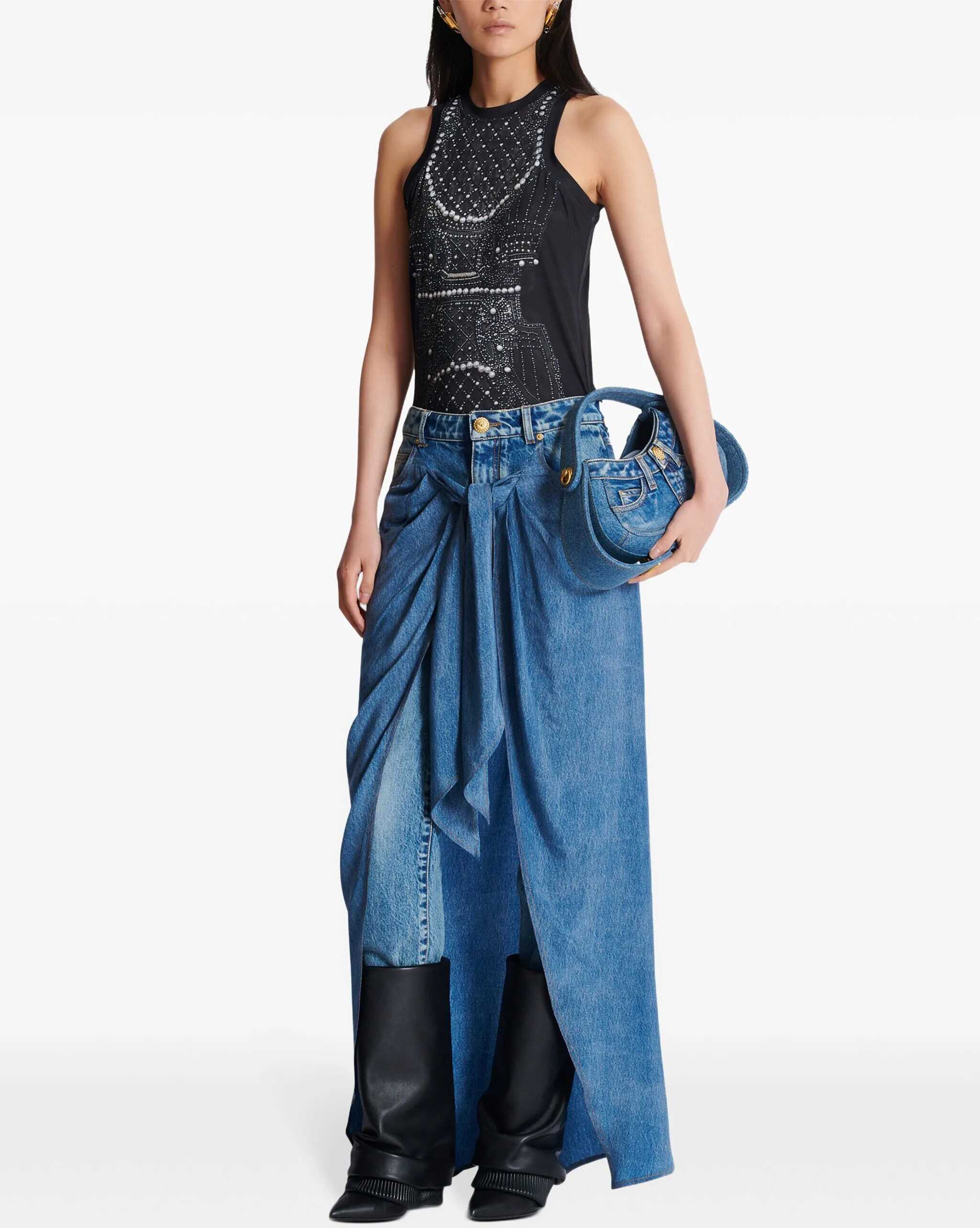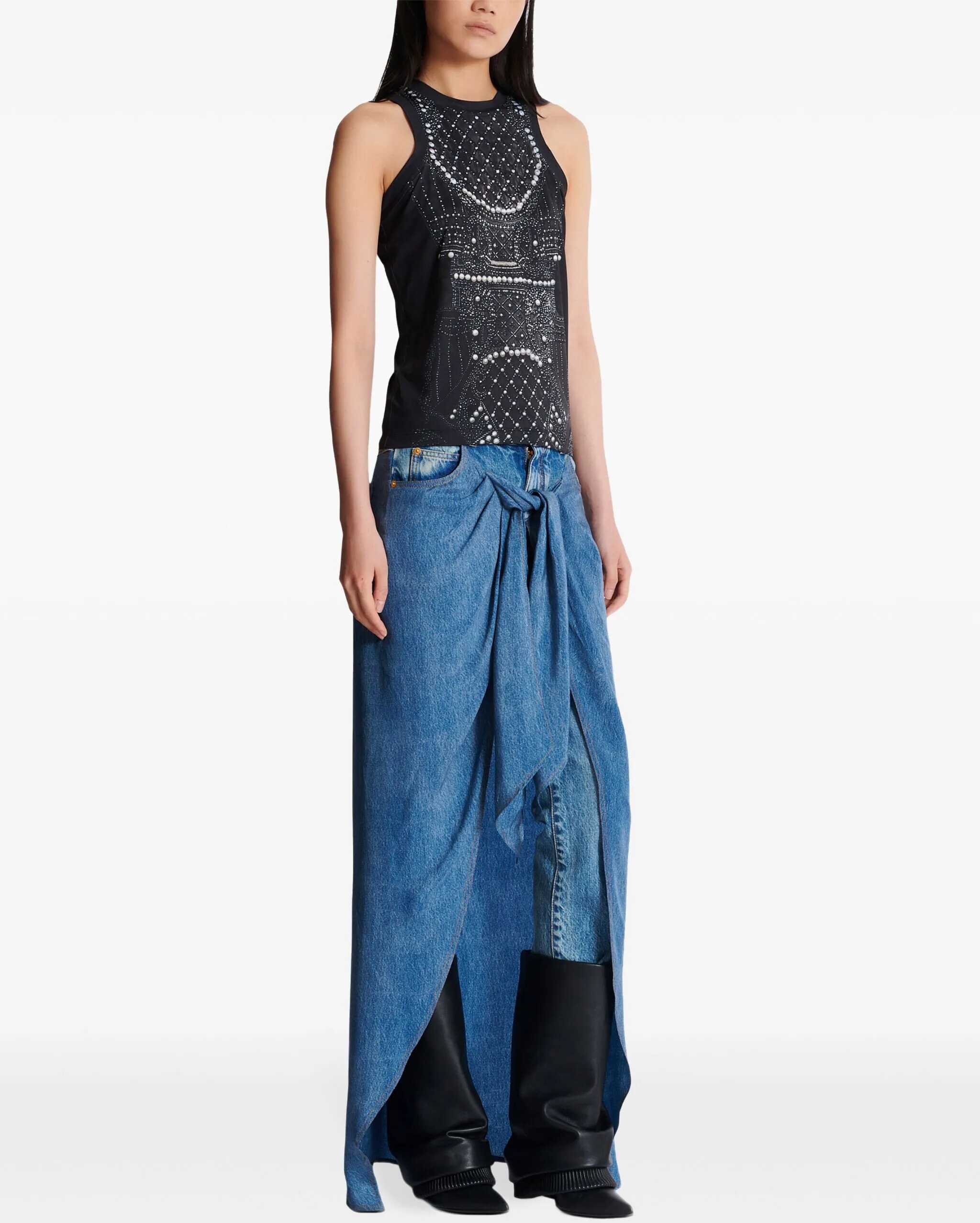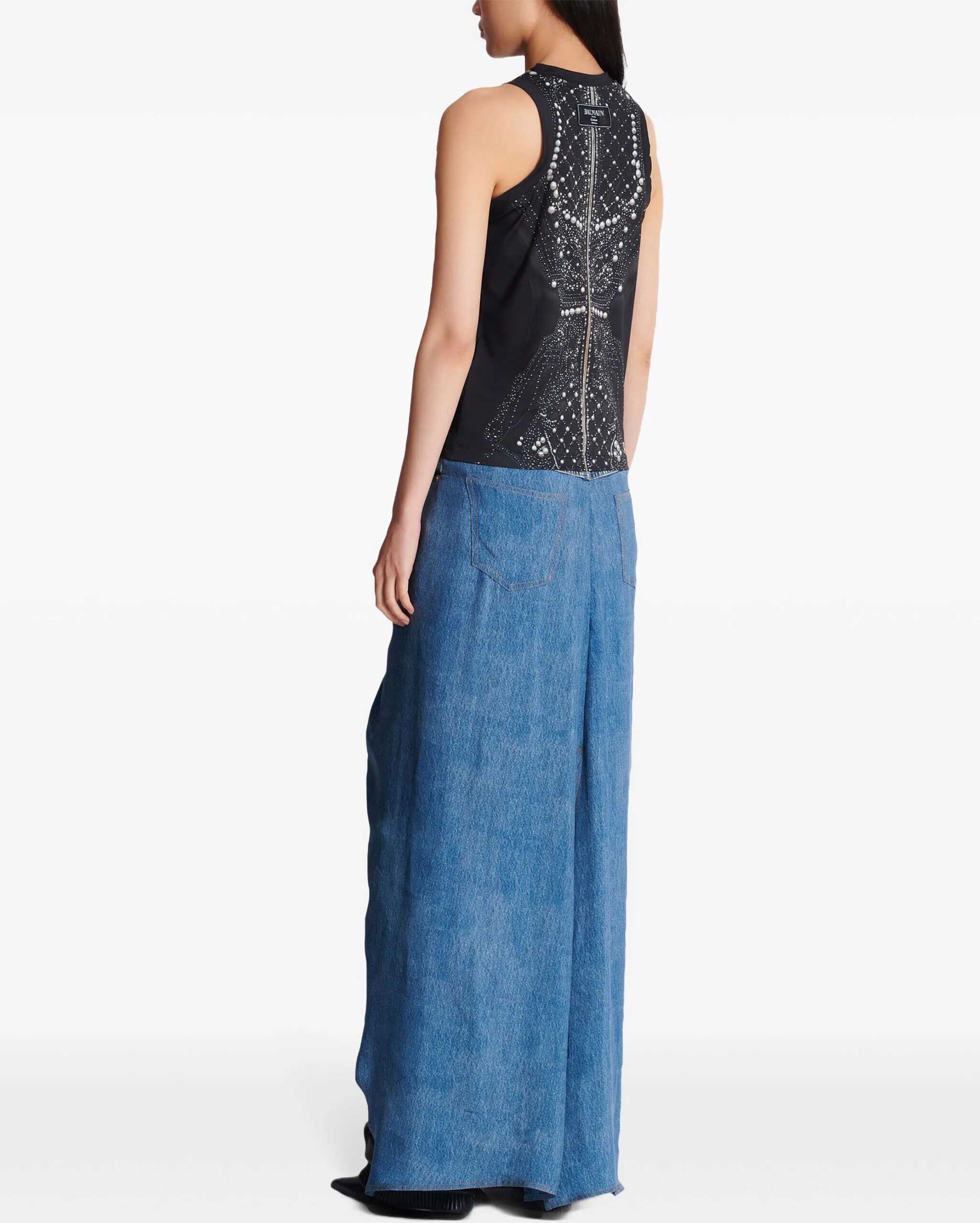 Balmain's sleeveless round-neck Top features a contrasting printed trompe-l'œil pattern on both the front and back, creating a striking and modern visual effect. The Balmain Couture fabric label on the back adds a detail of high tailoring and authenticity, giving the garment an exclusive touch. It is an elegant and sophisticated choice, ideal for those seeking a refined look with an accent of originality.