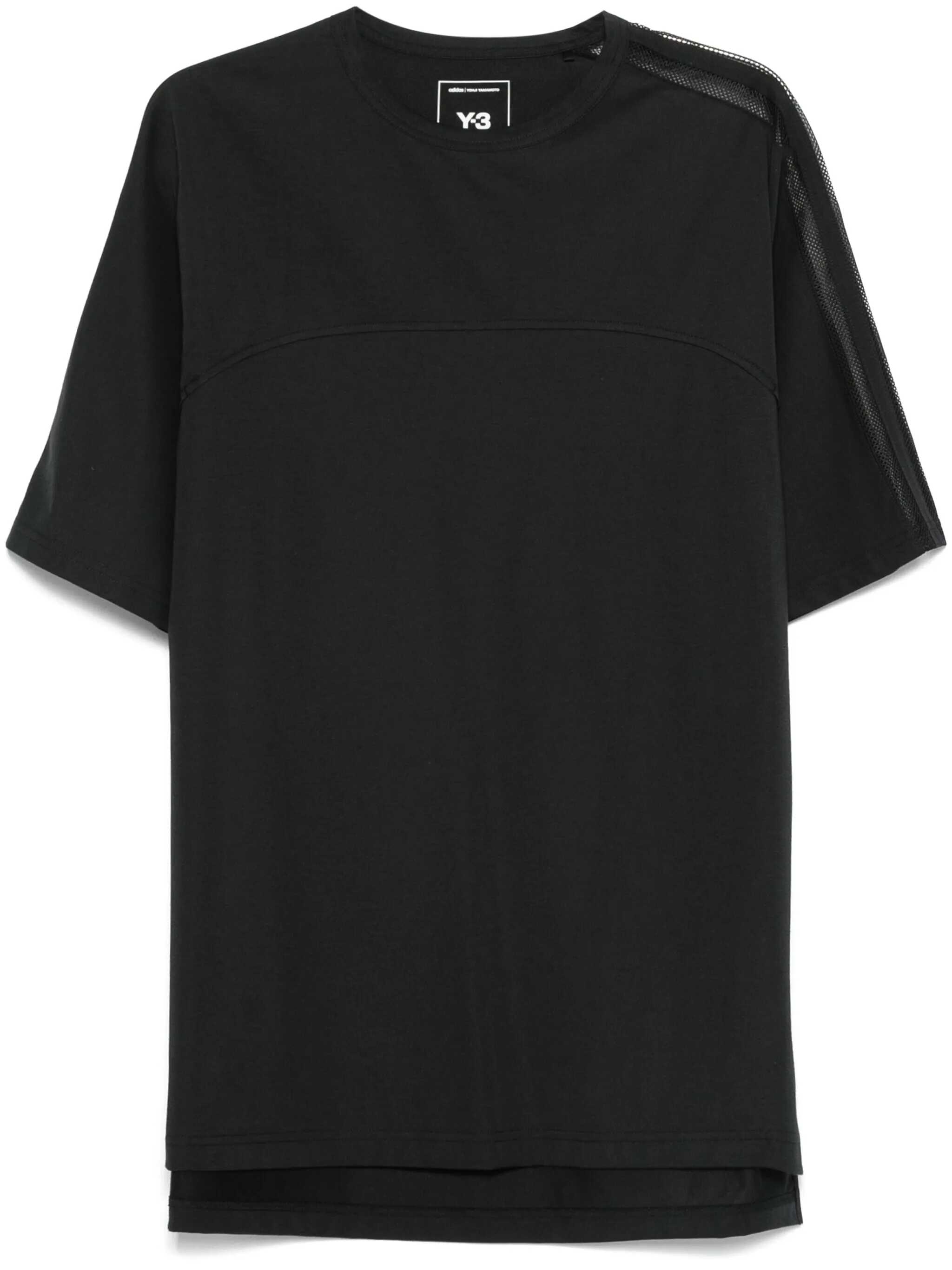'Y-3 Mesh Stripes Short Sleeve' cotton blend T-shirt with mesh details, crew neck, short sleeves with dropped shoulders, asymmetrical hem.