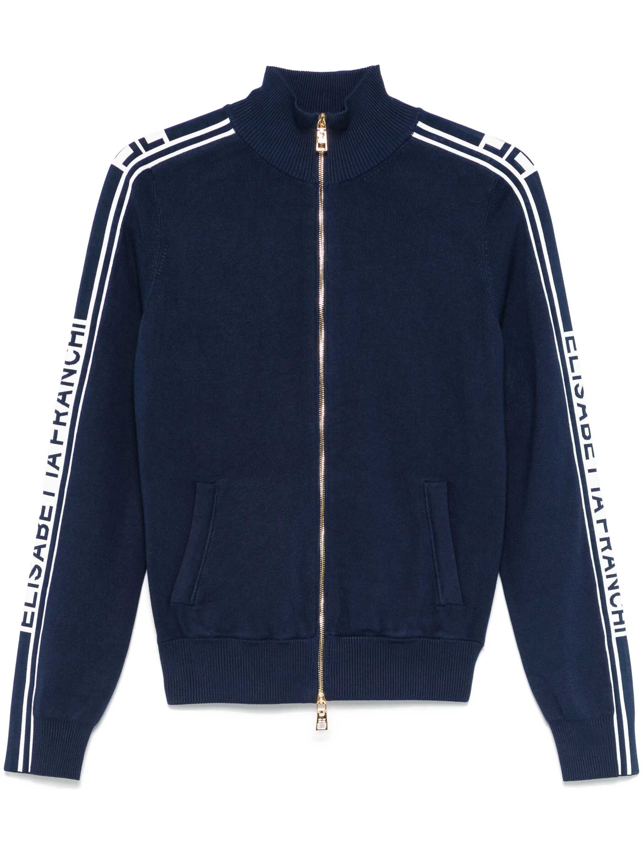 Long-sleeved viscose cardigan features contrasting logo bands that add a graphic touch on the sleeves and sides. The garment features front pockets and gold metal zipper closure with logo on the slider. Regular fit. A versatile garment that combines comfort and style.