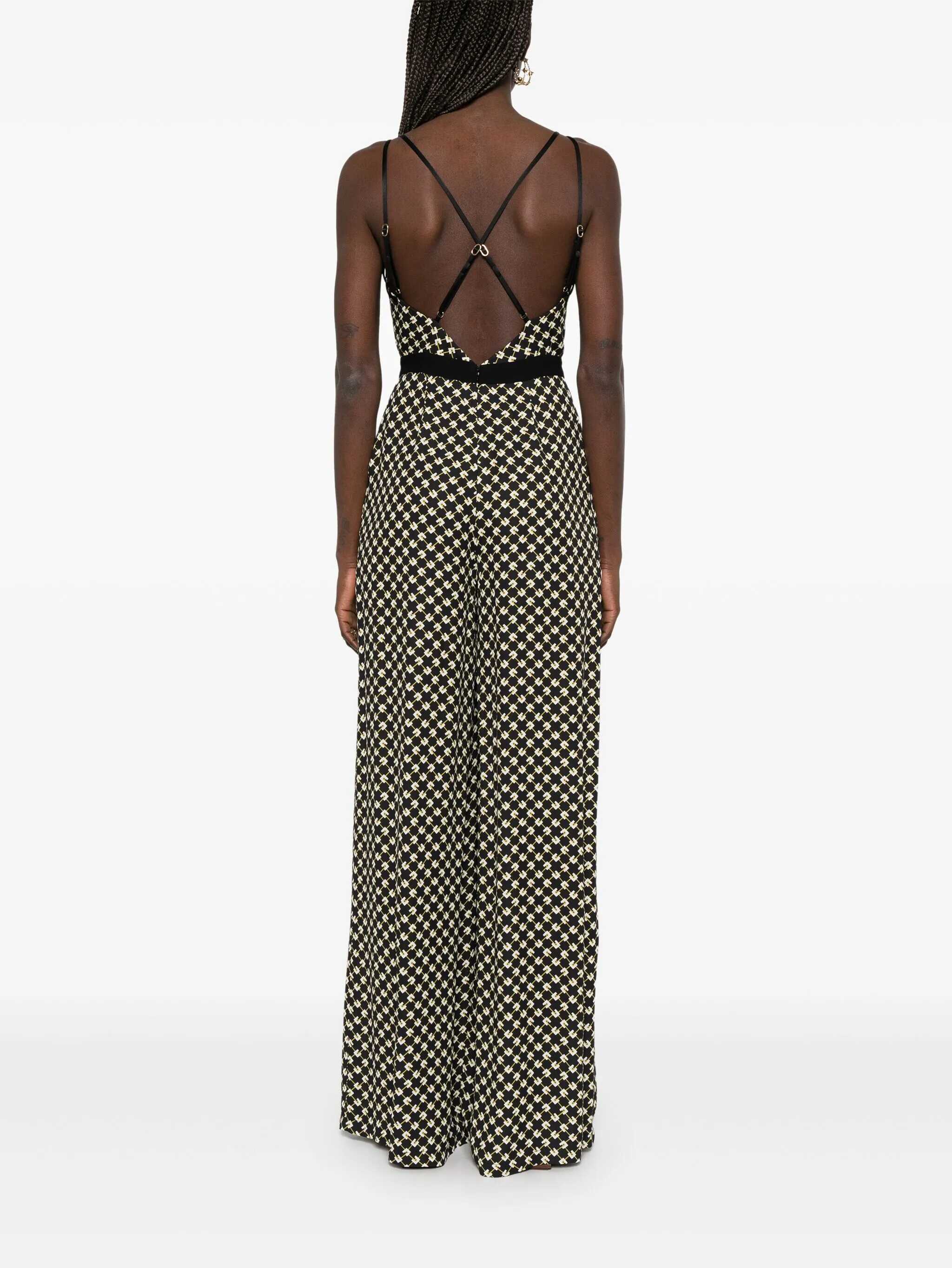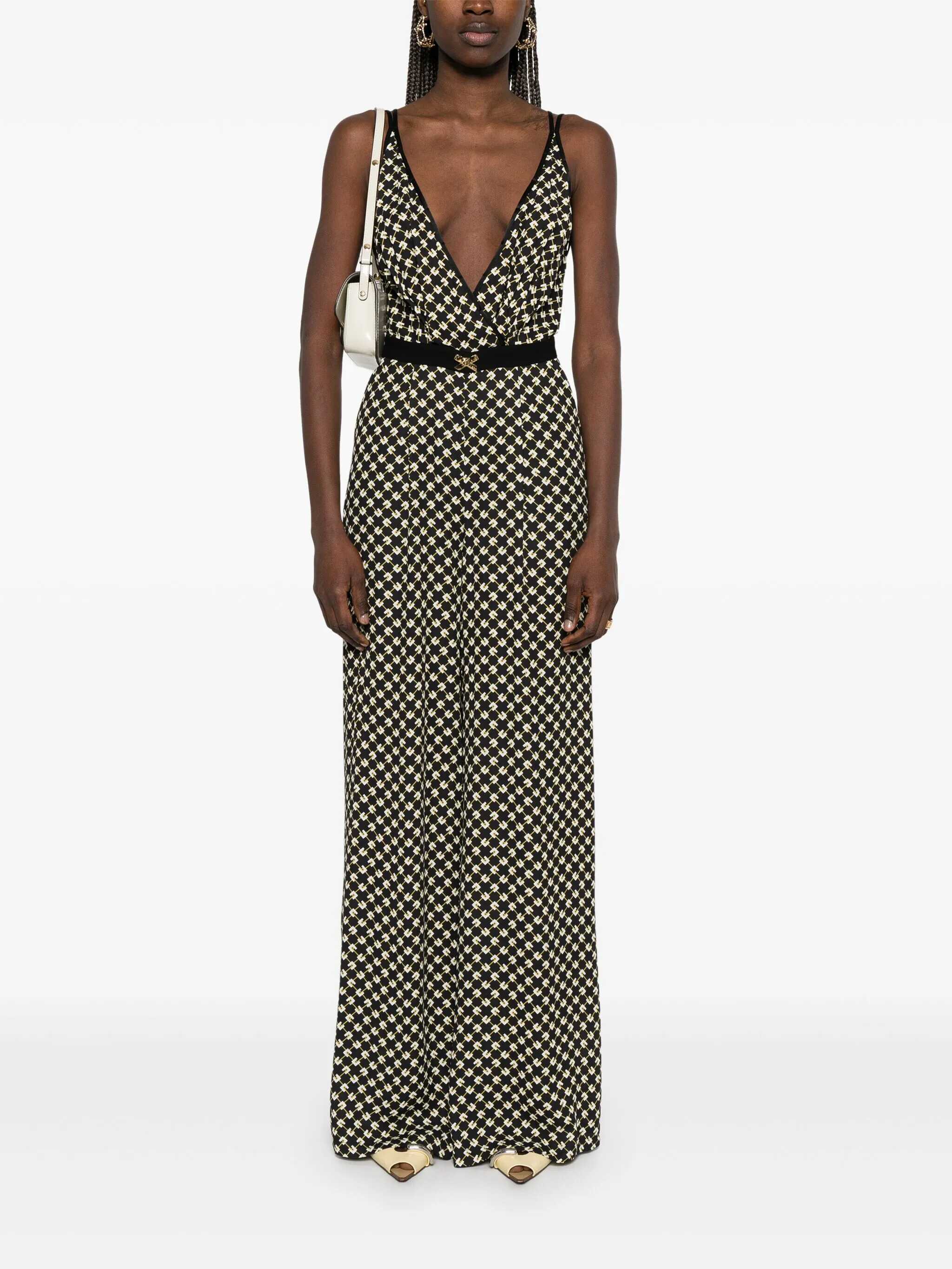Georgette jumpsuit with wrap neckline and palazzo trousers. It stands out for the all-over print with a diamond pattern which gives movement to the fit. The belt highlights the waist and is illuminated by the jewel bow with logo. Slim fit