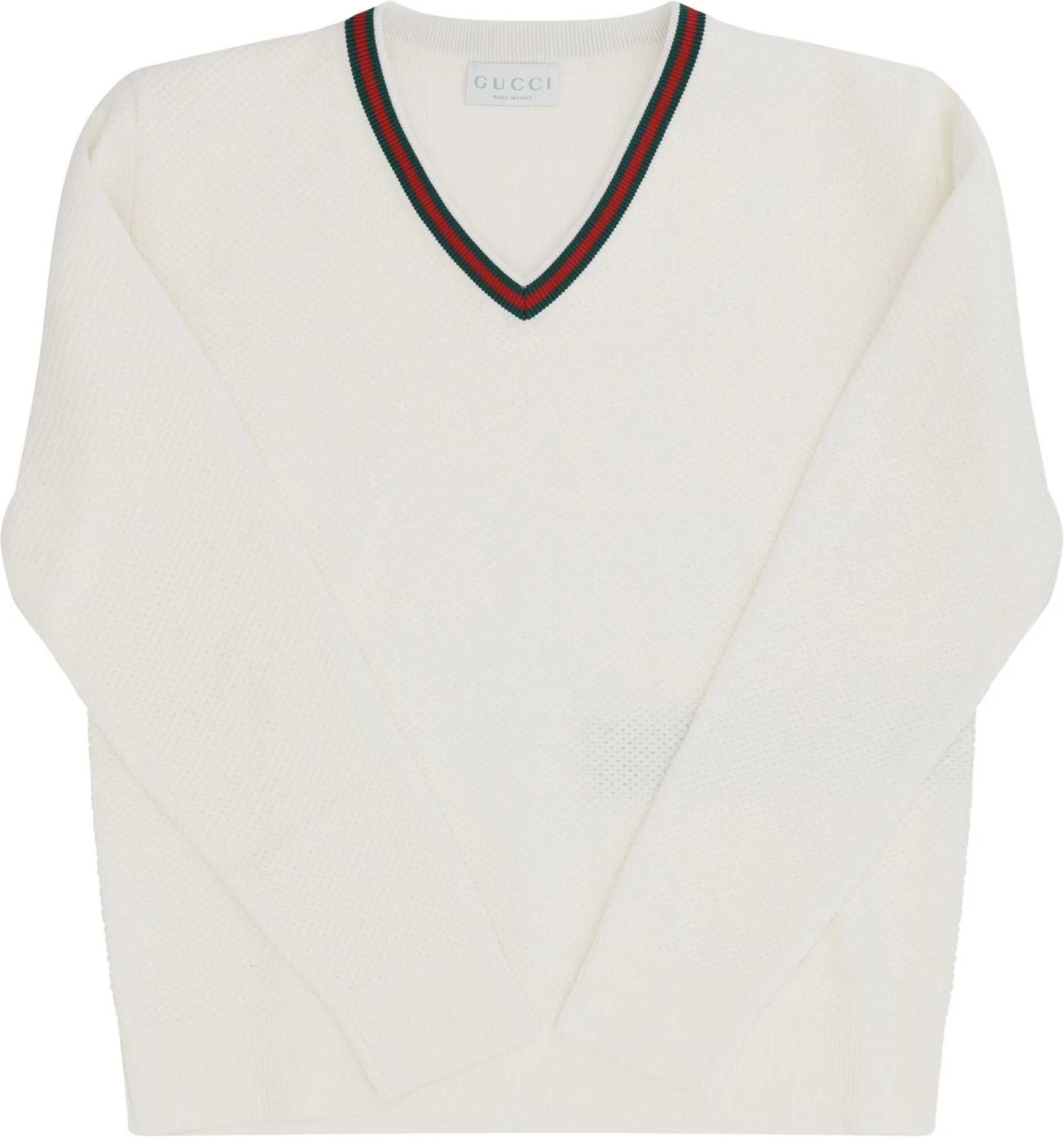 Gucci's Children's Sweater features a sleek, distinctive design with a perforated knit that provides a fresh, lightweight look. The V-neck adds a touch of sophistication, while contrasting hems in the brand's iconic colors recall Gucci's celebrated style, offering a lively, recognizable detail. Ribbed cuffs and hem ensure a comfortable fit and a good fit, while maintaining the sweater's shape.