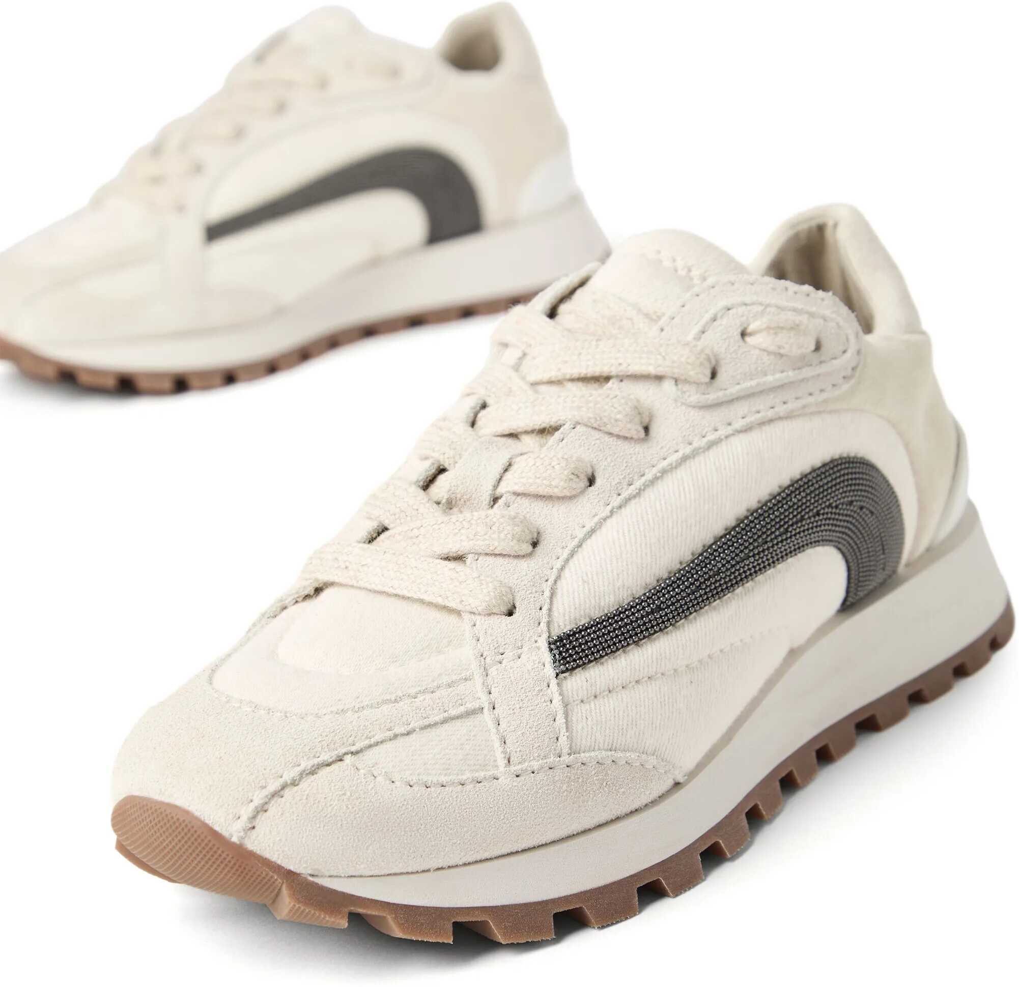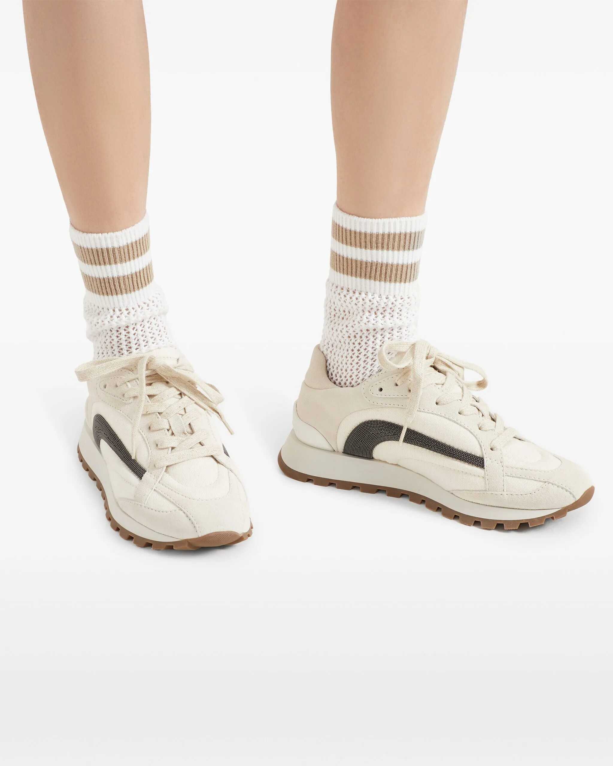 Leather Sneakers by Brunello Cucinelli featuring a round toe, suede detailing, a lace-up front fastening, a textured ridged sole, and a logo-embossed insole.