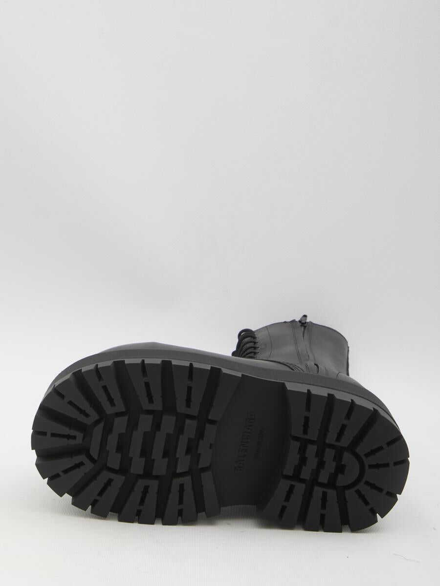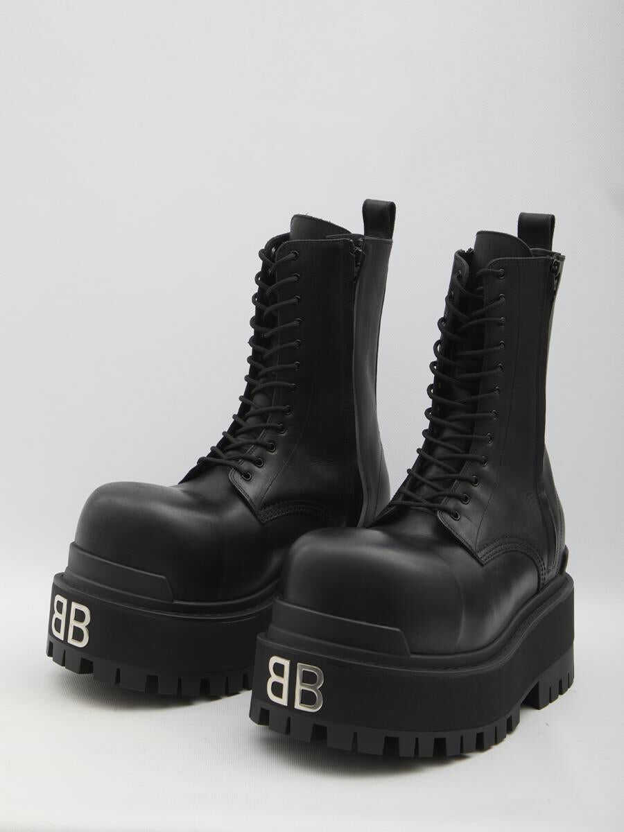 Giant boots in soft black calfskin leather with a worn effect. They feature an ultra-round toe, internal and external zip closures with bellows, a laced upper with twelve eyelets, a BB logo on the front of the sole, a heel tab, and a thick rubber treaded sole. Loose fit. Dust bag included. Any imperfections in the leather should not be considered manufacturing defects, but a characteristic of the material.