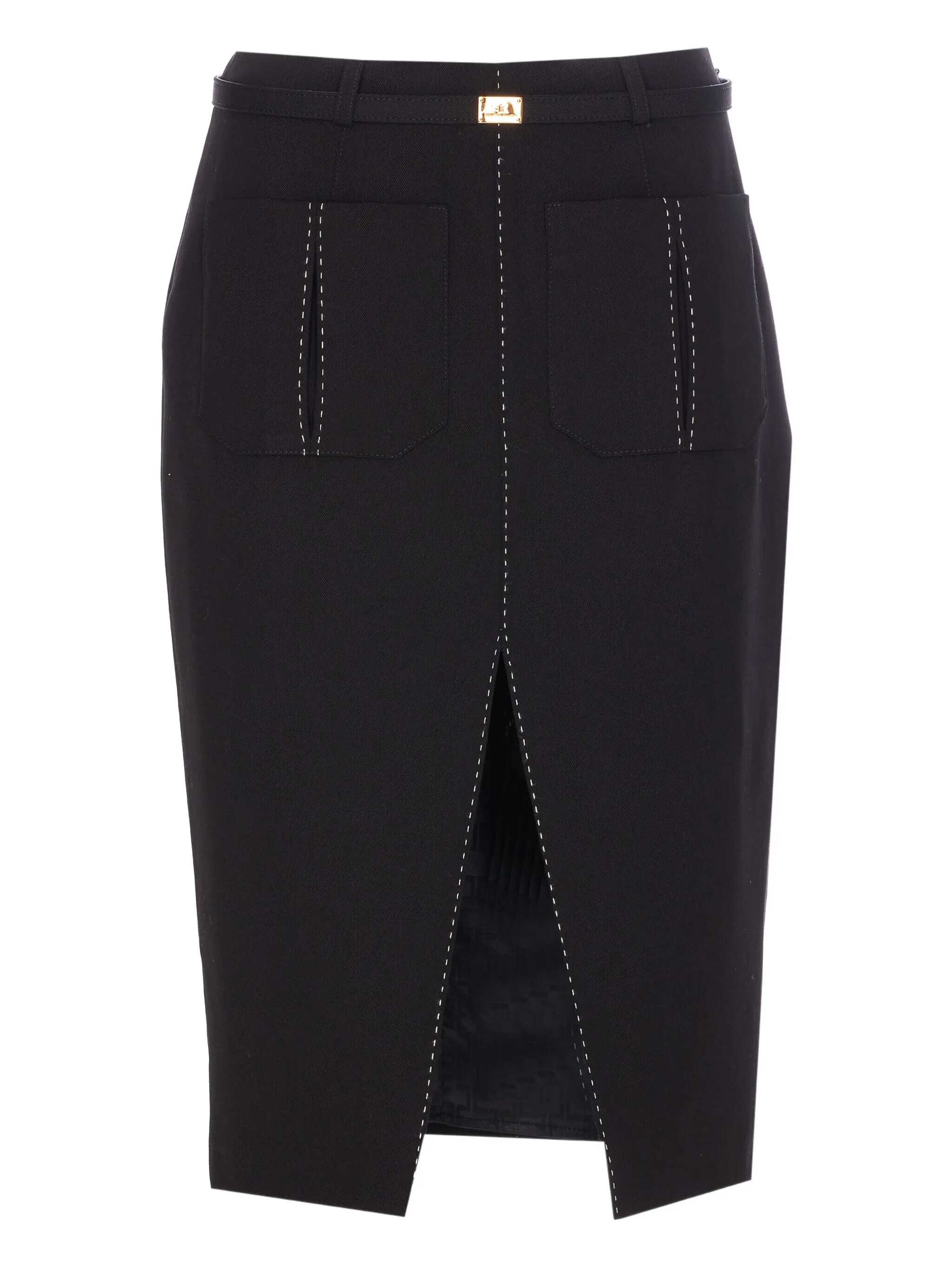 Elisabetta Franchi Black Belted Skirt, Lateral Zip Closure, Belt With Plaque Logo On Waist, Mini Split On The Front, 2 Pockets On The Front, EU SIZE (IT)