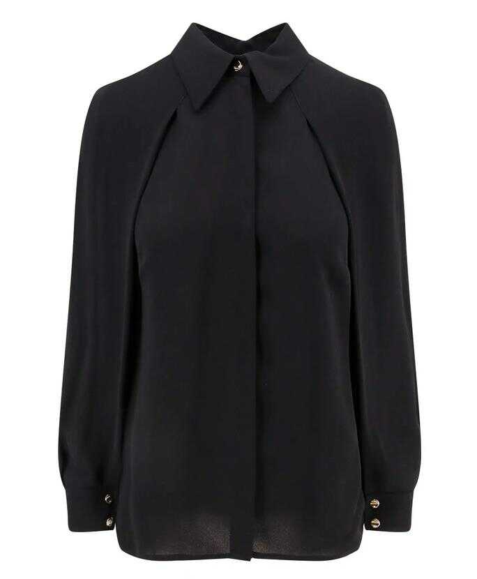 Regular shirt in viscose georgette with a relaxed fit. The garment stands out for its cape sleeves, held at the wrists with golden metal buttons with logo. A final precious touch is given by the crossbody necklace with bow, entirely removable