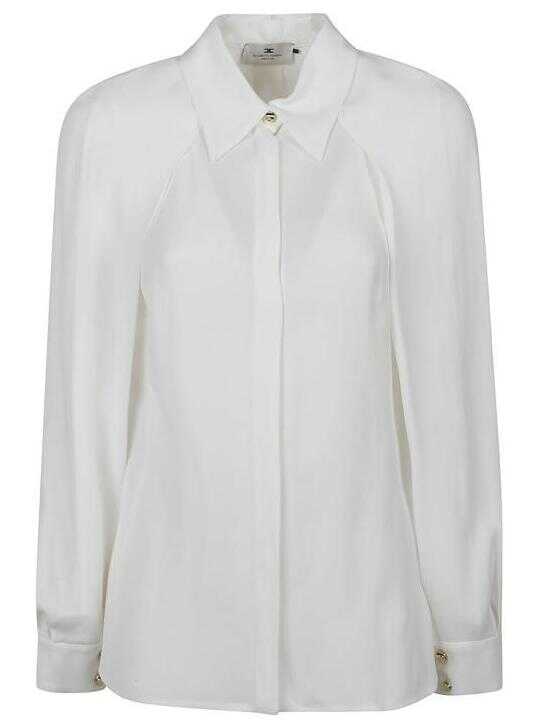 Regular shirt in viscose georgette with a relaxed fit. The garment stands out for its cape sleeves, held at the wrists with golden metal buttons with logo. A final precious touch is given by the crossbody necklace with bow, entirely removable