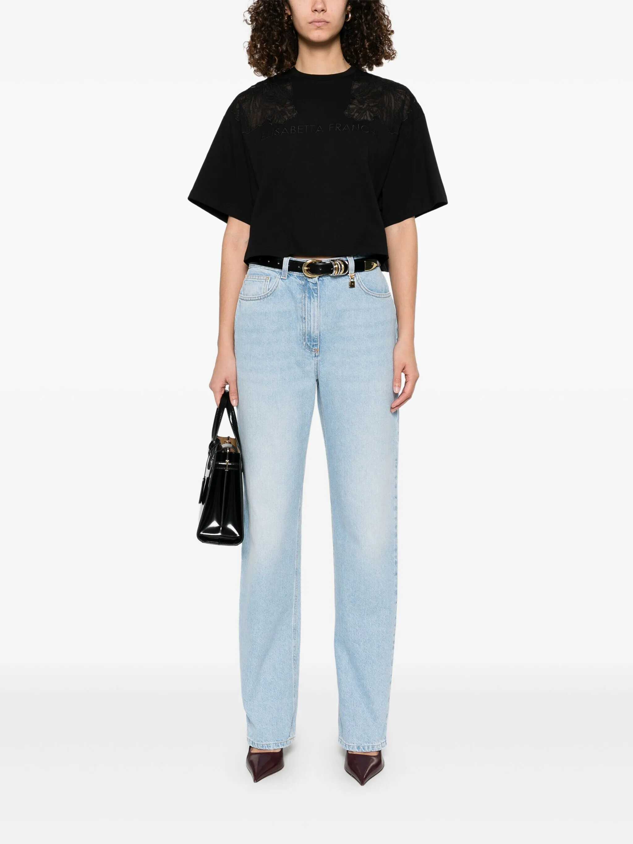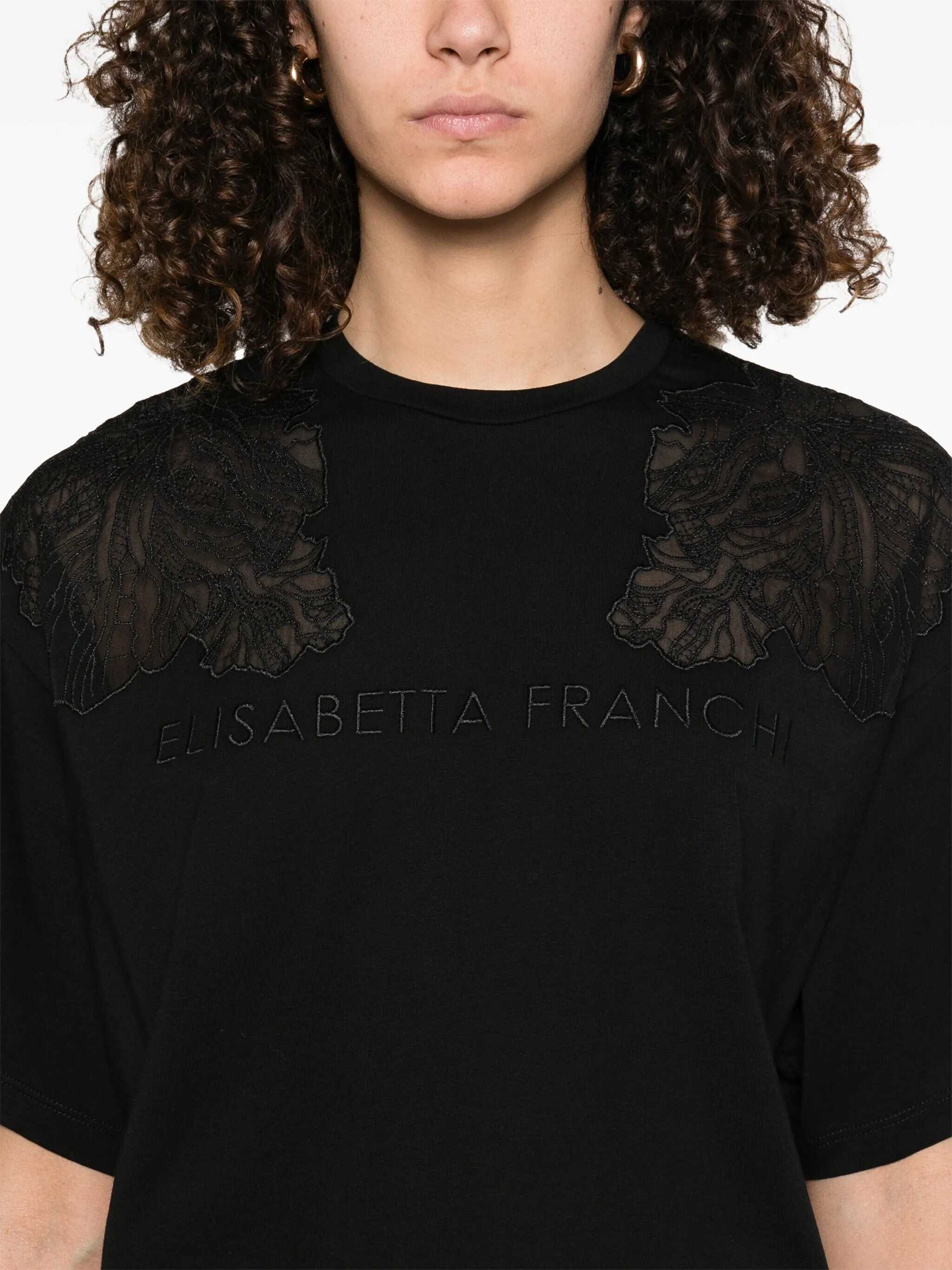 The shirt is made of cotton with a contrasting color logo embroidered on the front. It is a crop model, with crew neck, short sleeves and detail on the shoulders