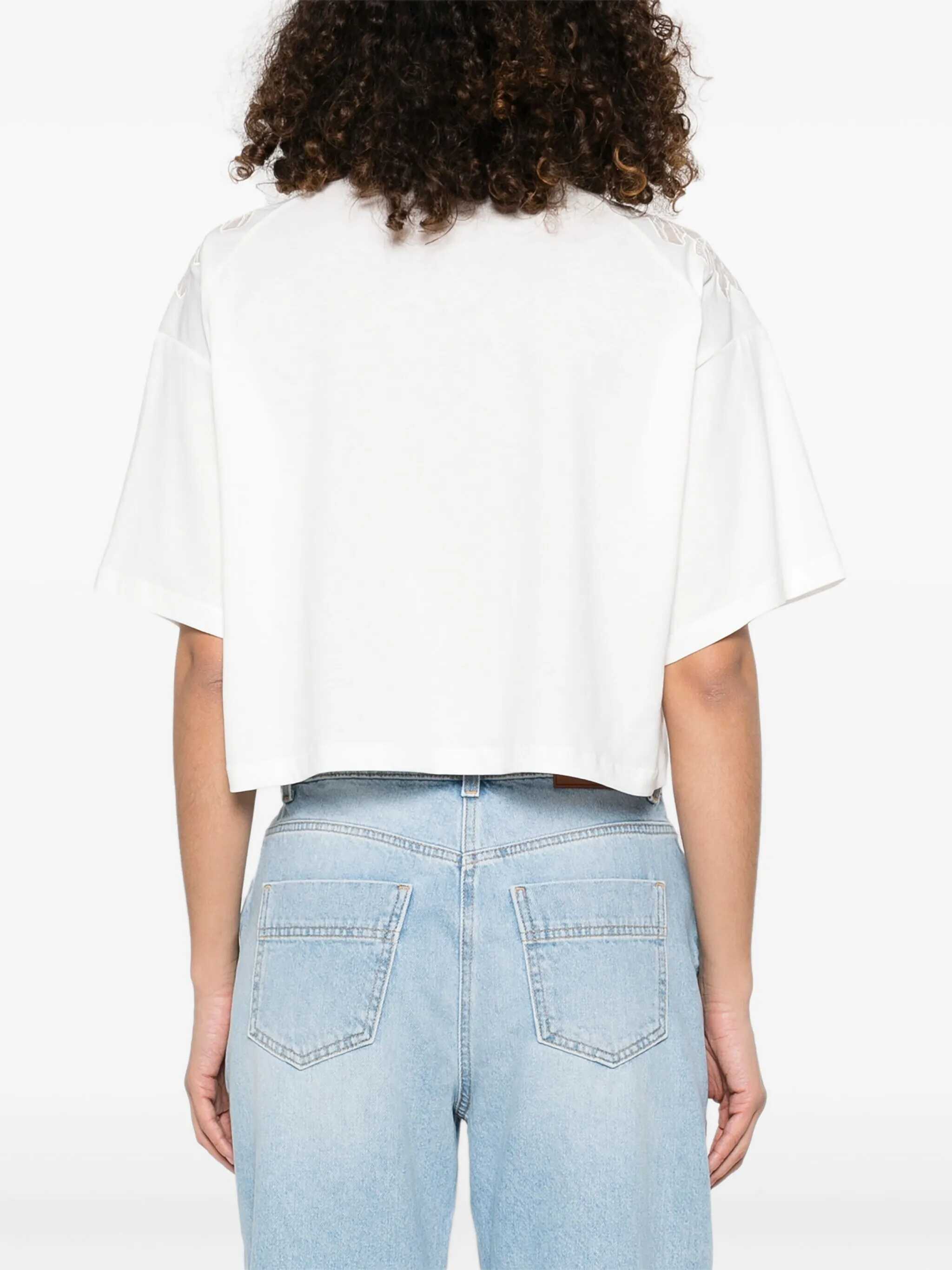 The shirt is made of cotton with a contrasting color logo embroidered on the front. It is a crop model, with crew neck, short sleeves and detail on the shoulders