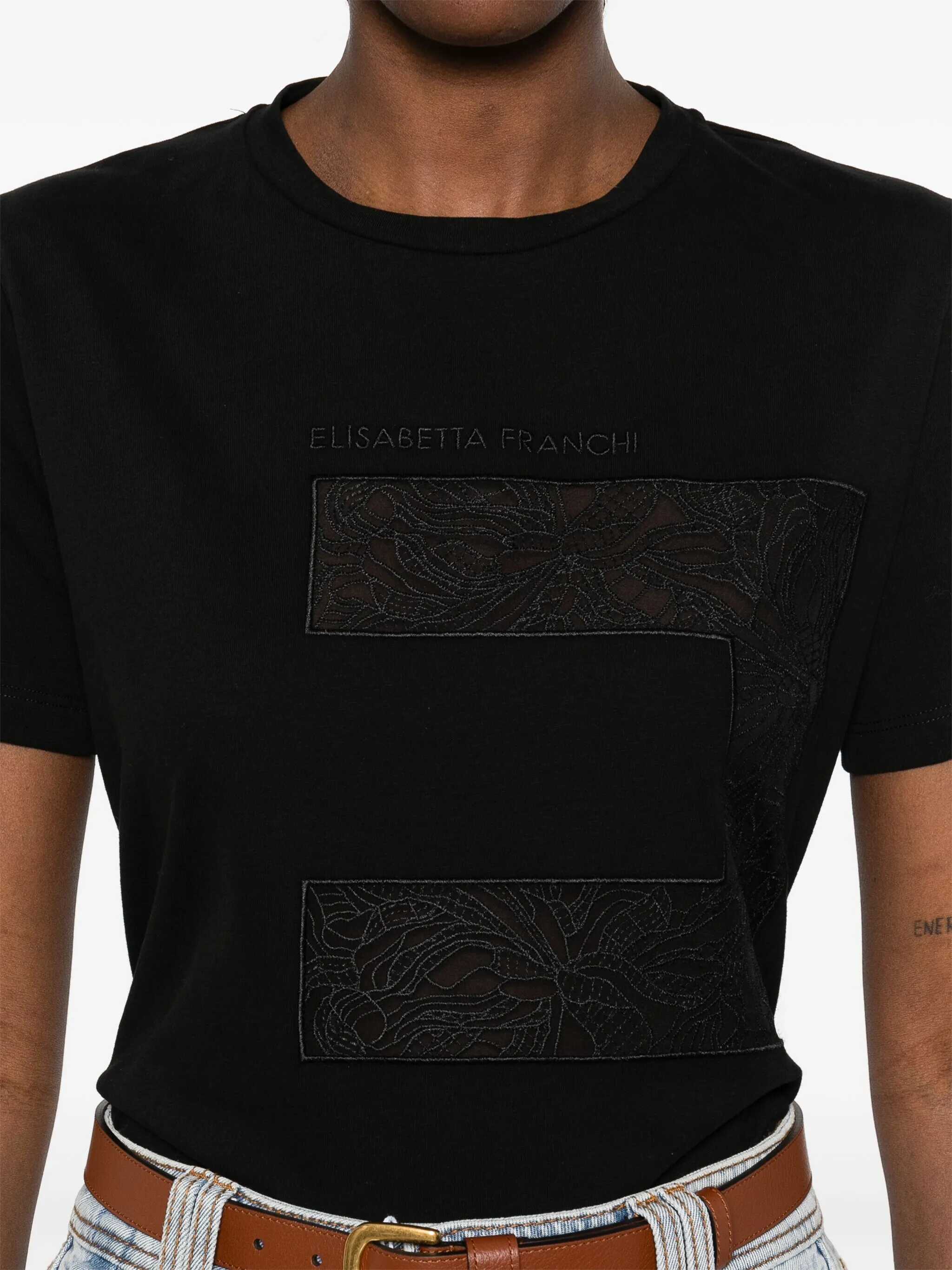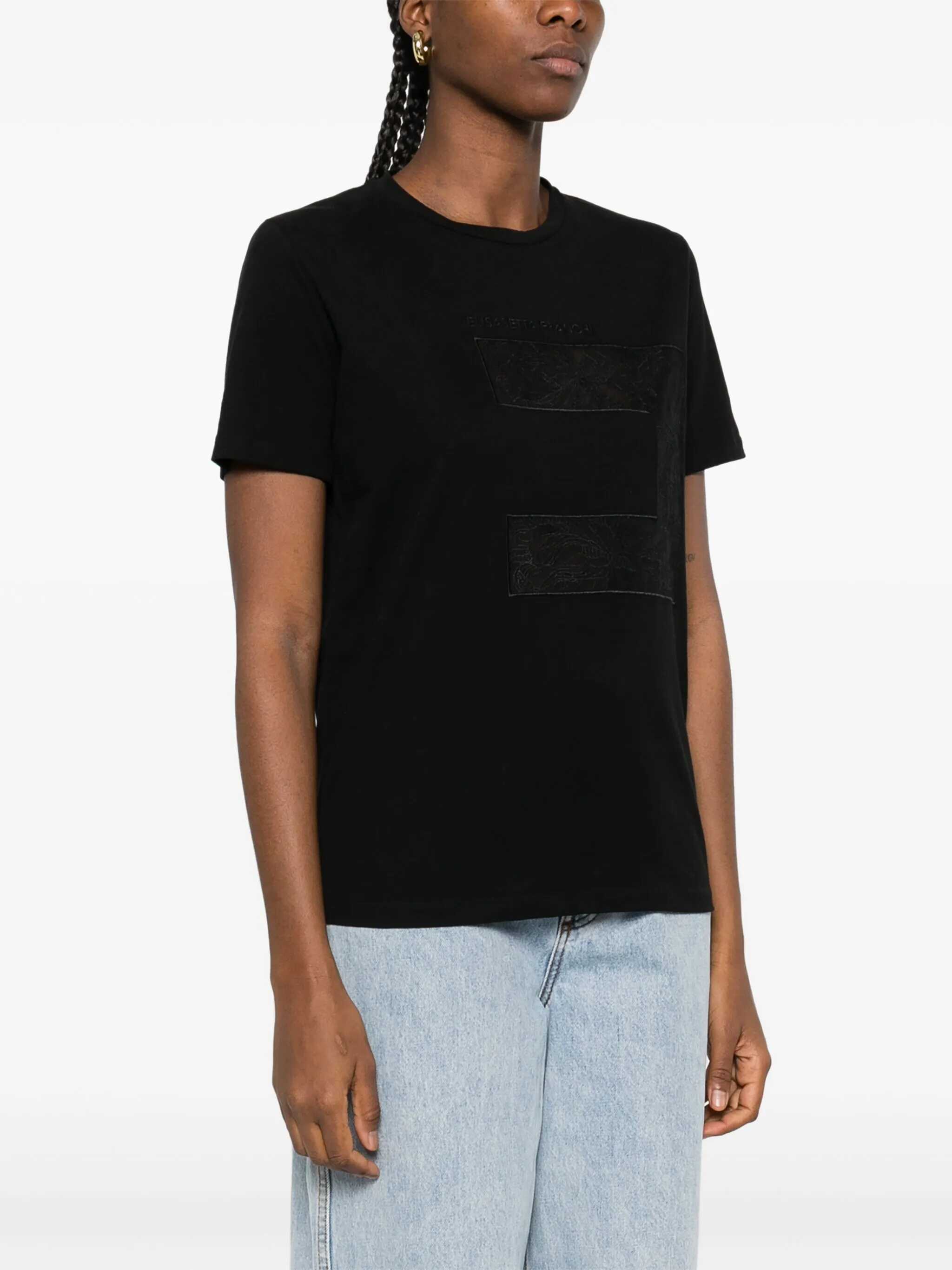Short-sleeved jersey t-shirt with regular fit. The embroidered voile macro logo decorates the front and back of the garment with a floral theme.