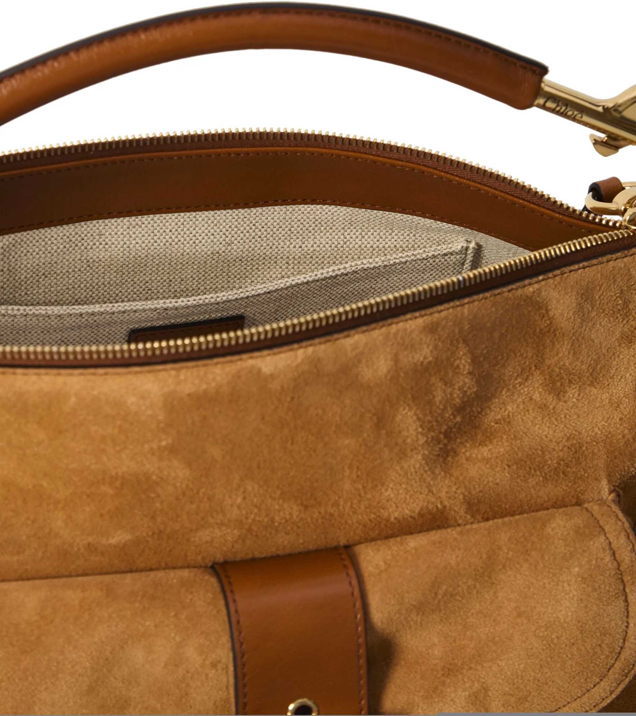 Medium Camera Bag in chestnut-colored suede calfskin leather. It features an adjustable and removable shoulder strap, a removable handle, zip closure, two double side pockets with flap and zip closures, a front pocket with a magnetic flap closure and Paddington buckle, a main internal compartment, and an internal pocket with a flap. Dust bag included. Any imperfections in the leather are not defects but a characteristic of the material.