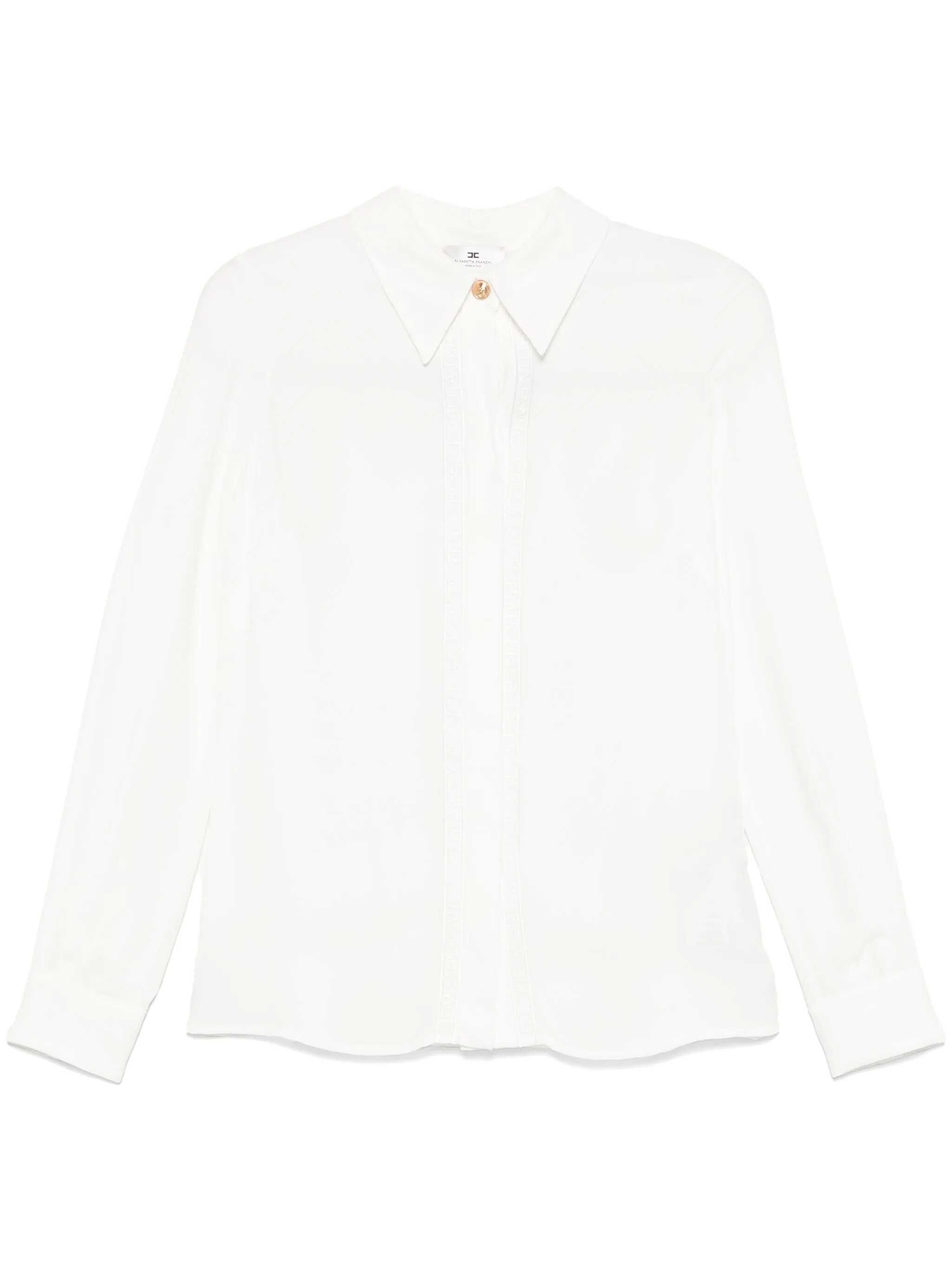 Regular-fit shirt in viscose georgette with a clean line. The garment has long sleeves and stands out for its placket decorated with organza bands embroidered with logo lettering. Notes of light with the first button visible and those on the wrists in golden shades.