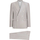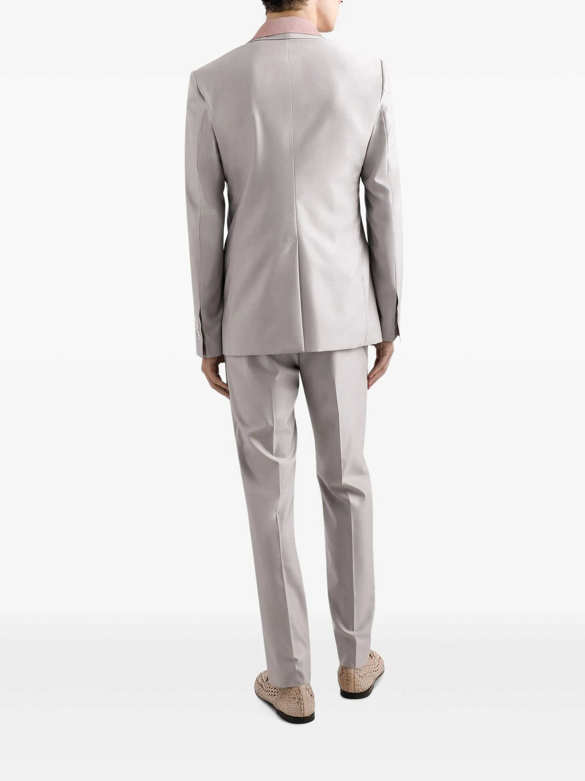 Gray wool suit. Double-breasted jacket with lapel collar. Chest pocket. Side pockets. Button closure. Pantloni with belt loops. Side pockets. Back pockets with buttons. Zipper and button closure.