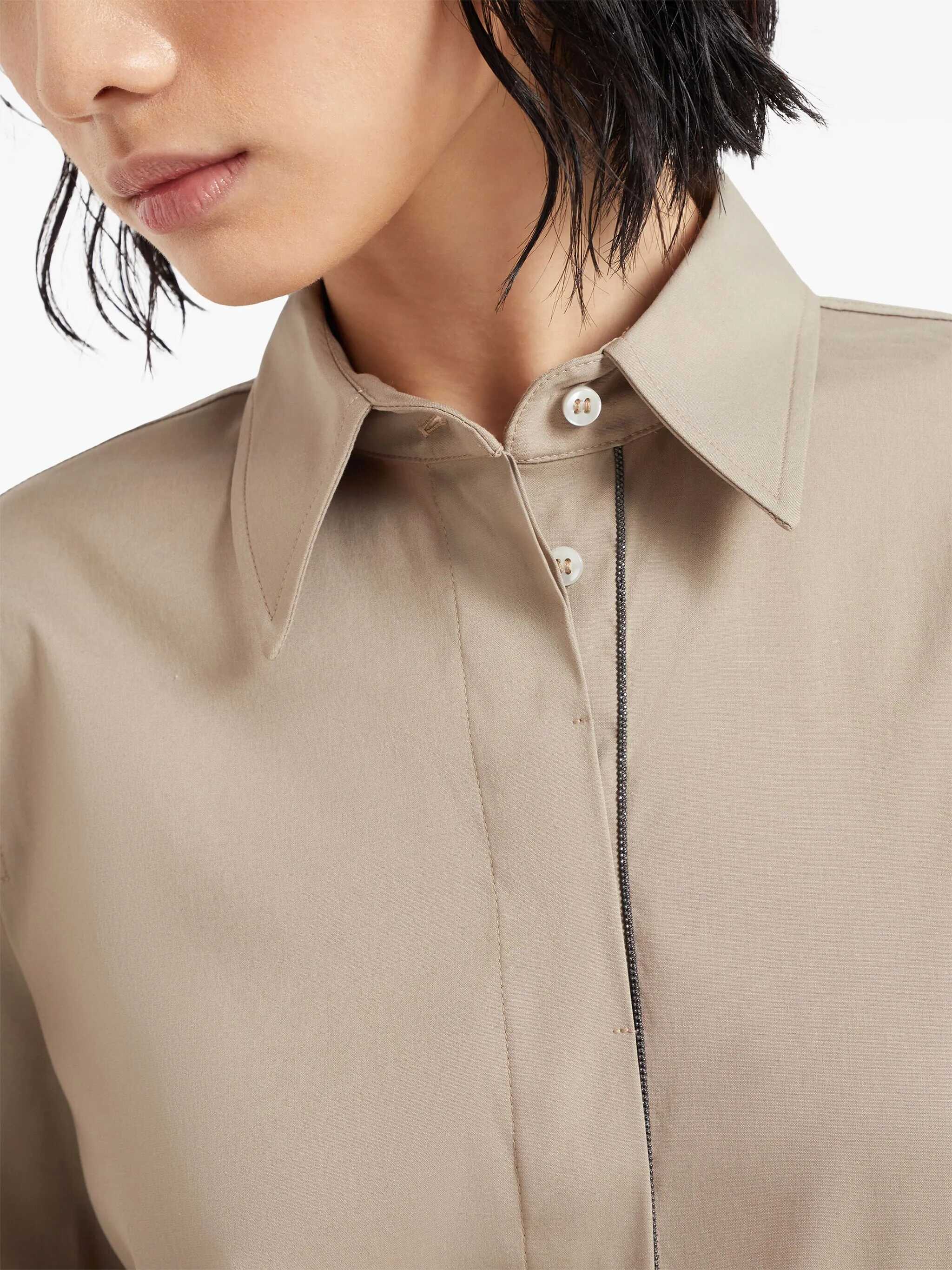 The Cotton Shirt by Brunello Cucinelli is an elegant and refined piece, characterized by a classic collar that gives it a timeless look. The front closure with hidden buttons, embellished with iconic jewels, adds a touch of luxury and sophistication. The adjustable cuffs with buttons allow you to adapt the fit for greater comfort. The monochrome pattern gives it a clean and versatile look, making this shirt perfect for both formal and casual combinations, without ever sacrificing class.