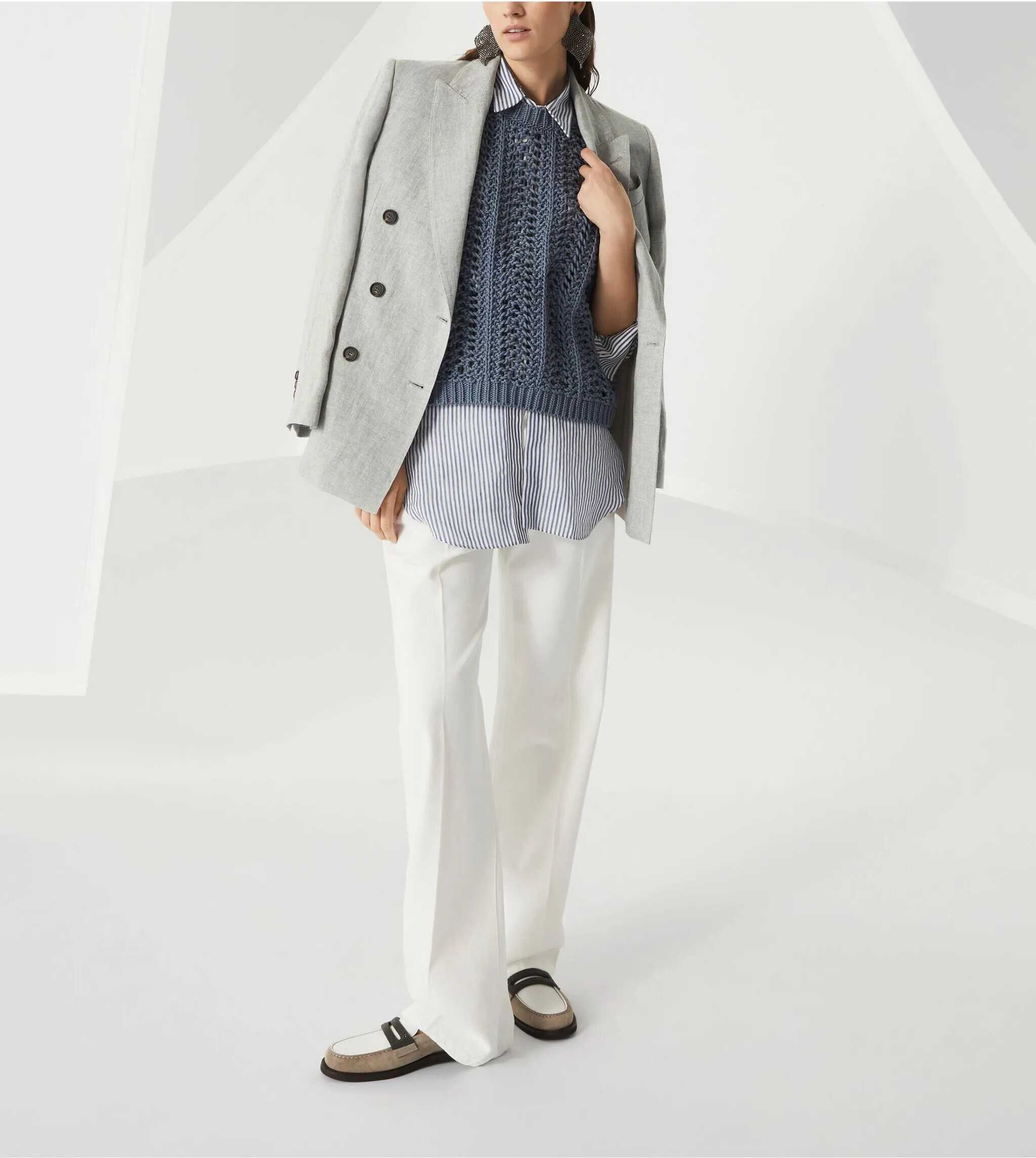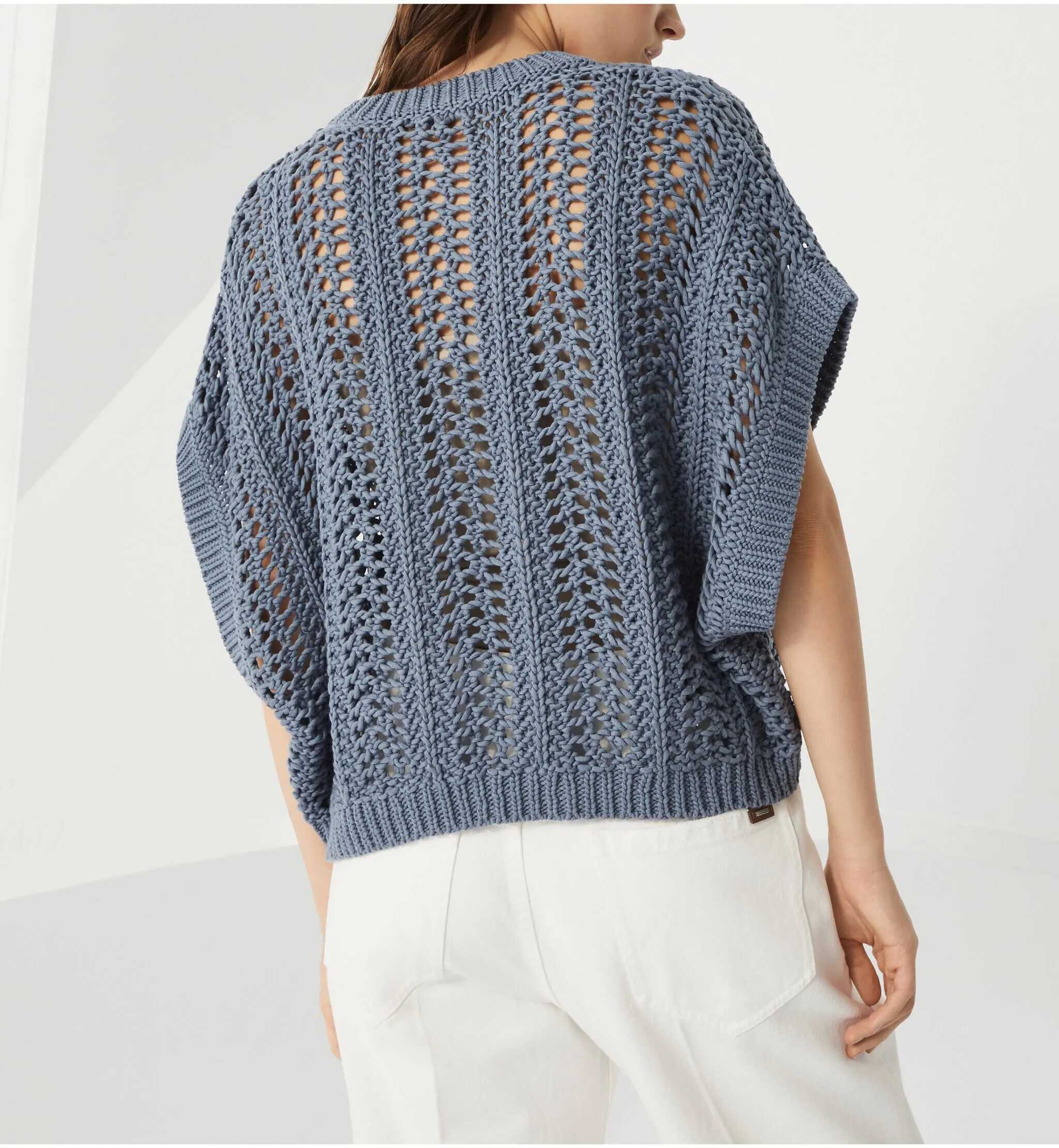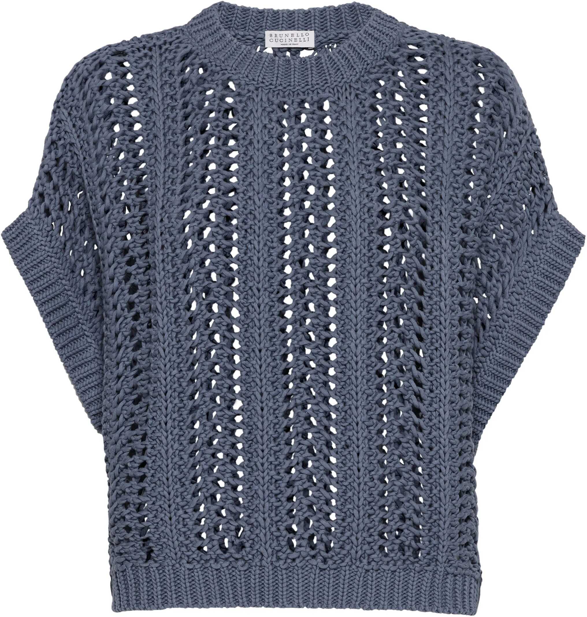 Brunello Cucinelli's cotton Vest features a ribbed crew neck that adds a refined detail to the design. The sweater features a perforated knit design, giving it lightness and a touch of elegance. The ribbed hem completes the garment, ensuring a comfortable and stylish fit. A perfect vest for a sophisticated and modern look, combining comfort and quality.