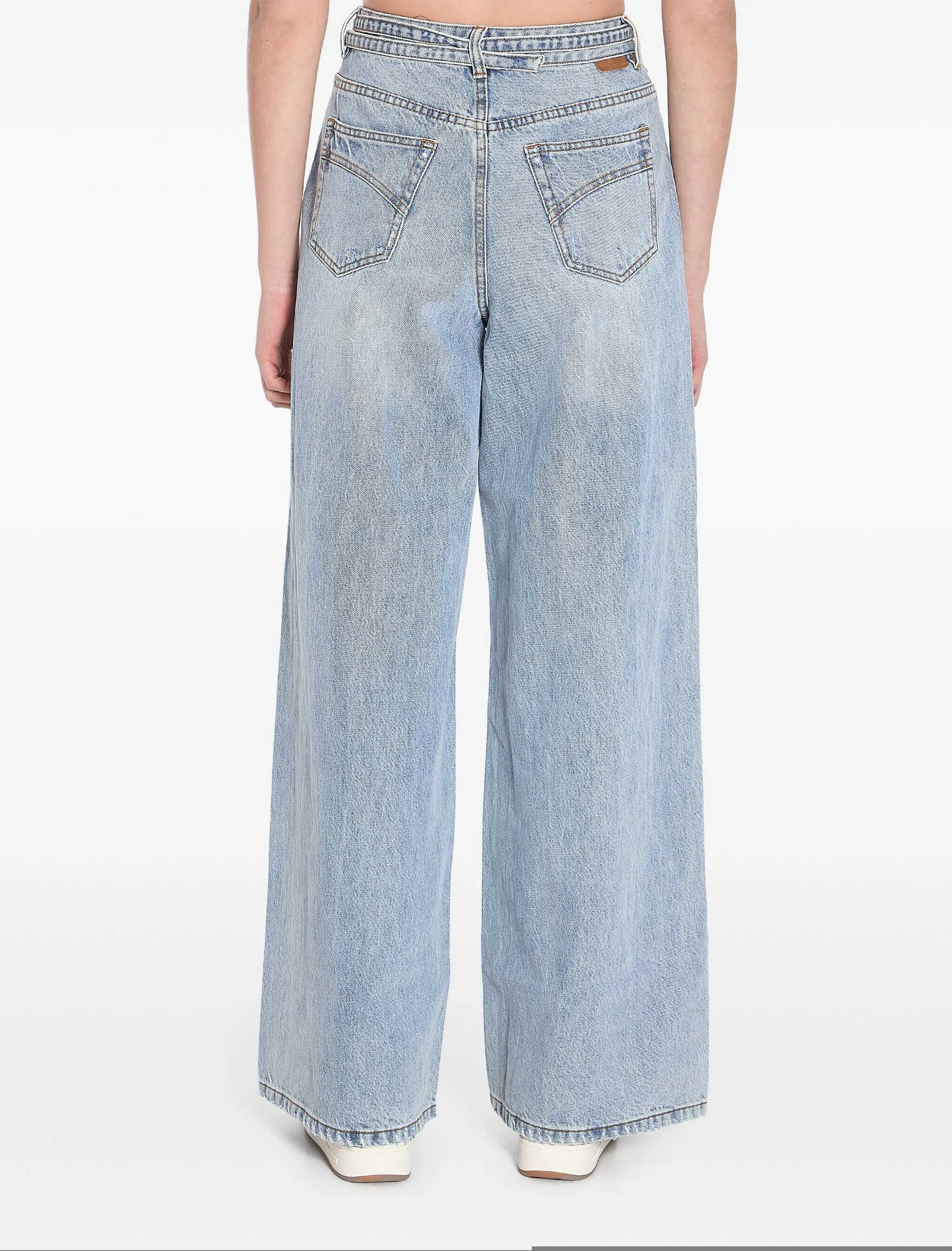 High-waisted Illuminate flare jeans in light blue Sea Foam denim. They feature a button closure with a logo and zip, belt loops, a removable and adjustable belt with a D-ring buckle, five pockets, a straight and wide leg, and a brown logo patch on the back. Comfortable fit.