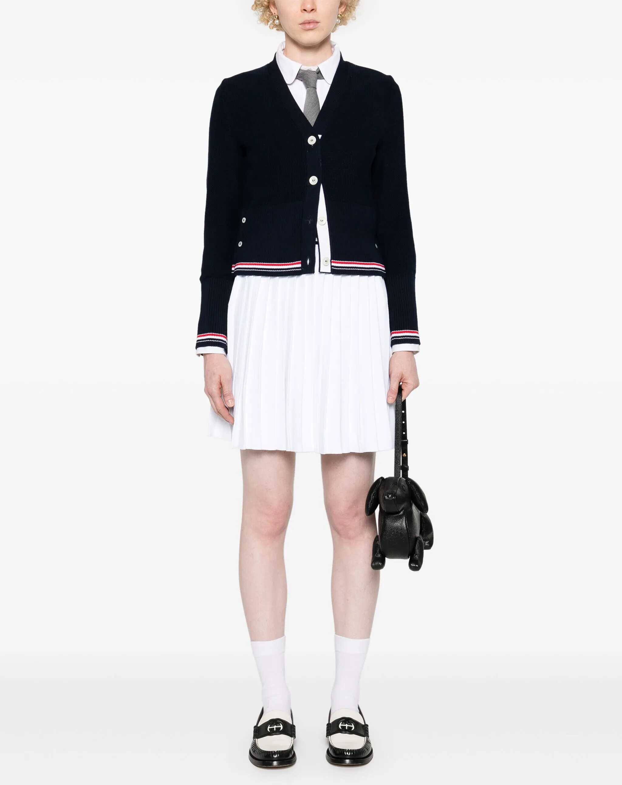 Thom Browne's Pleated Miniskirt is an item that expresses sophistication and dynamism, perfect for those who love contemporary style with a touch of elegance. The elasticated waistband, enhanced by bands in the brand's distinctive colors, adds a recognizable and unique element. The pleated design gives movement to the skirt, creating a fluid and feminine effect. This mini skirt combines the sophistication of the details with the practicality of the cut, proving versatile and suitable for different styles, from casual-chic to more formal outfits, always with a distinctive touch that recalls Thom Browne's unmistakable aesthetic.
