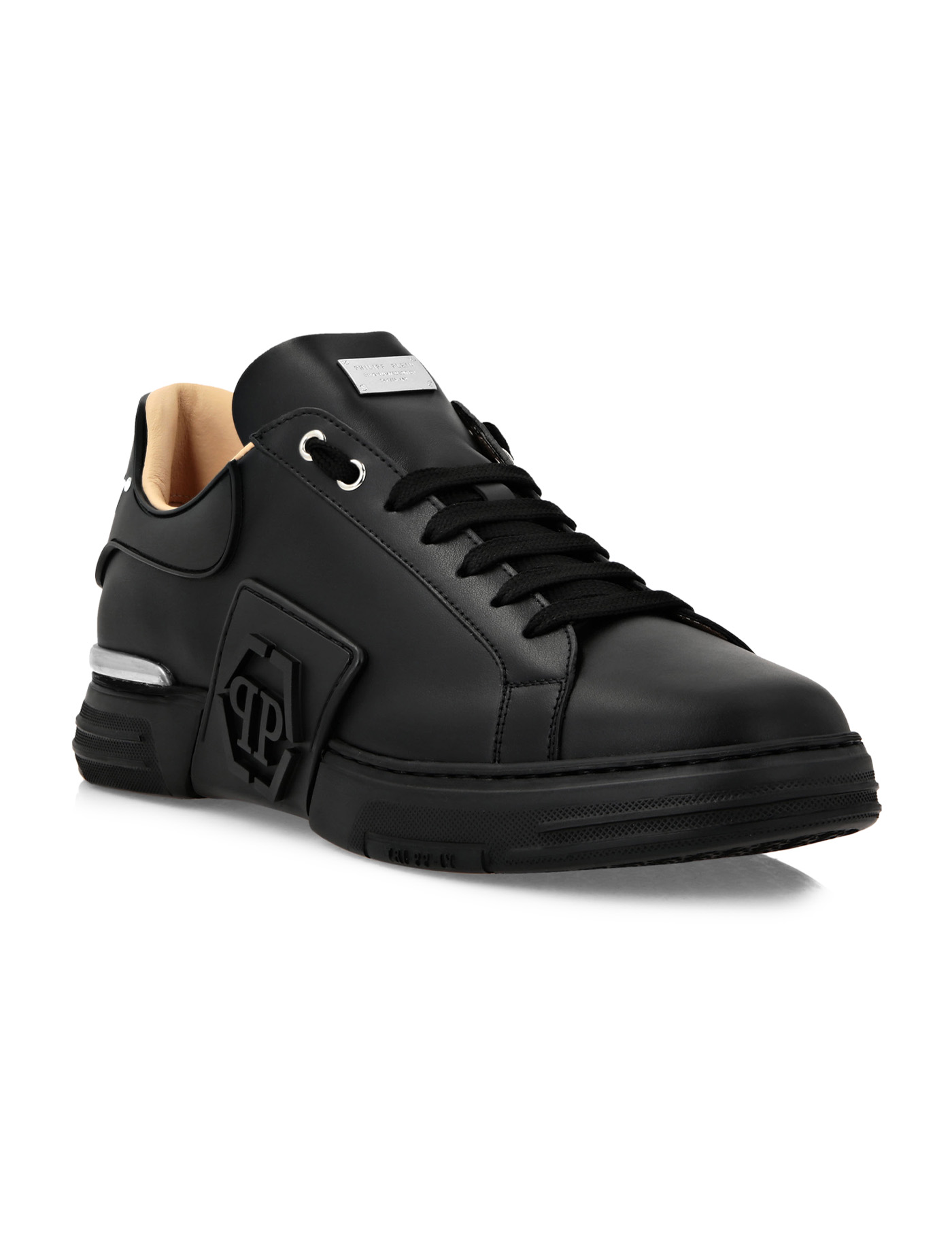 Calfskin Hexagon Sneakers by Philipp Plein, lace-up front fastening, structured sole, round toe, side panels with brand signature and embossed tone-on-tone brand logo, brand signature plaque applied to front metal tongue. brand signature on heel in contrasting embossed pattern.