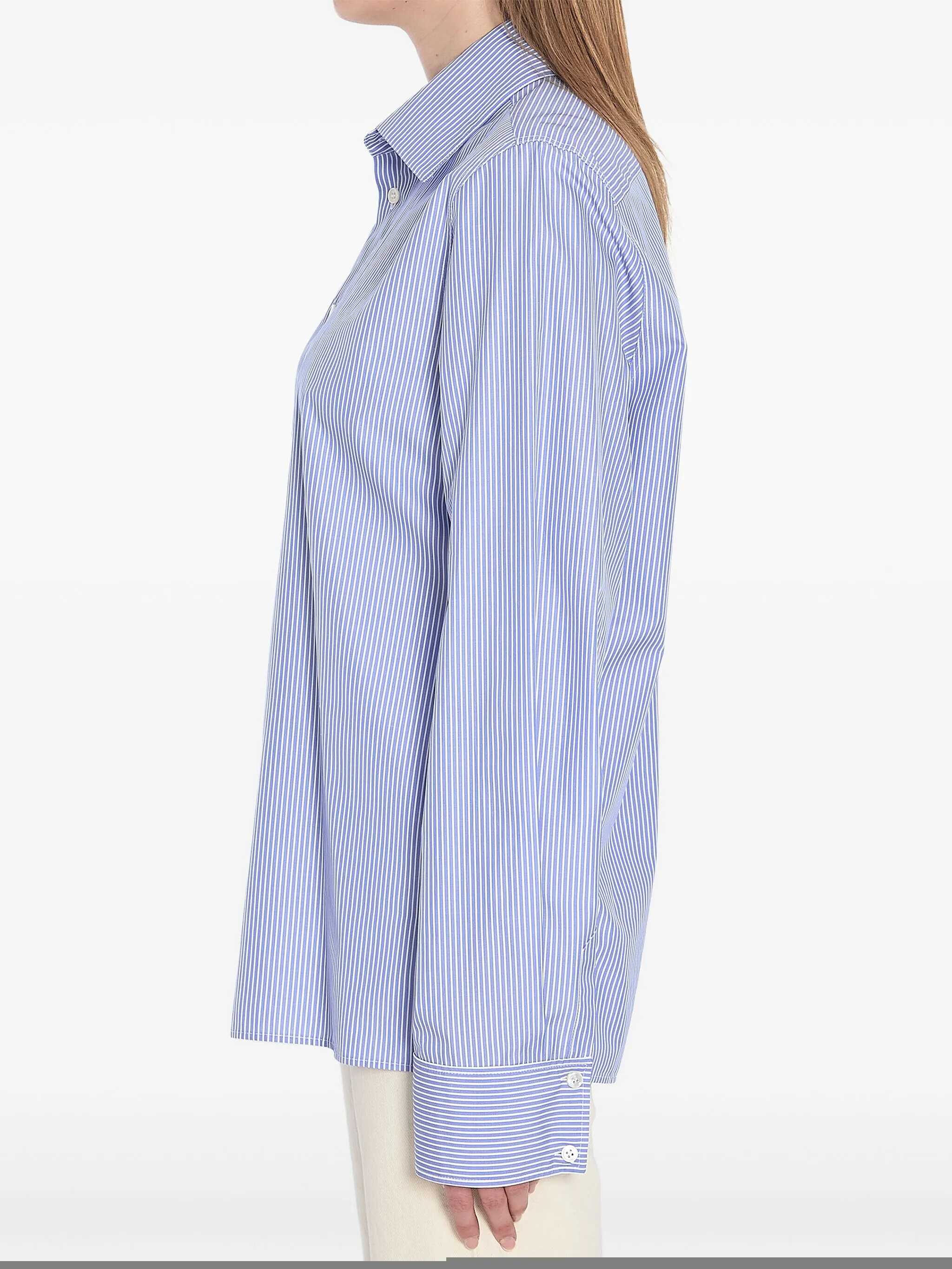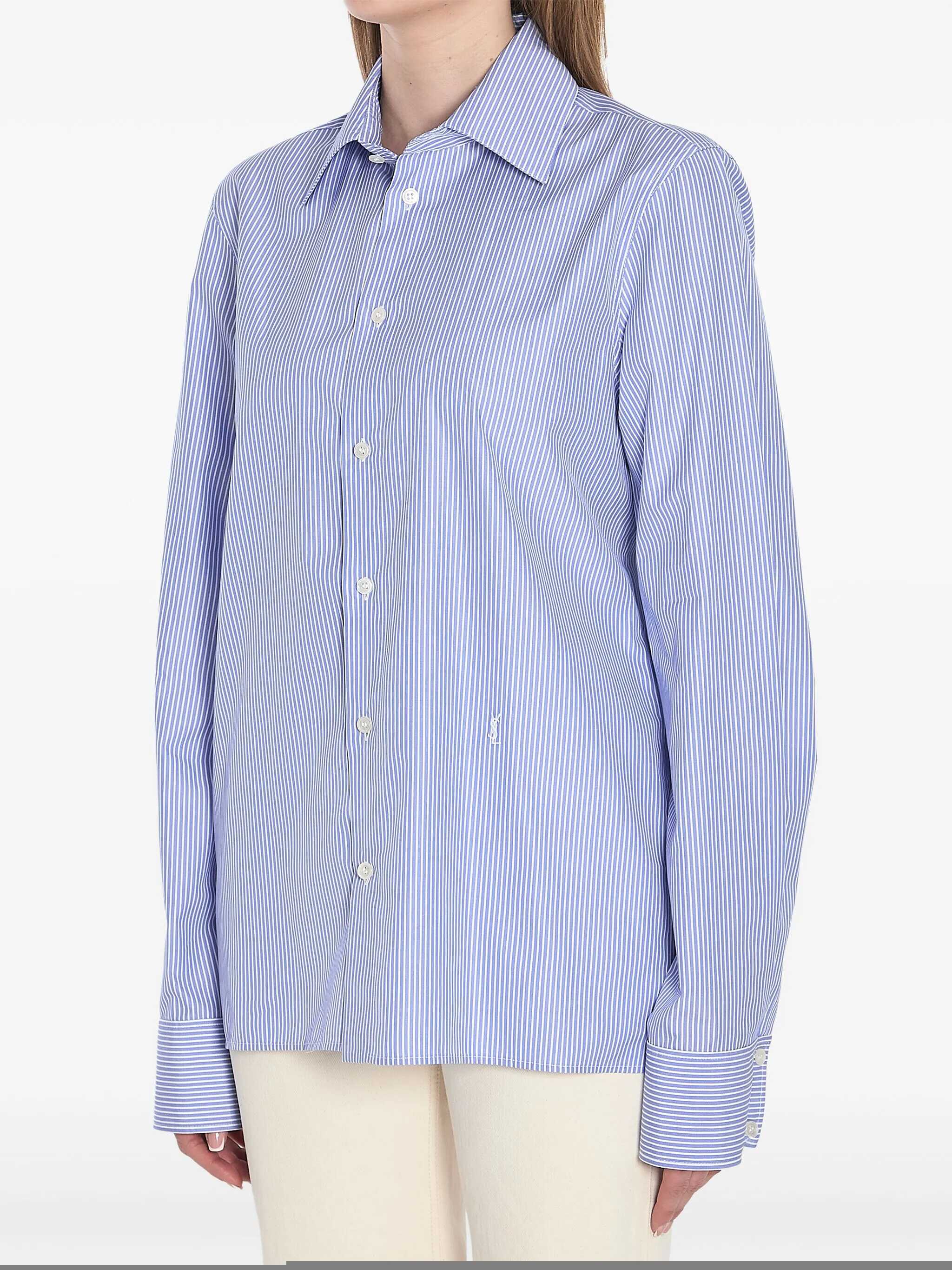 Shirt in blue striped cotton poplin with white stripes. It features a pointed collar, button closure, straight shoulders, white Cassandre embroidery on the front, two-button cuffs, and a straight hem.